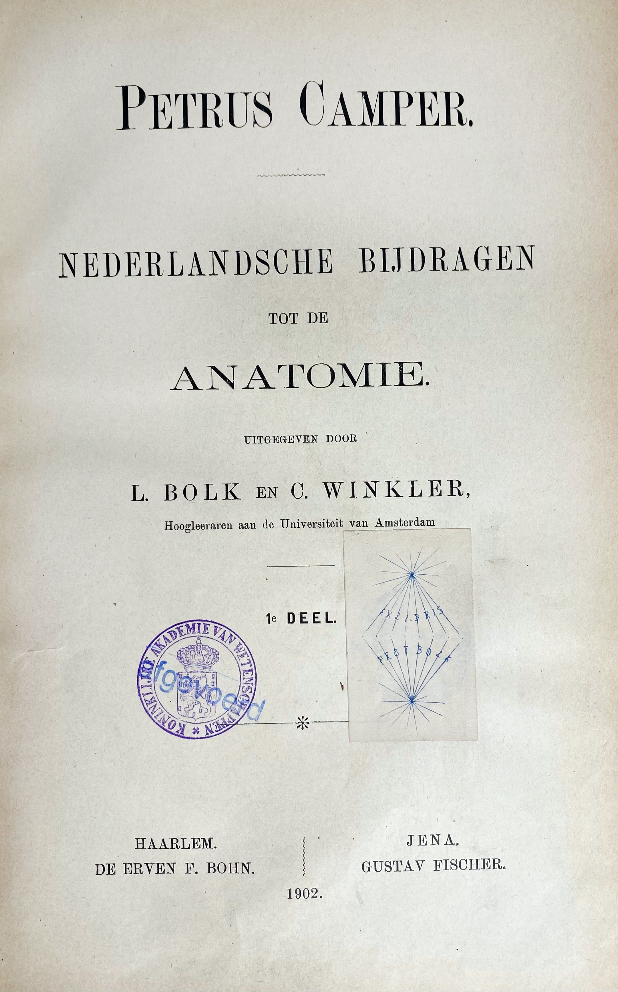 BOLK, L. & C. WINKLER, (eds.). Petrus Camper. Nederlandsche bijdragen tot de anatomie. Haarlem, De Erven F. Bohn, 1902-1907. 4 vols. W. num. plates (some fold./cold.) & num. text-figs. Lge-8°. Cont. hcl. extra. (Labels removed from spine, cancelled stamps on ti-pp., ti-p. vol. 3 lacks).