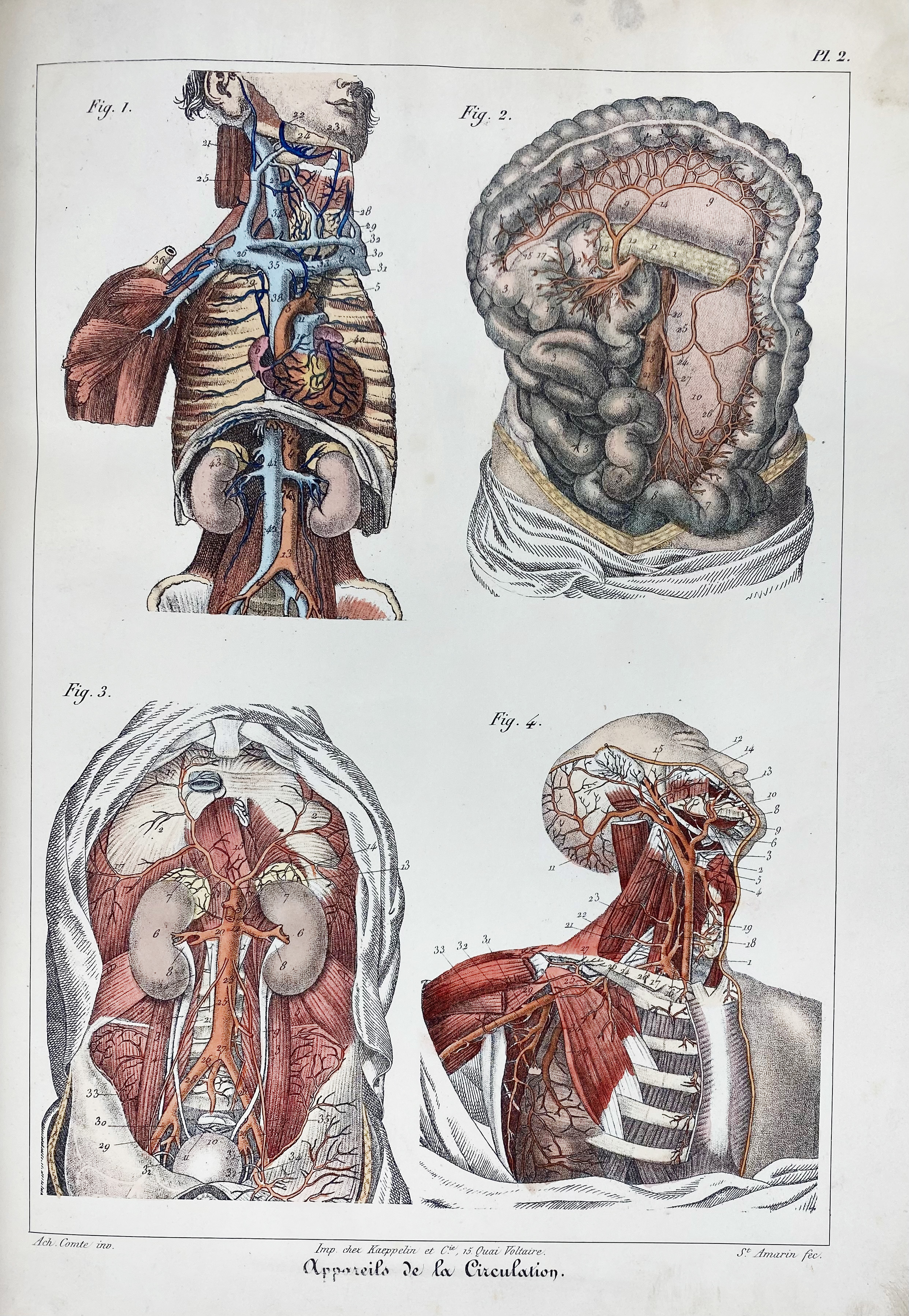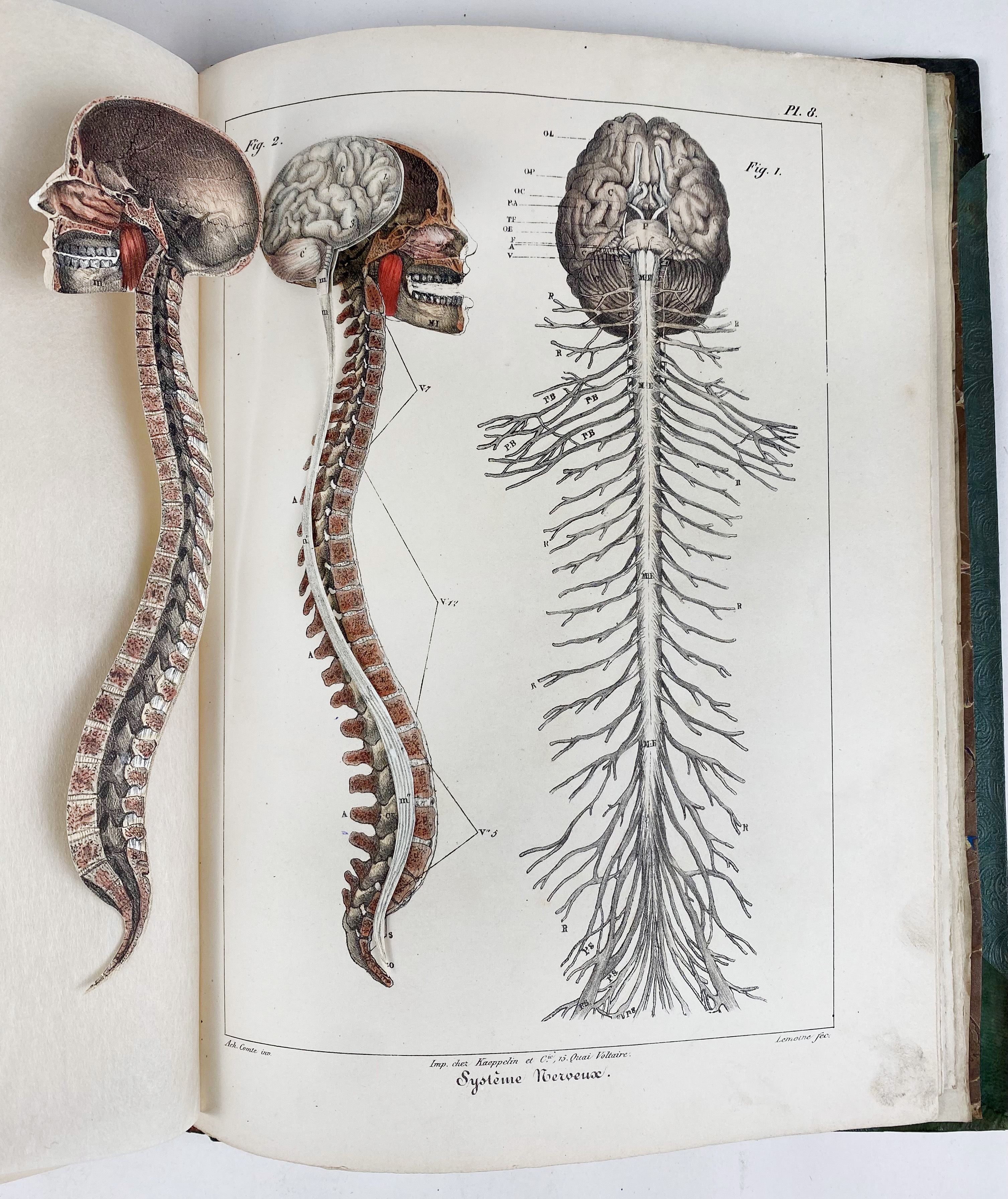 COMTE, A. Organisation et physiologie de l'homme, expliquées, a l'aide de figures coloriées, découpées et superposées. 3e éd. Par., 1841. 1 text-vol.: (8), 168 pp. & 1 plate-vol. w. 16 lithogr. plates, for the greater part cold. and w. moveable parts. 4°. Cont. h. green mor. (Upper joint split at the bottom, upper part waterstained espec. text-vol).