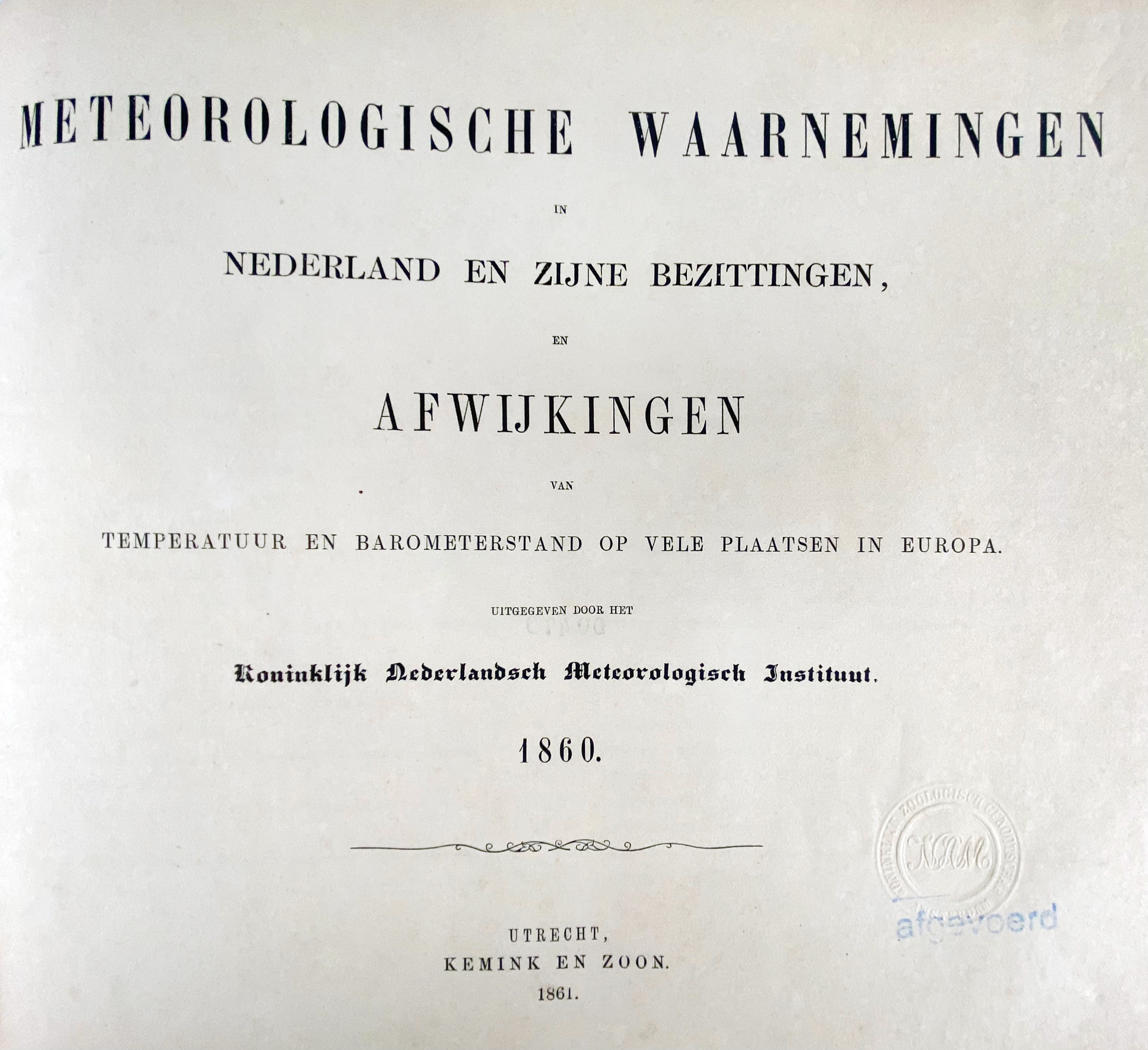 METEOROLOGY -- (KRECKE, F.W.C. & C.H.D. BUYS BALLOT). Meteorologische waarnemingen in Nederland en zijn bezittingen en afwijkingen van temperatuur en barometerstand op vele plaatsen in Europa. Uitgeg. d. het Kon. Ned. Meteorolog. Instituut. 1858 (&) 1860. Utr., Kemink & Zn, 1859-61. 2 vols. of the series in 1 vol. W. num. tables. 4°-obl. Hcl. (Blindstamps on ti-pp.).