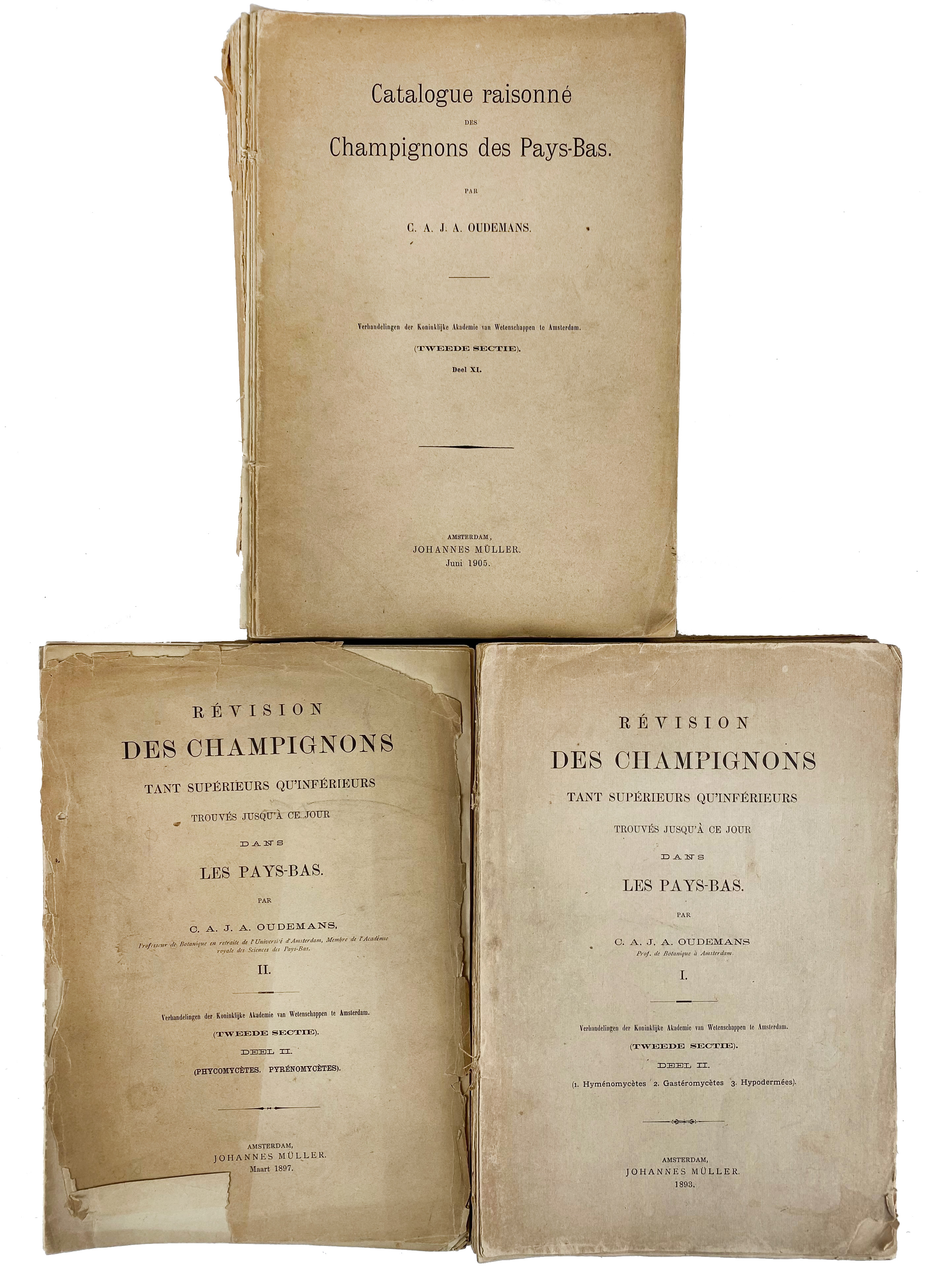 MYCOLOGY -- OUDEMANS, C.A.J.A. Révision des champignons tant supérieurs qu’inférieurs trouvés jusqu’à ce jour dans les Pays-Bas. 2 vols. -- Id. Catalogue raisonné des champignons des Pays-Bas. Amst., J. Müller, 1892-1905. Tog. 3 vols. W. 14 lithogr. plates. Lge-8°. Or. printed wrps. (Wrps. worn/partly dam., spine covers for the greater part gone, loose/loosening, but internally good and clean). - Rare.