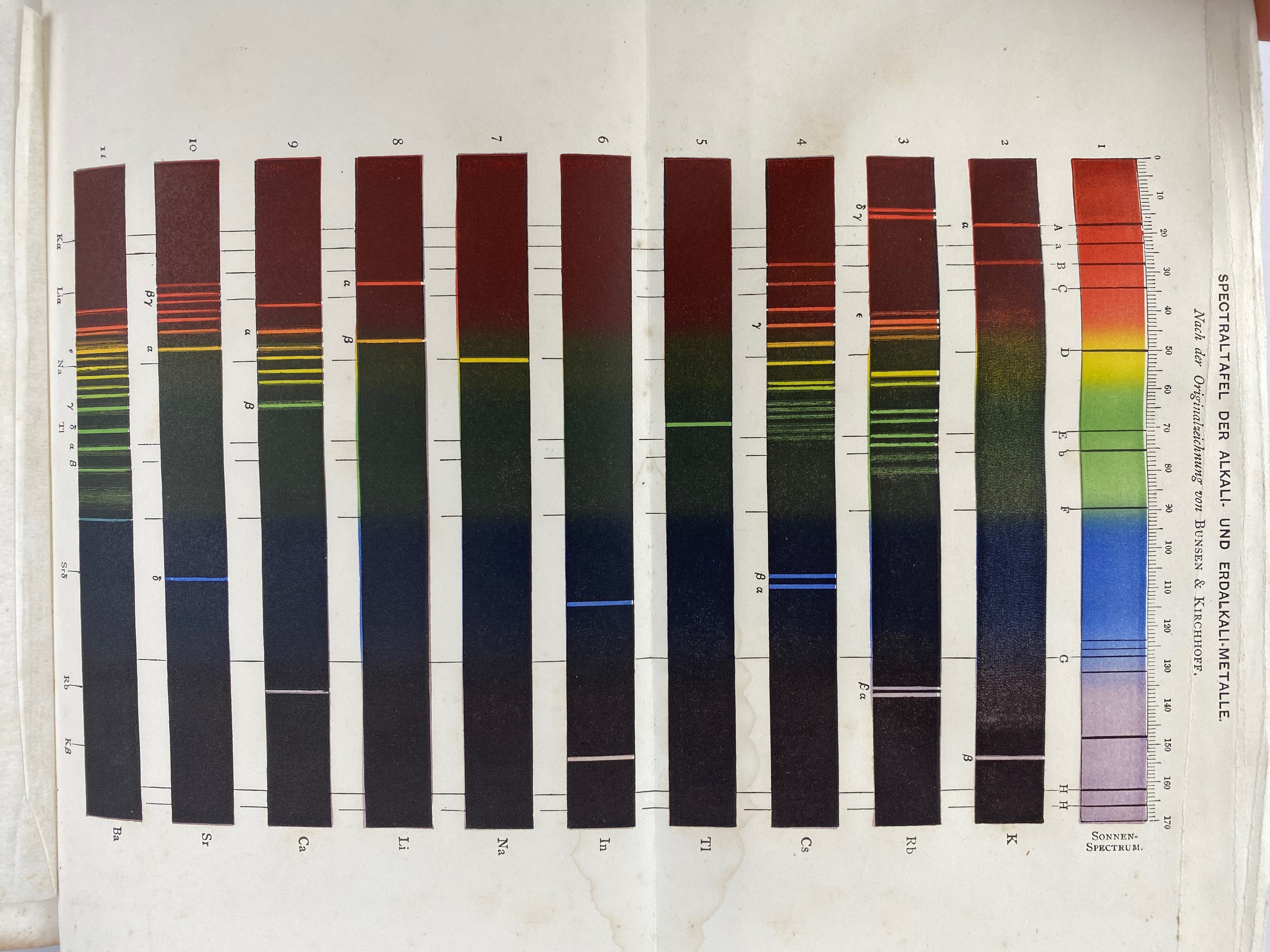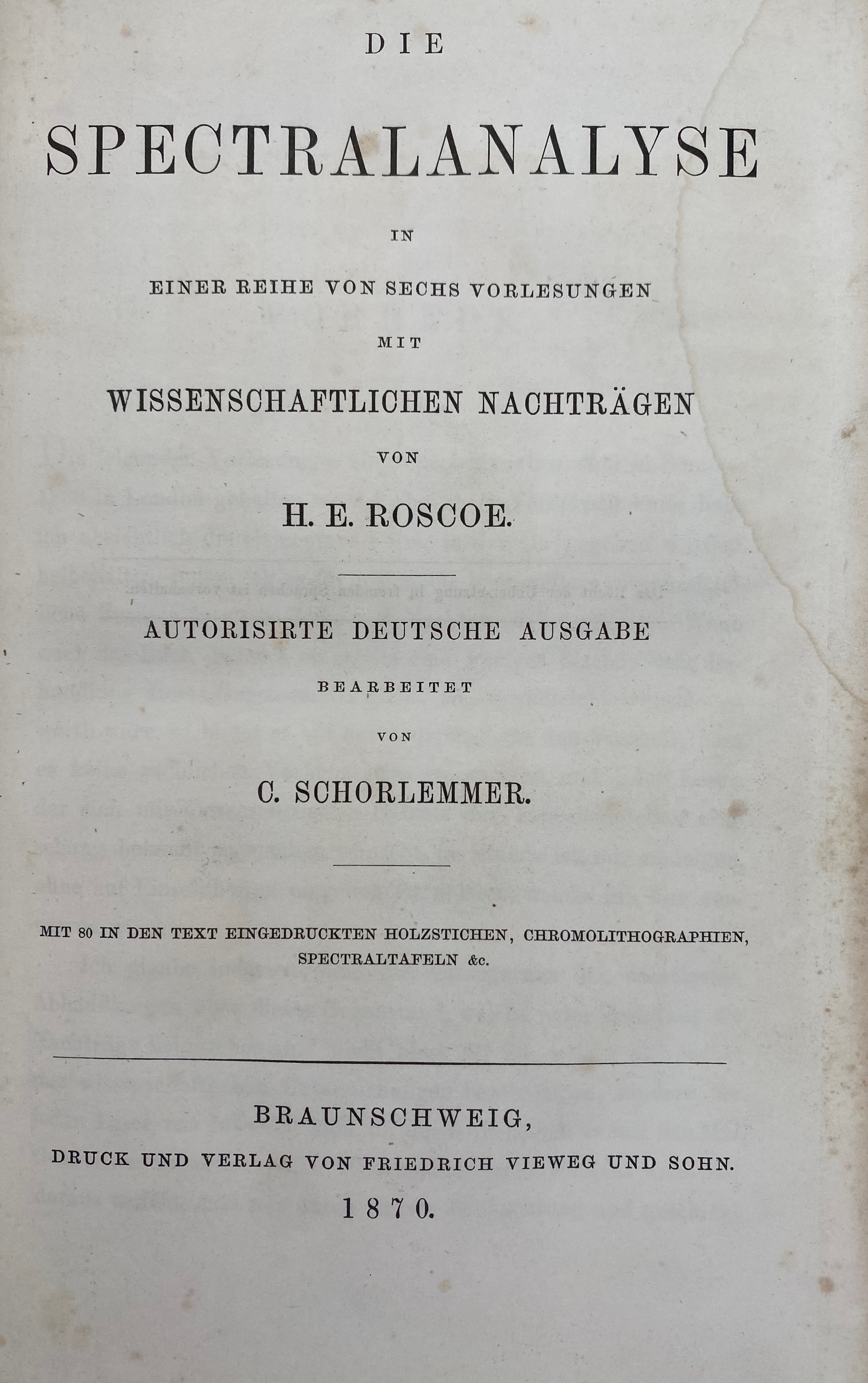 ROSCOE, H.E. Die Spectralanalyse und einer Reihe von sechs Vorlesungen mit wissenschaftlichen Nachträgen. Autorisirte deutsche Ausg. bearb. v. C. Schorlemmer. Braunschweig, 1870. x, 300 pp. W. 8 cold. (fold.) plates & 80 text-ills. Cont. h. mor. w. dec. gilt spine. (Outer margin faintly stained at the beginning).