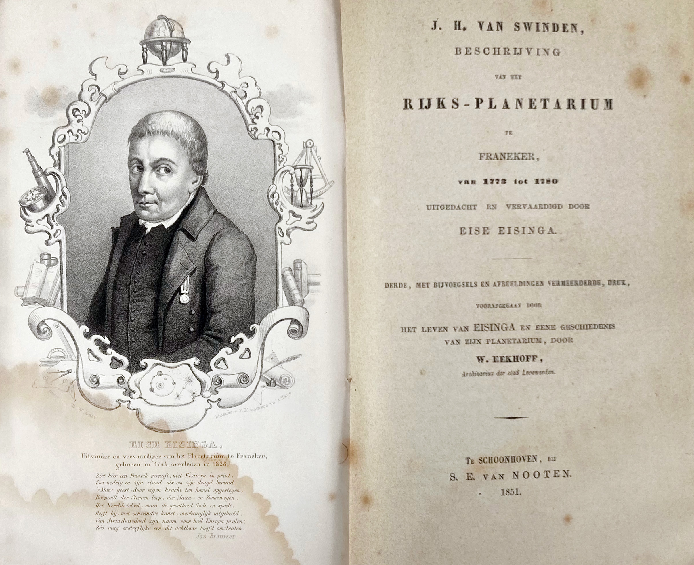 SWINDEN, J.H. v. Beschrijving van het Rijks-Planetarium te Franeker, van 1773 tot 1780 uitgedacht en vervaardigd door Eise Eisinga. 3e, (…) verm. dr., voorafg. door het Leven van Eisinga (…) door W. Eekhoff. Schoonhoven, S. E. v. Nooten, 1851. viii, 164 pp. W. frontispiece portr. & lge-fold., handsomely cold. lithographic plan of the planetarium. Or. limp brds. (Spine delicate, waterstain over title-p. & front., light foxing on the print).