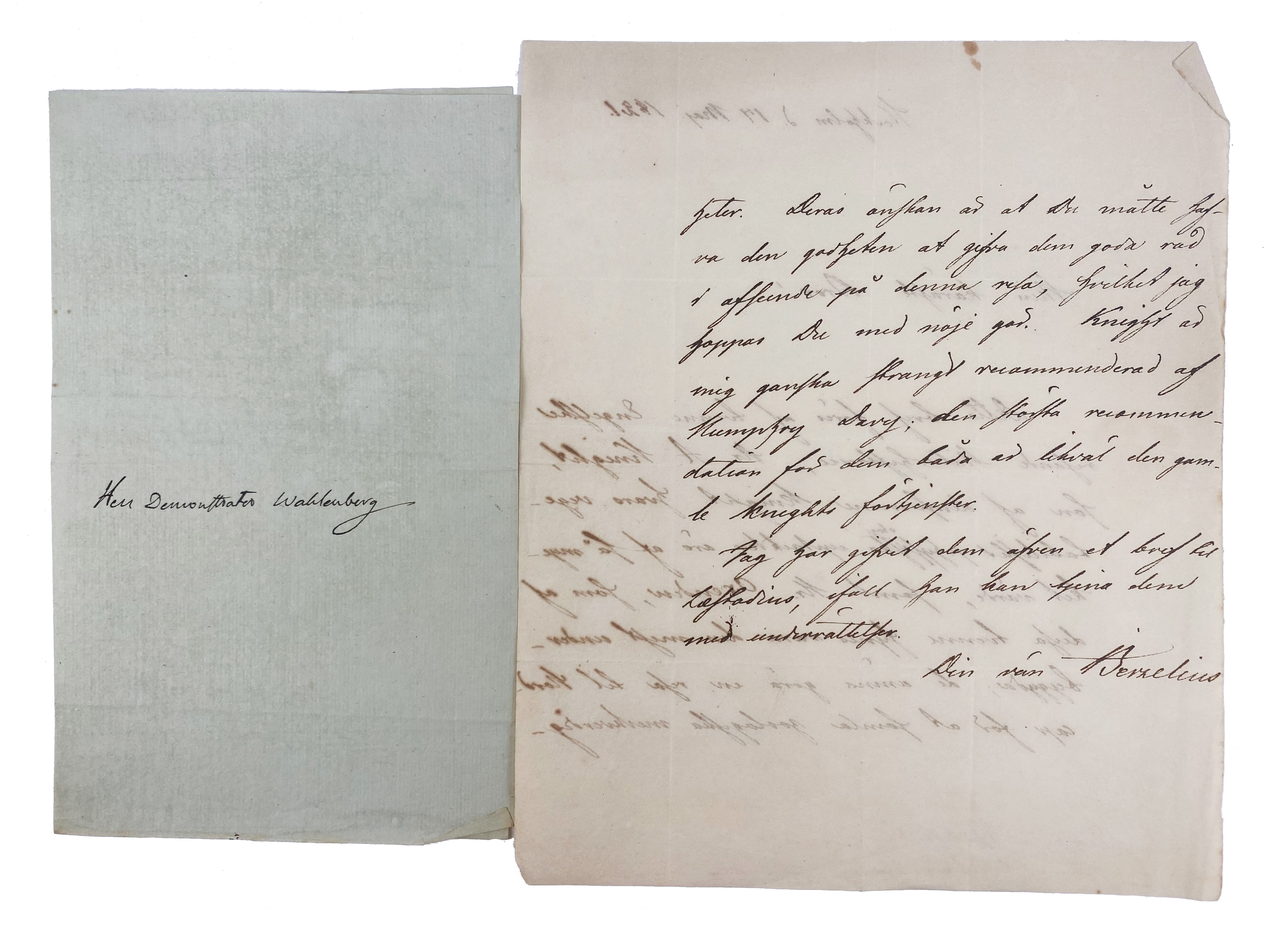 BERZELIUS, Jöns Jacob (1779-1848). Letter in Swedish to 'Min käraste bror' (Göran Wahlenberg (?)). Stockholm, 17 May 1821. 1 leaf r° & v°, signed. -- Carl Adolph AGARDH (1785-1859). Letter in Swedish to Göran Wahlenberg. Lund, 6? Nov. 1825 (?). 1 fold. leaf, signed. -- (2).