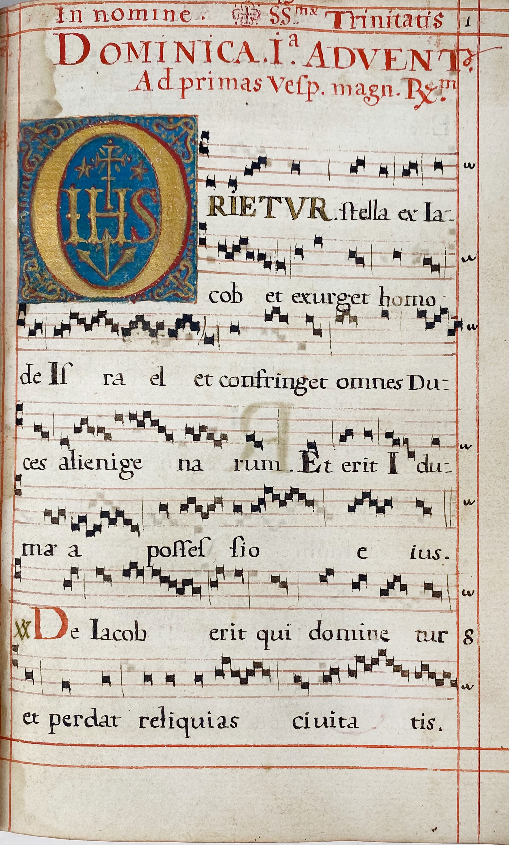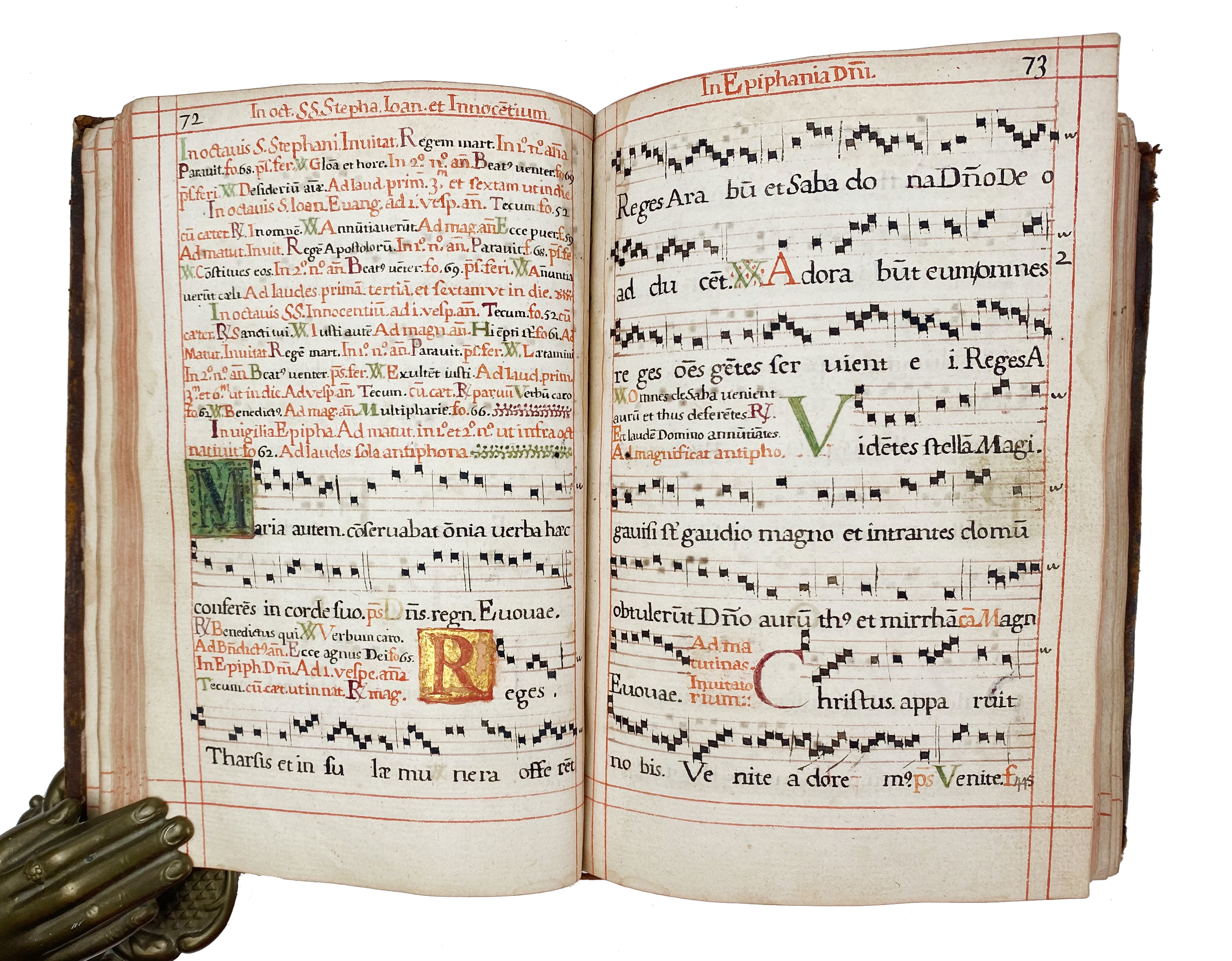 BREVIARY/MISSAL, Cistercian use. France, Valbonne (?), 17th-18th c. Latin manuscript on paper. (14) pp. (calendar) & 474 numb. pp. (chant). Written in red and brown ink, with square Gregorian notation on a four-line staff, w. dec. initials in red, blue, green, some heightened w. gold. Old cf. (Bind. severely chafed, stamp on free endpaper, inner margin stained throughout, some scribbling on last page).
