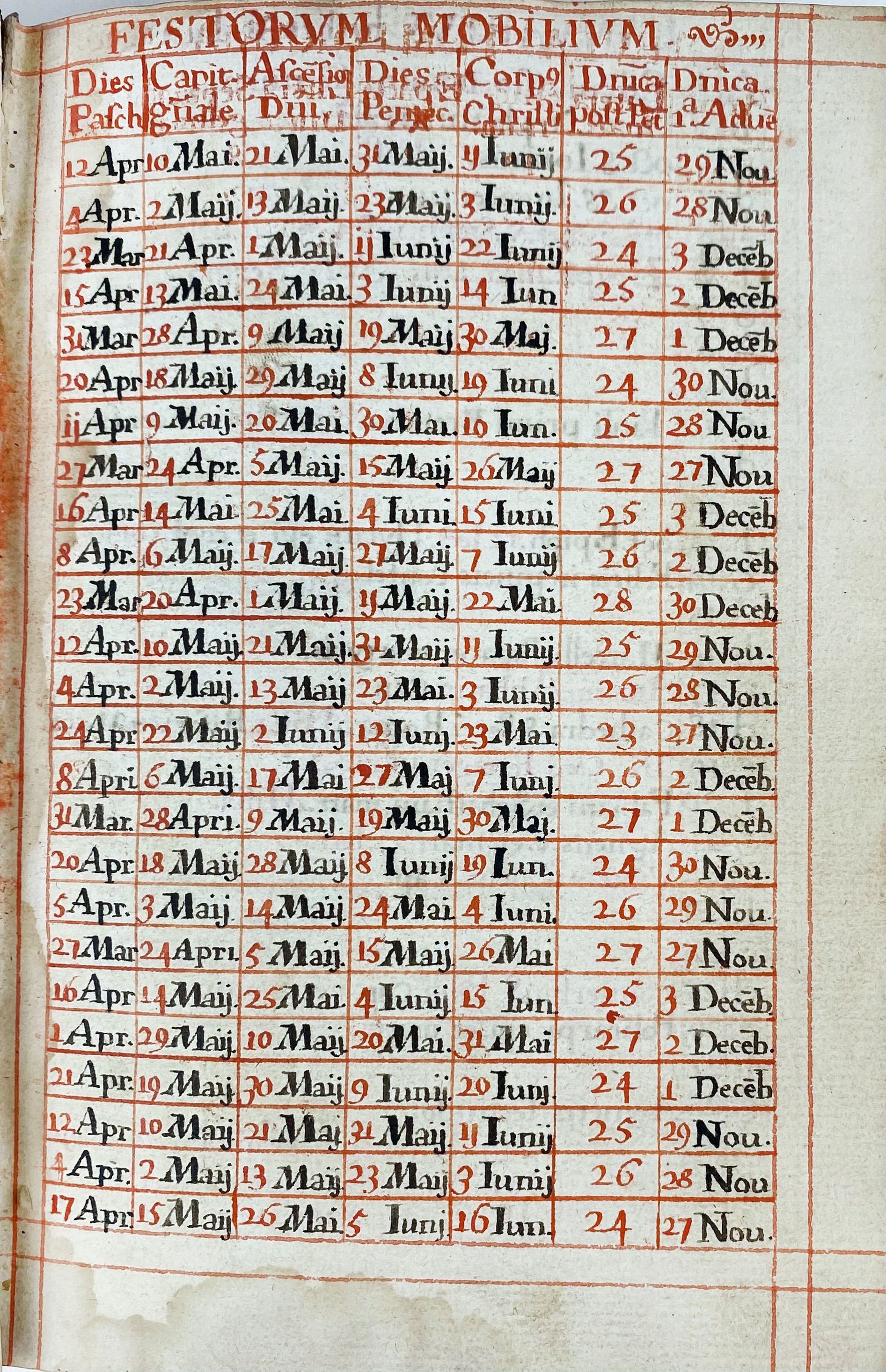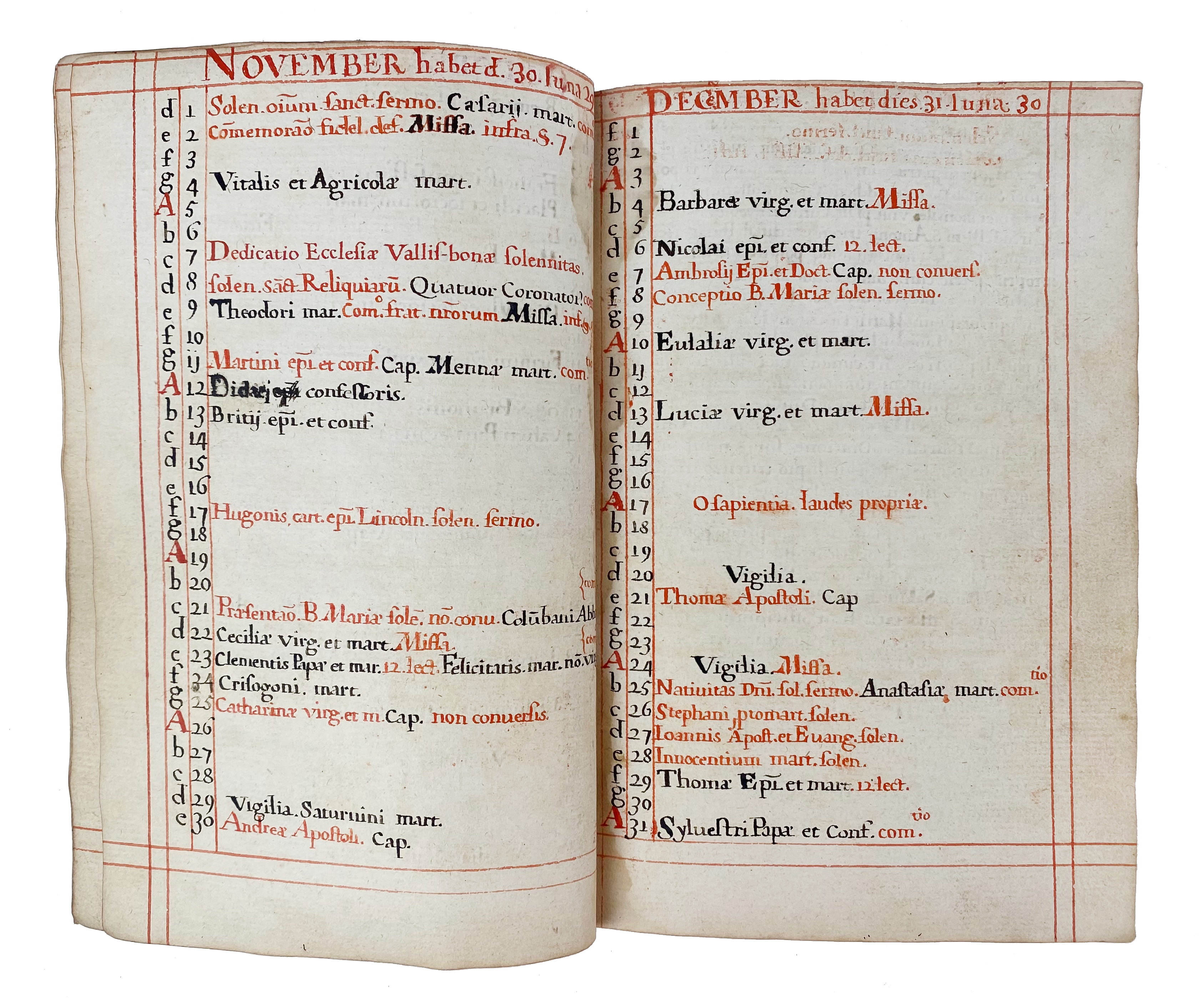 The first 14 pages contain a full liturgical calendar with moveable feasts and sanctoral cycle. Includes universal Roman feasts as well as local celebrations. Of particular note is 7 November: "Dedicatio Ecclesiae Vallis-bona solennitas", commemorationg the dedication of the abbey church of Valbonne (Provence), which places this manuscript in that milieu.