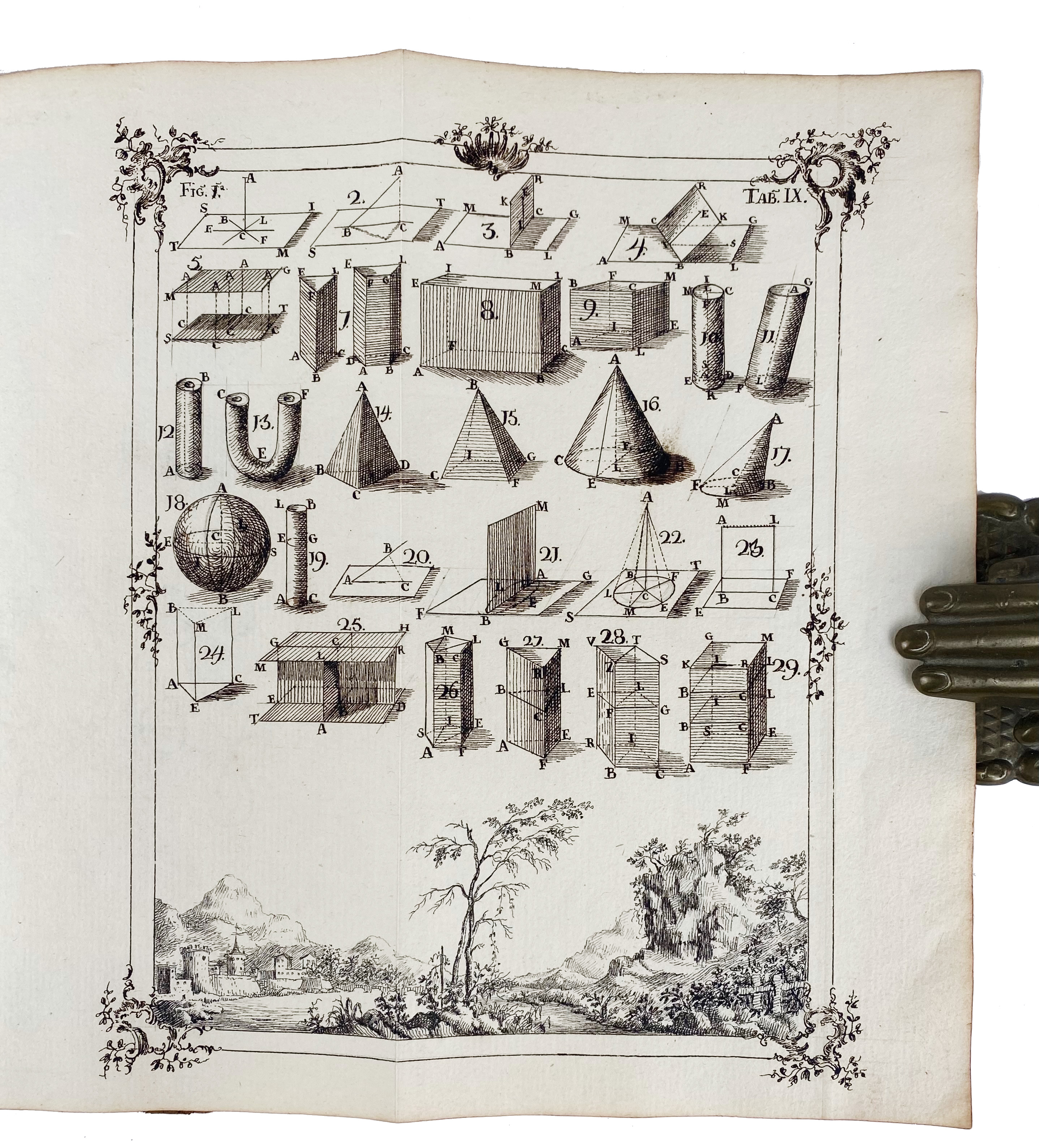 "ELEMENTA GEOMETRIÆ. Elementorum geometriæ liber primus doctrina proportionum et progressionum tum arithmethicarum tum geometricarum". (18th c.). Latin manuscript on paper. 93 lvs. (incl. 4 blanks). W. calligraphic title-page within an elaborate ornamental border and an allegorical scene, section title also within ornamental border, executed in pen and ink, text written in a neat and uniform hand with numerous beautiful executed allegorical vignettes, all executed in pen and ink. 4°. Cont. mottled cf. w. raised bands, dec. gilt spine, brown letterpiece, all edges red, marbled endpapers. (Spine a bit dam., corners worn, bind. chafed/rubbed).