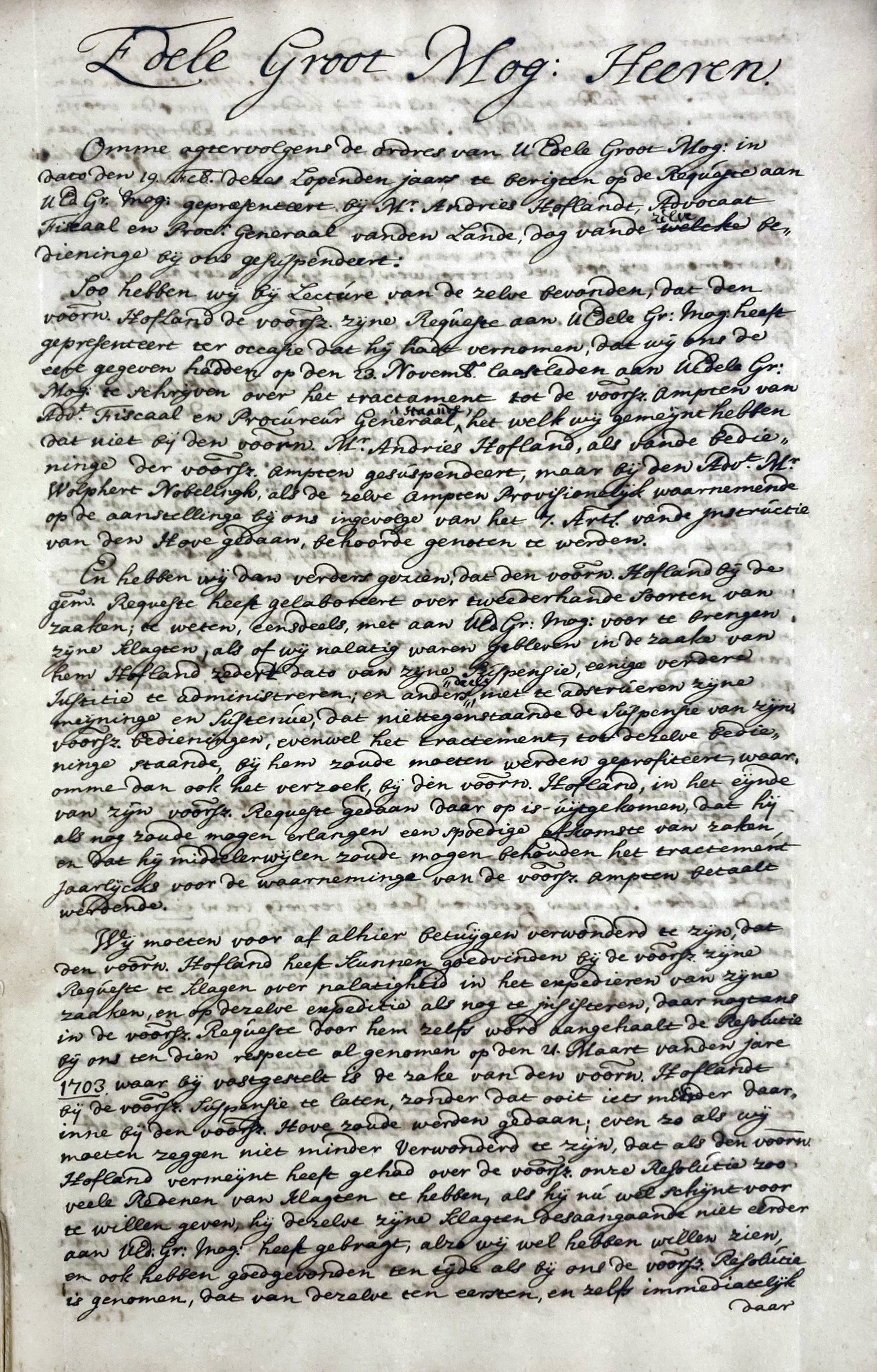 "EXTRACT UIJT DE RESOLUTIE vande Heeren Staten van Hollandt ende Westvrieslant in haar Ed. Gr. Mog. vergaderinge genomen op vrijdag den xxvi Novemb. 1700" - "NOTA. Mr. Andries Hofland heeft kort daarna afstand gedaan (…). 1707" - "EDELE GROOT MOG. HEEREN (…) 13 April 1707" - 3 mss. on paper, connected w. a thread, r° and v°. (8) lvs. Fol.