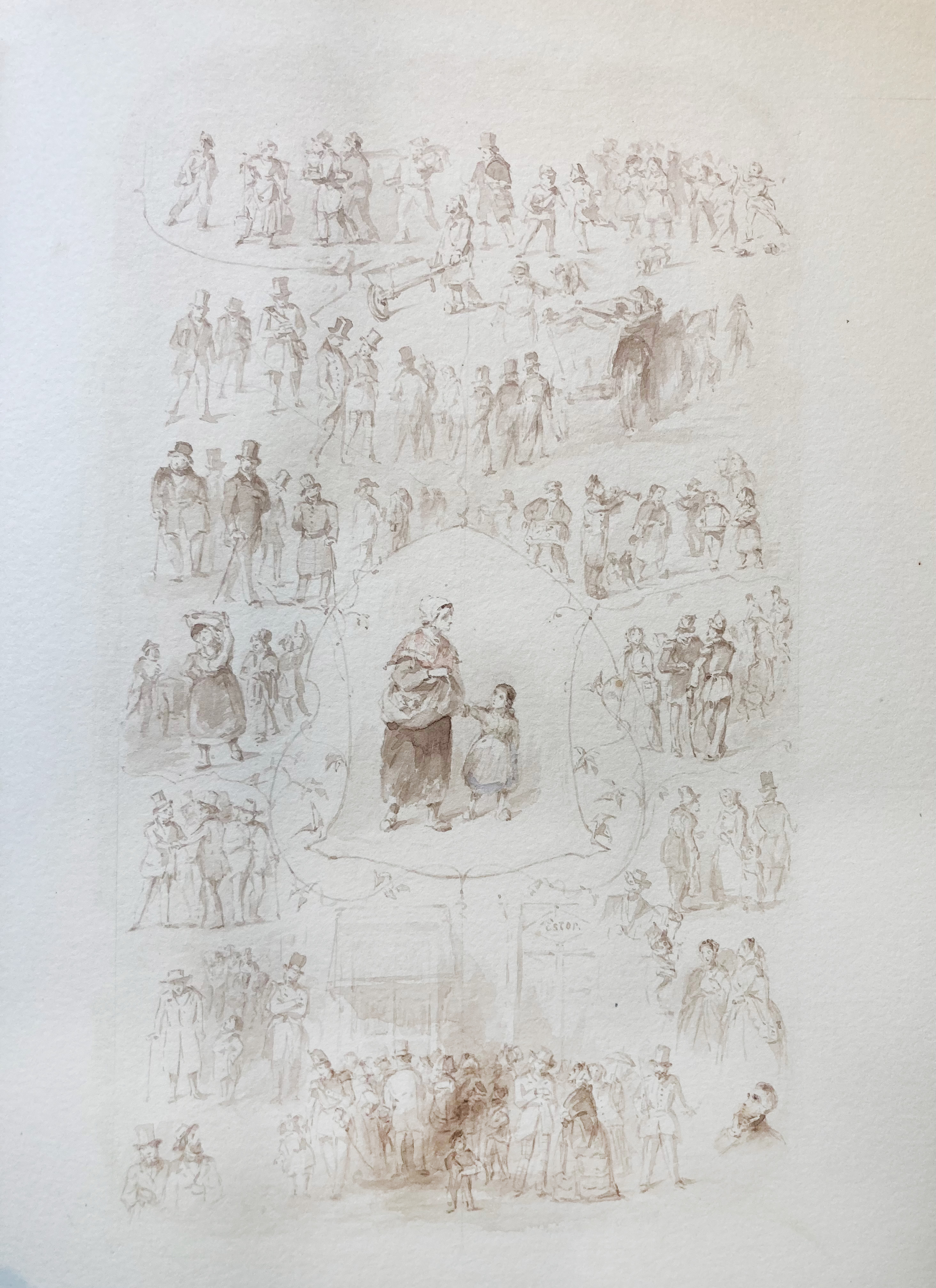 's-GRAVENHAGE -- GAADE, F.J., (e.a.). Langs heeren straten. October 1857. (10), 47 letterpress pp., all within a unique cold. decorative border. W. 5 full-p. water coulour drawings by Johannes Christiaan d'Arnoud Gerkens, incl. the ti.-p. 4°. Cont. blind tooled and gilt dec. cl., a.e.g. (Spine a bit dam./split in places, but still present).