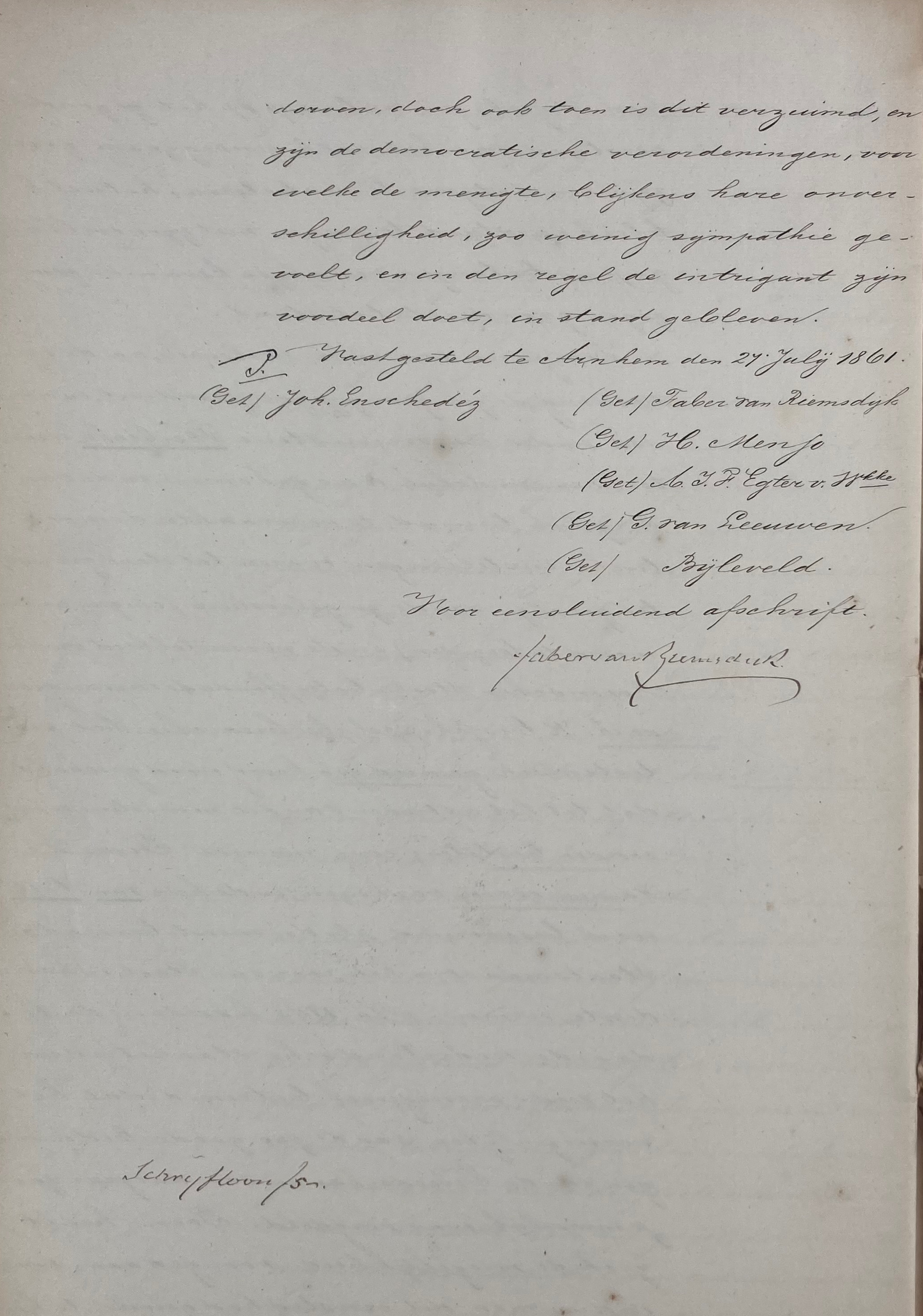 "HERINNERING aan het bedrijf der Tweede Kamer van de Staten-generaal der Nederlanden van 1842 tot 1848". Arnhem, 27 July 1861. (34) lvs. Ms. on paper, r° and v°, signed at end 'for a true copy' w. the signature of Faber v. Riemsdijk. Fol. Wrps.