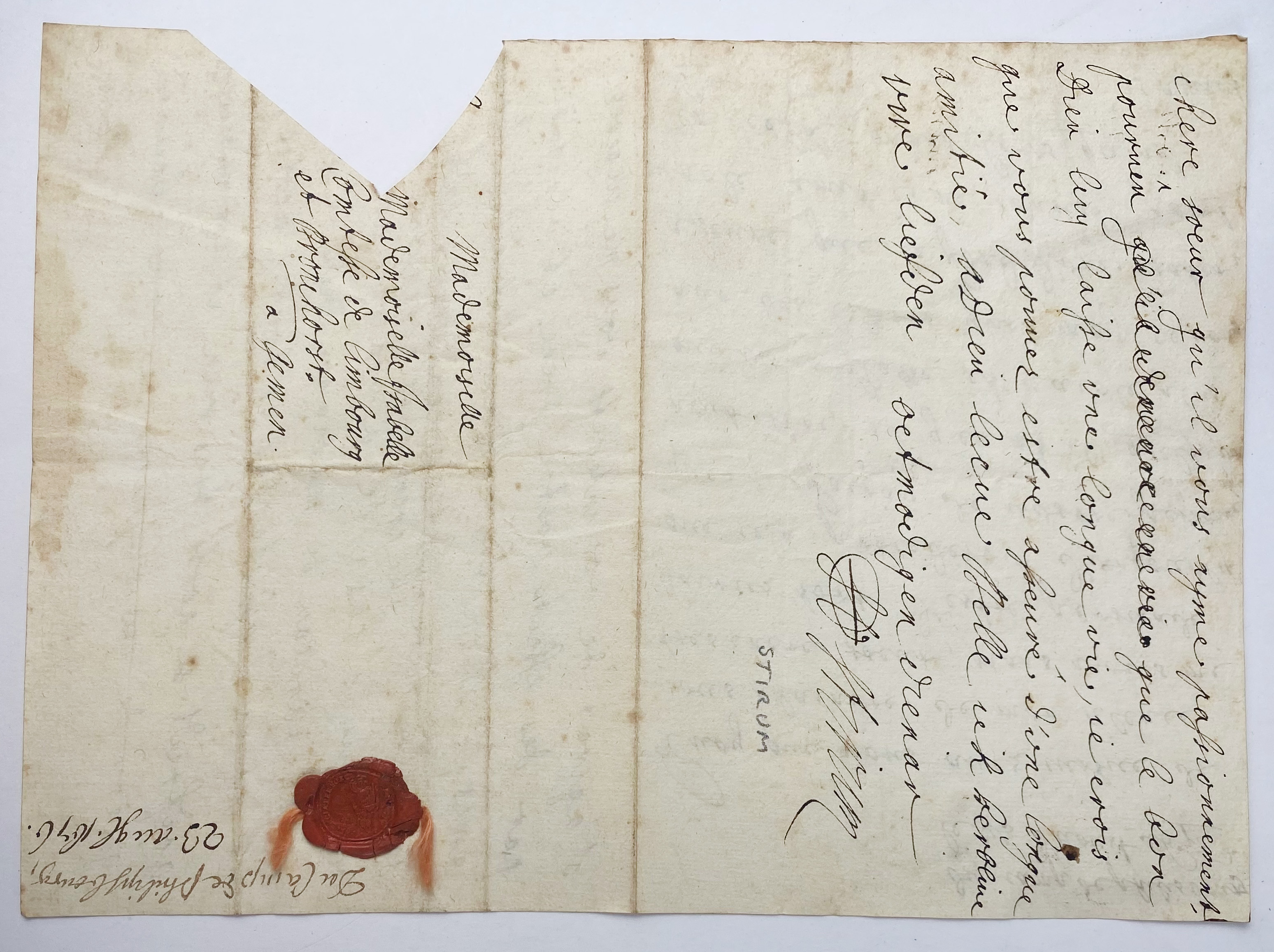 LIMBURG STIRUM, Herman Otto II van (1646-1704). Letter in French to his younger sister Anna Isabella. Camp du Philipsbourg, 23 Aug. 1676. 1 fold. leaf, written on r° & v°, signed "Stirum". W. wax seal. (Triangle-shaped paper cut-out affecting sev. words of text).