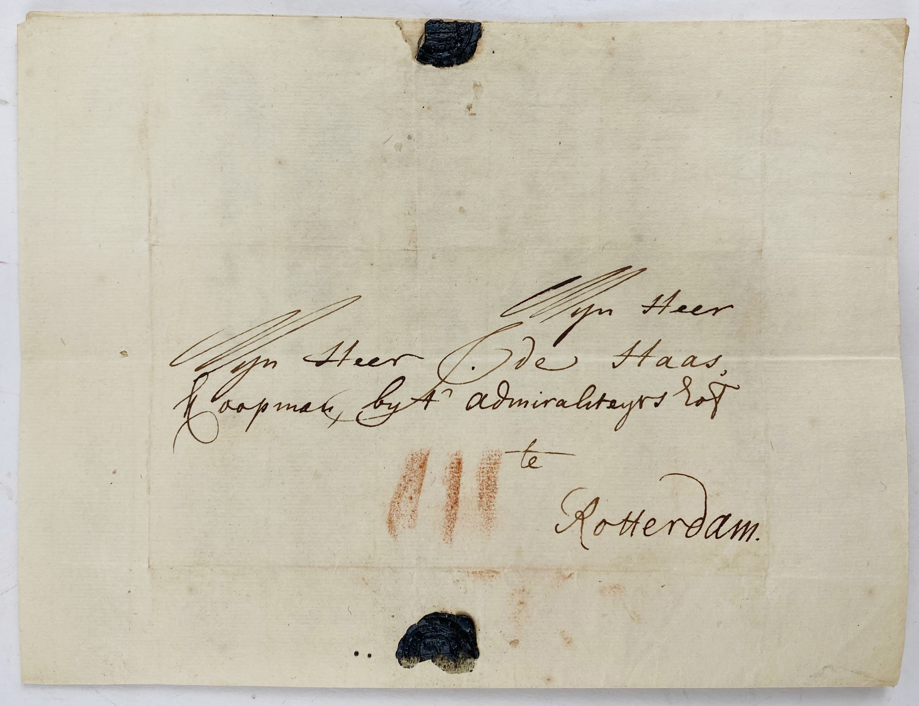 RELAND, Adriaan (1676-1718). Letter in Dutch to "J. de Haas, koopman by t' admiraliteytshof te Rotterdam". Utr., 4 maart 1714. 1 fold. leaf, r° only and address outside, signed. W. black wax seal. -- Jan Jacob SCHULTENS (1716-1788). Letter in Dutch to a friend. Leiden, 4 april 1769. 1 fold. leaf, r° & v°, signed. -- (2).