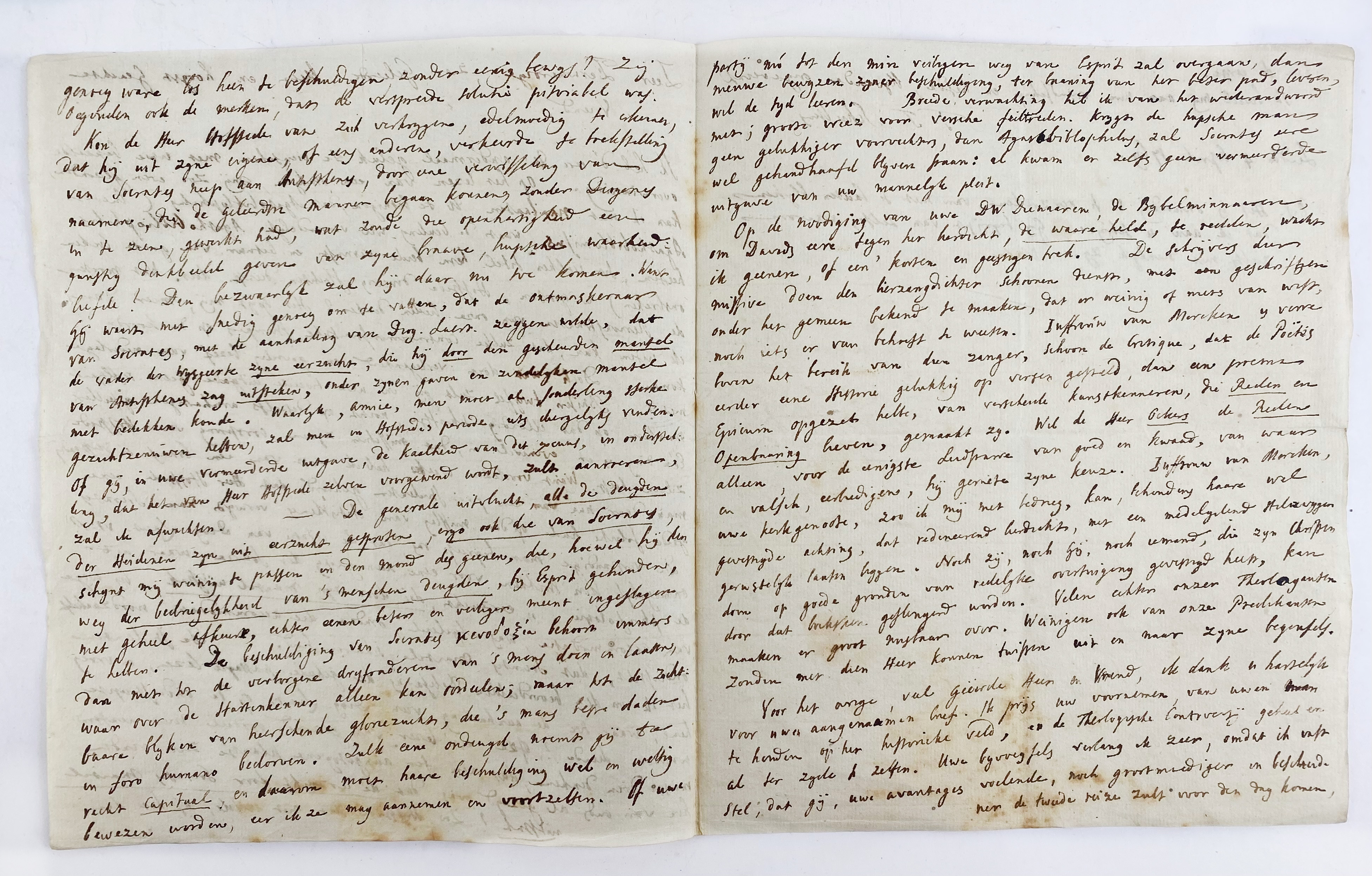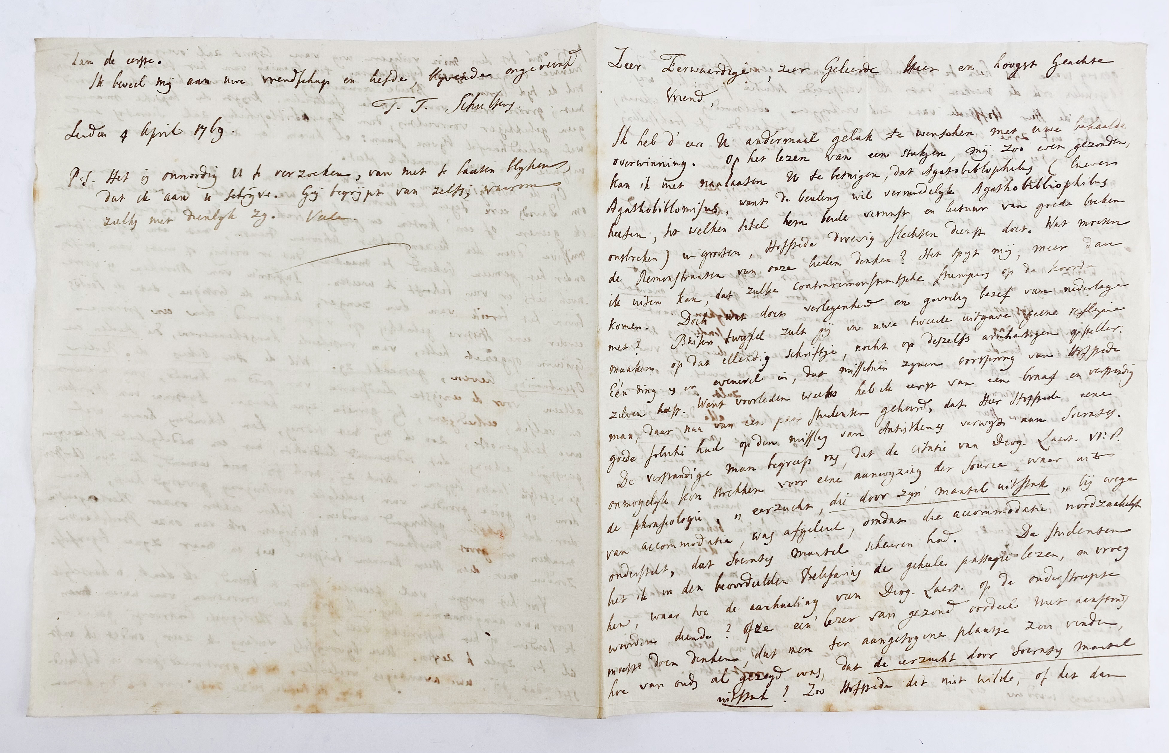 Ad 1: In this letter the Dutch Orientalist Reland tells merchant J. de Haas that a printing error in a quarto sheet must be fully reprinted, not corrected in part. He warns that leaving it as it is would harm their reputation. In a postcript, he adds he will check the Hebrew version of the word. Ad 2: A reflective and philosophical letter by the Leiden Orientalist J.J. Schultens, discussing theological interpretation, scholarly disagreement (possibly involving Hottinger), and the nature of truth and judgment in religious scholarship. Addressee unknown.€ 120