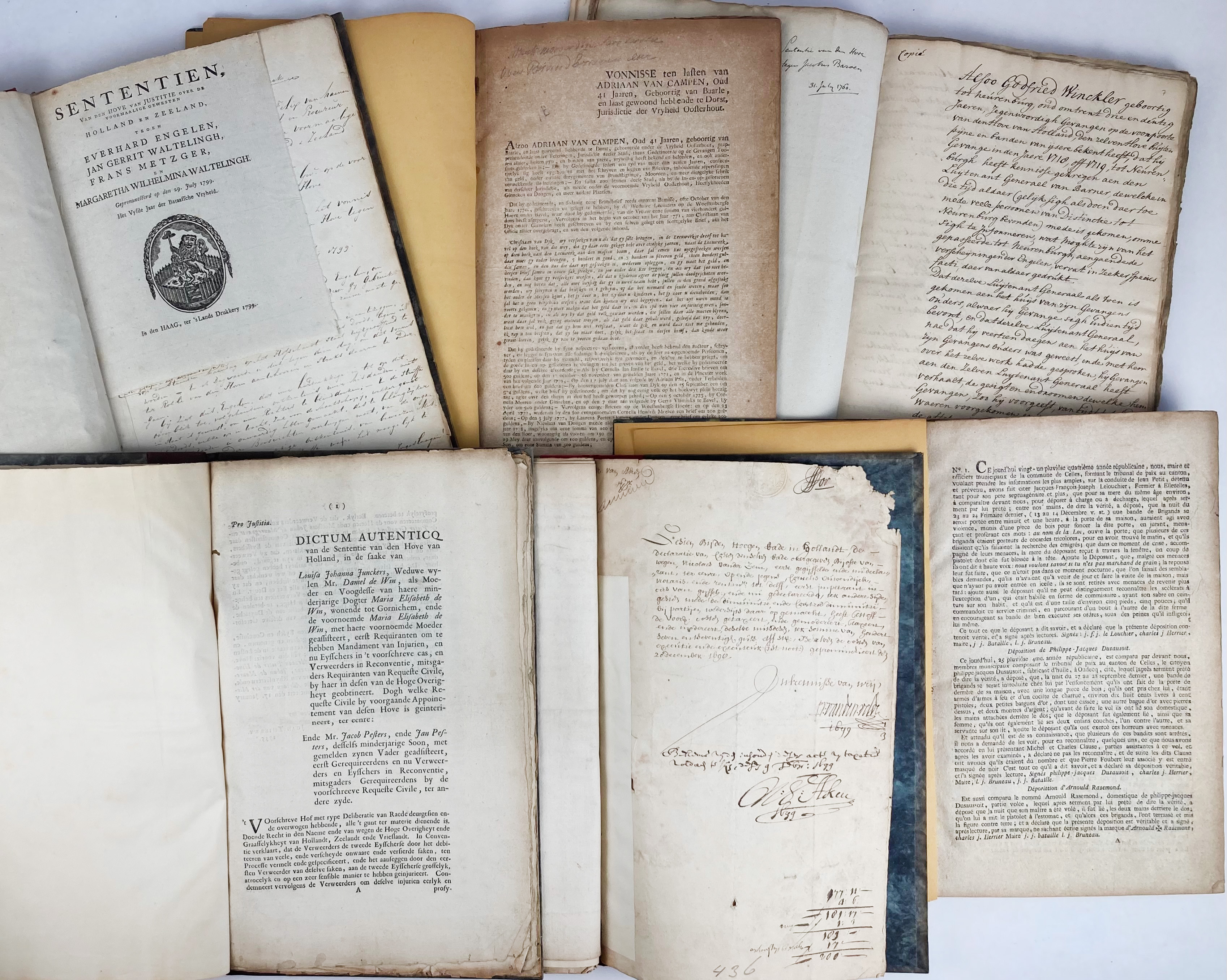 "SENTENTIEN van den Hove van Justitie (…) tegen Everhard Engelen, Jan Gerrit Waltelingh, Frans Metzger, en Margaretha Wilhelmina Waltelingh. Gepronunciëerd op den 29. July 1799". Den Haag, 1799. 53 pp. 4°. Printed report of a law case regarding a robbery of elderly people in the vicinity of Rotterdam, interspersed with 2 handwritten death sentences by Cornelis Felix van Maanen on 2 lvs. , r° and v°, imposed on two of the perpetrators, dated 26 July 1799 and 16 May 16 1800. Bound in folio early 20th c. clothbacked binding. -- Added: Binder containing 18 testimonies (copies), a.o. legal documents in ms. relating to various legal cases (mostly relating to man slaughter), dated between 1720 and 1807. c. 70 lvs., r° and v°. Fol. -- Also added: 4 similar binders w. various similar arrests, testimonies, from the 17th-18th c., etc., partly in letterpress, partly in ms. -- Tog. in 6 binders.