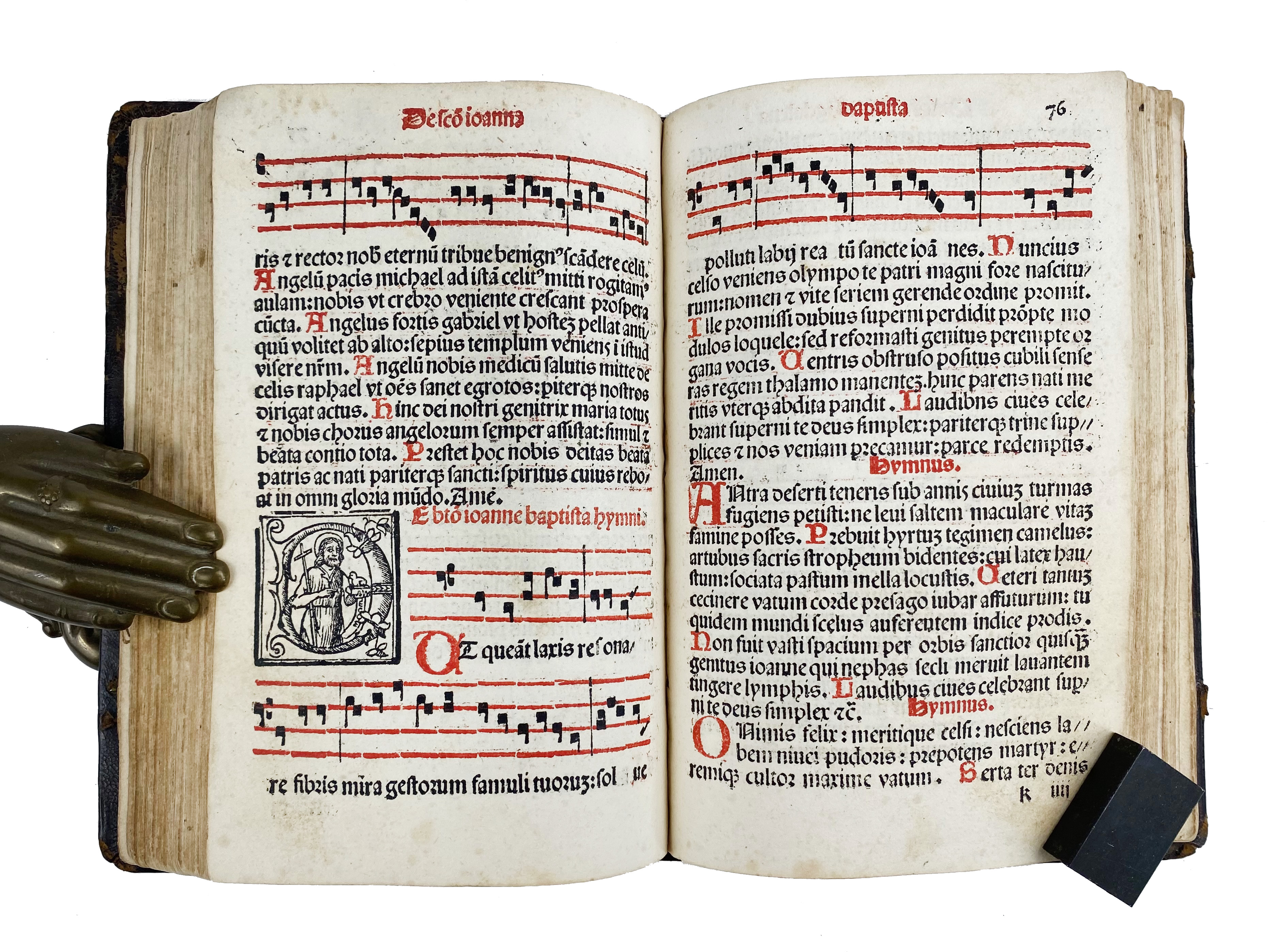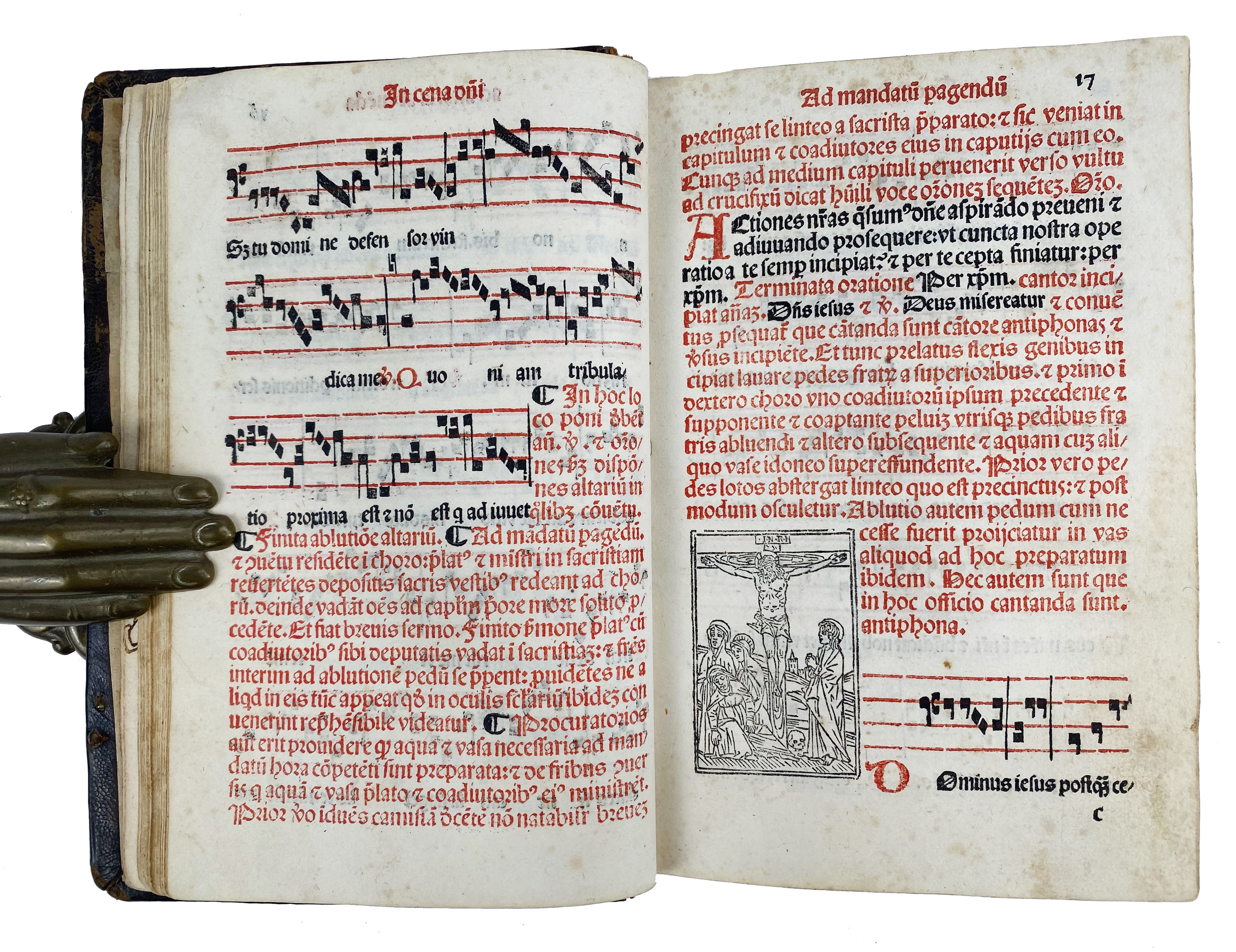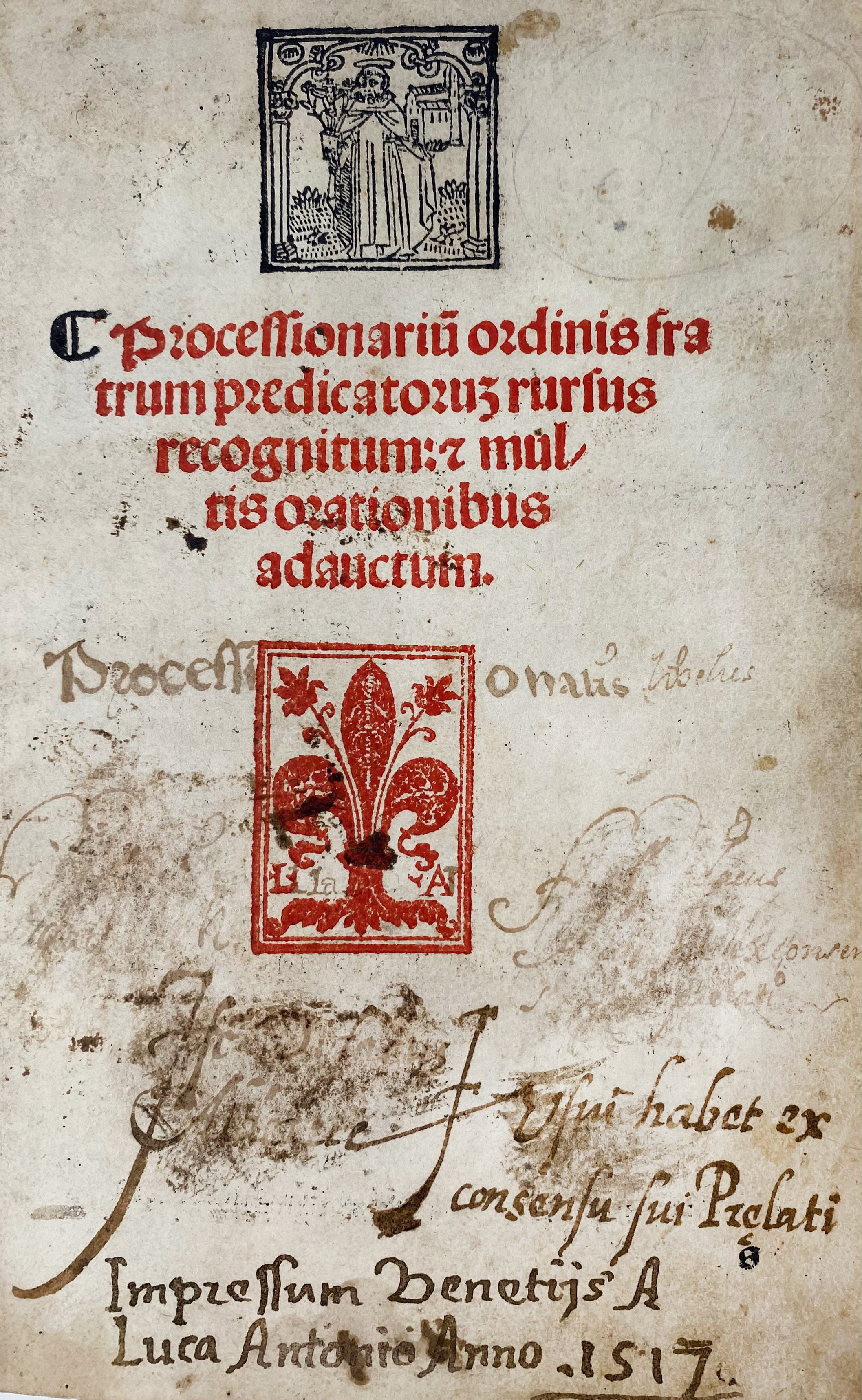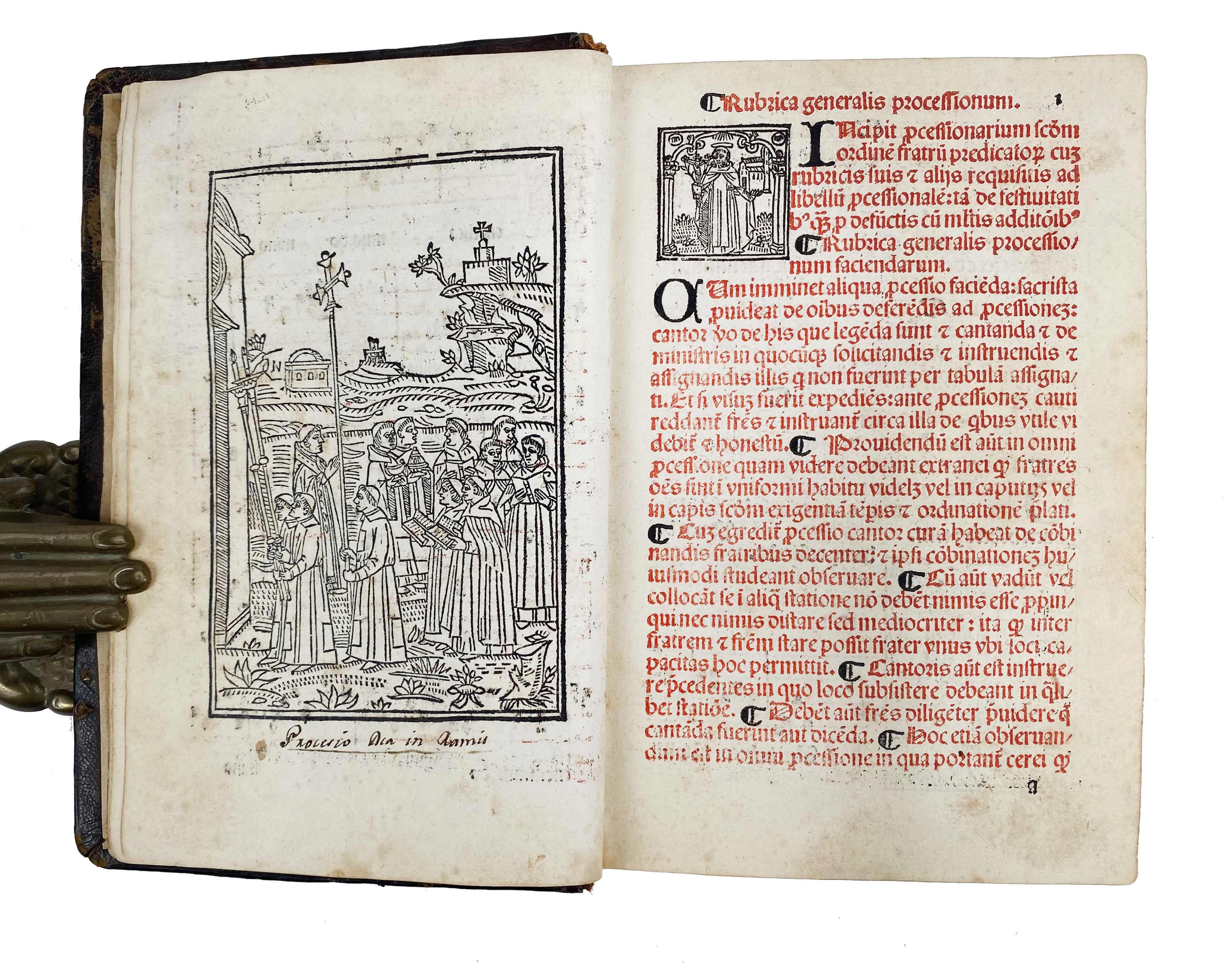 PROCESSIONARIU[M] ordinis fratrum predicatorum rursus recognitum: [et] multis orationibus adauctam. (Venice, L.A. Giunta, 12 Dec. 1517). (4), 119 (=147), (1) lvs. W. woodcut ti-vign., red Florentine lily, 3 (of 4) full-p. woodcuts, num. woodcut (historiated) initials, charming text-woodcuts, printed music on 4-line red staves, completely printed in red and black. Cont. blind tooled cf. (Skilfully rebacked, clasps & catches gone, annot. in an old hand on endpapers, inkstain on last endpaper, 3 lvs. lacking" pp. 108-110 (=O4-O6), old names on ti., a bit thumbed & foxed in places).