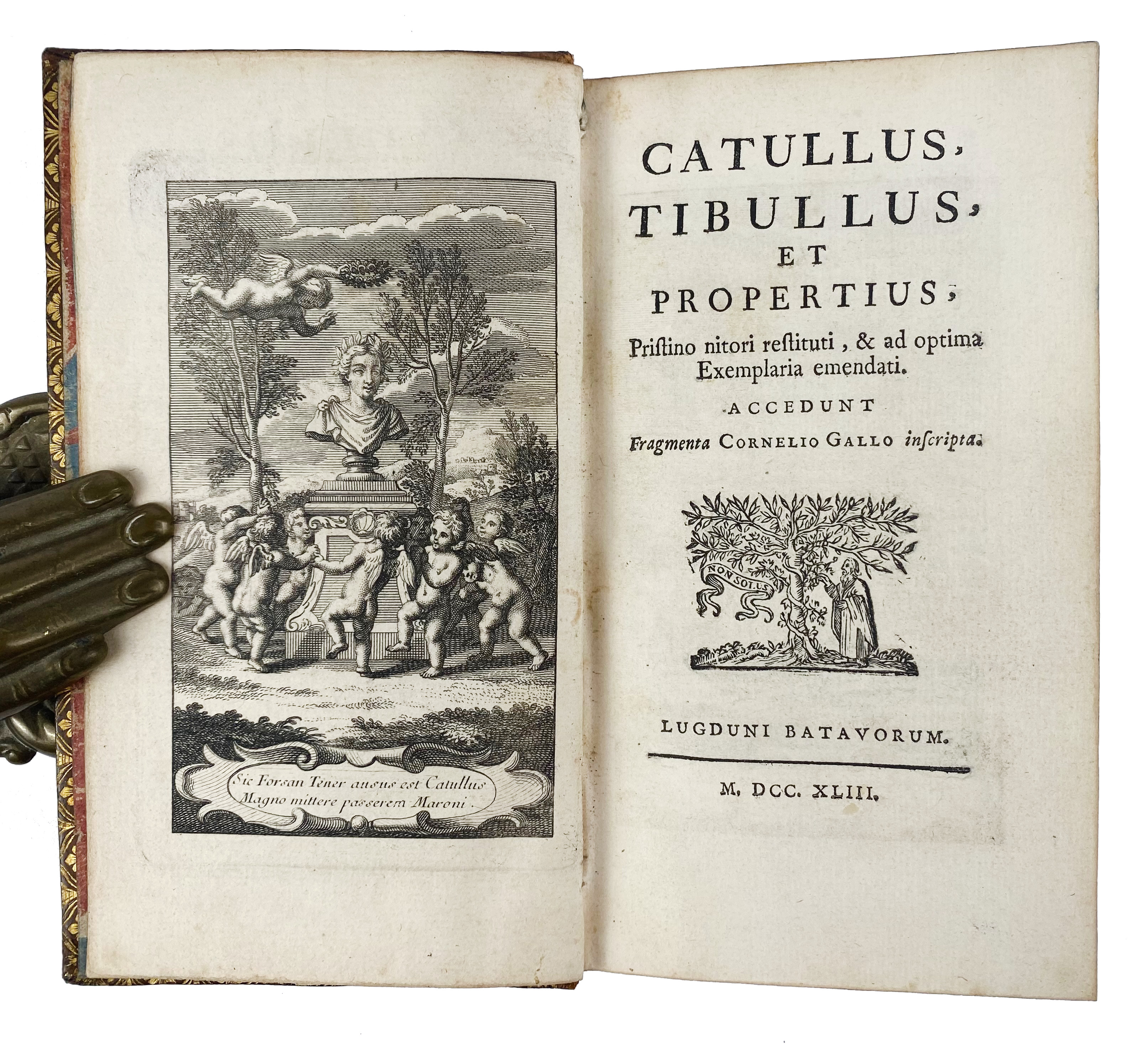 CATULLUS, TIBULLUS, & PROPERTIUS. Acced. Fragmenta C. Gallo inscripta. Leyden (=Par., Coustelier), 1743. 3 in 1 vol. xvi, 344 p. W. 3 engr. fronts. & engr. head- & tailpiece. Sm-8°. Beautiful marbled cf. w. richly dec. gilt back, red label, sides ruled in gilt, inside dentelles & all edges gilt.