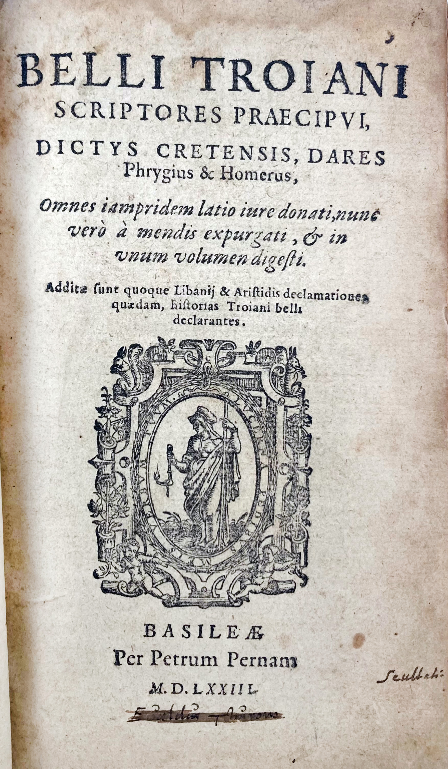 DICTYS CRETENSIS/DARES PHRYGIUS/HOMERUS. Belli Troiani scriptores praecipui (…) omnes iampridem latio iure donati, nunc vero a mendis expurgati (…). Basel, P. Perna, 1573. (8), 1042 pp. Old panelled cf., spine w. compartments & gilt dec. (Joints split but holding, spine loosening, very neat annot. in pencil in an old hand in first half, margins stained in places (espec. at the end), sl. browned).