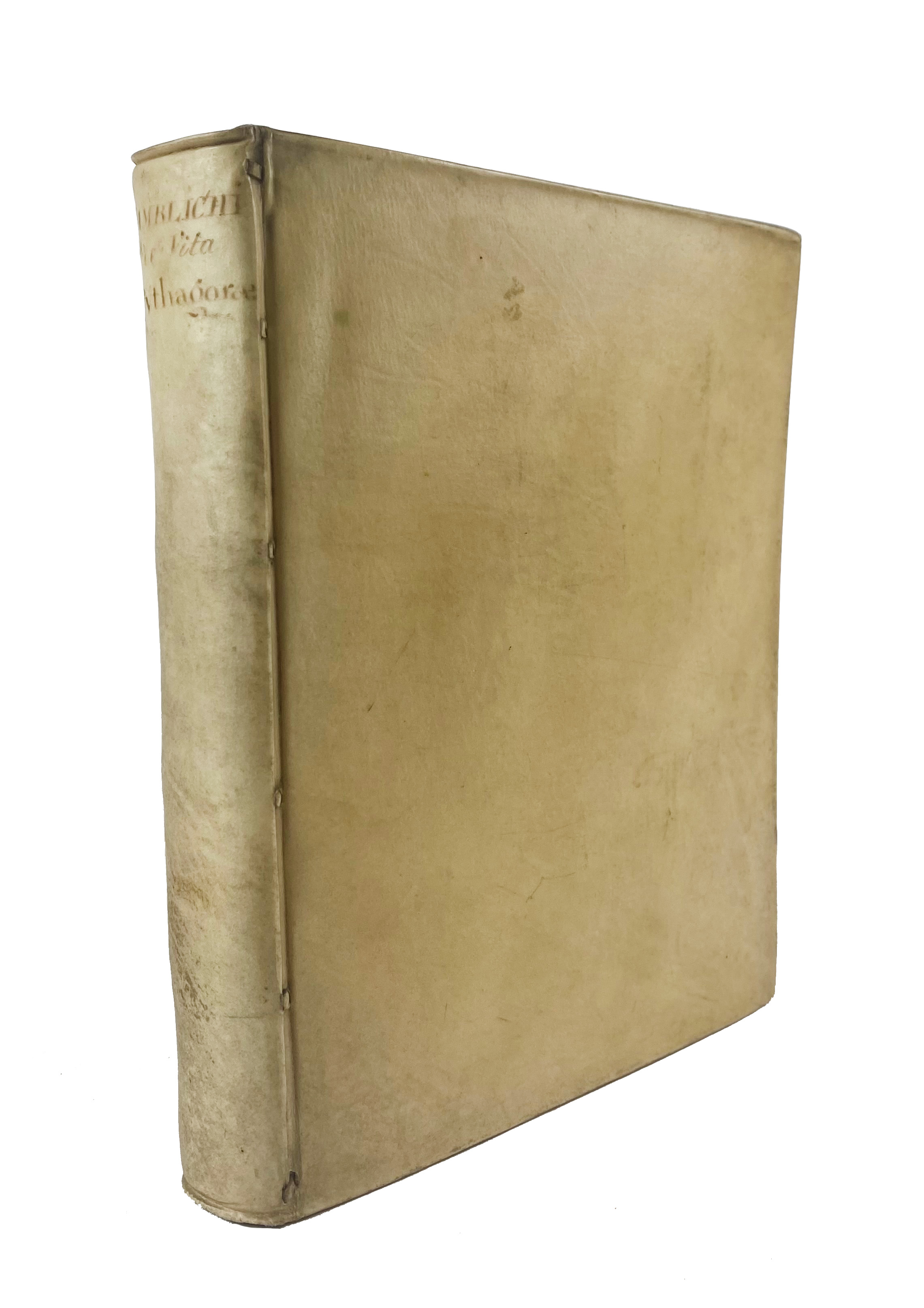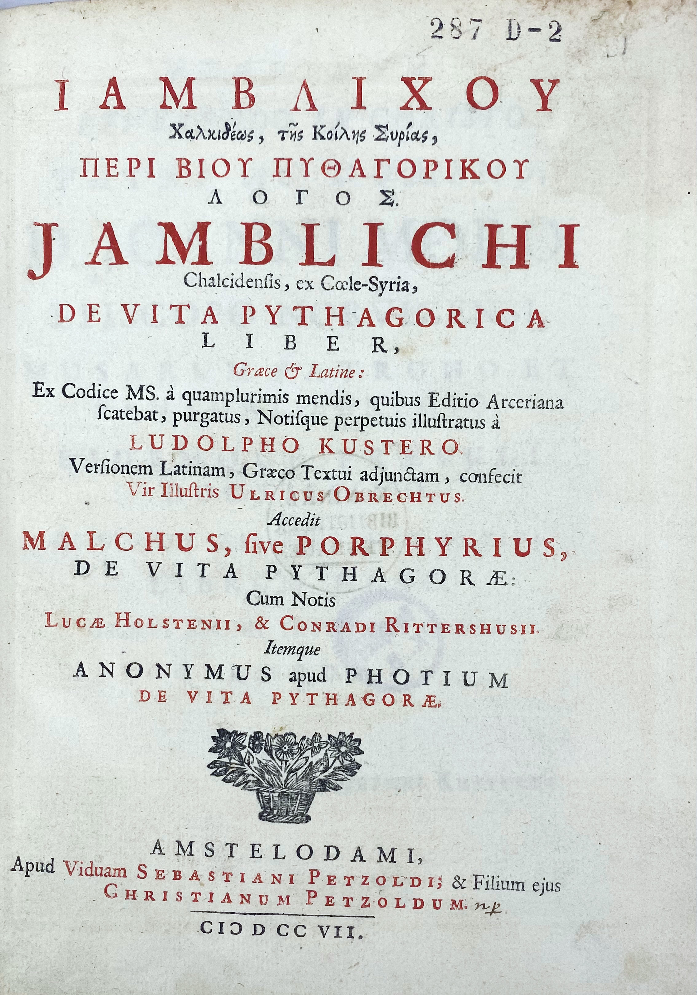 IAMBLICHUS. De vita Pythagorica liber, Gr. & Lat. Acced. Malchus, sive Porphyrius, De vita Pythagoræ. Cum notis L. Holstenii, & C. Rittershusii. Itemque Anonymus apud Photium De vita Pythagoræ. Amst., Widow of S. Petzhold & Chr. Petzhold, 1707. 3 parts in 1 vol. (14), 220, (16); 67; 93, (7) pp. W. engr. front. 4°. Cont. vellum.