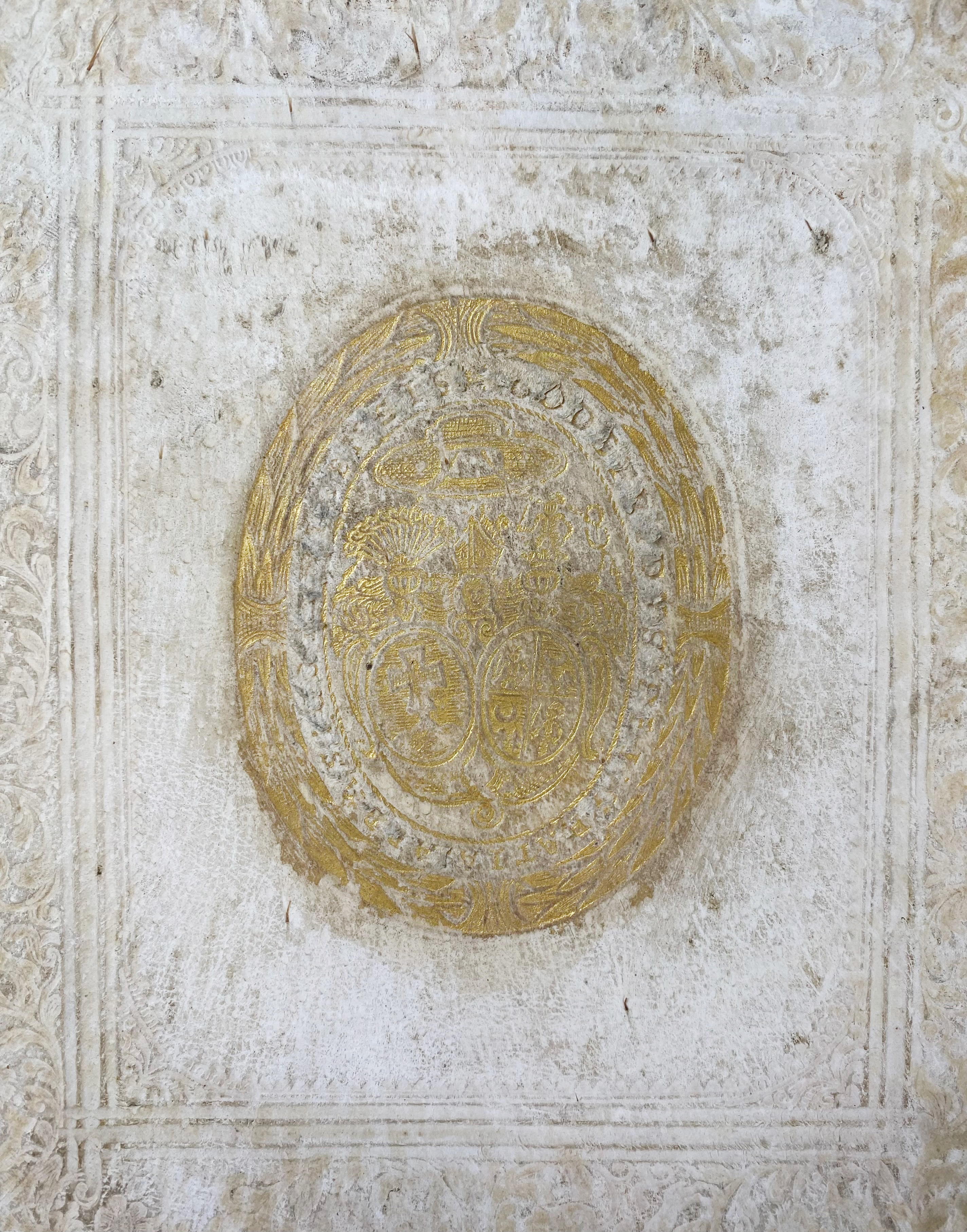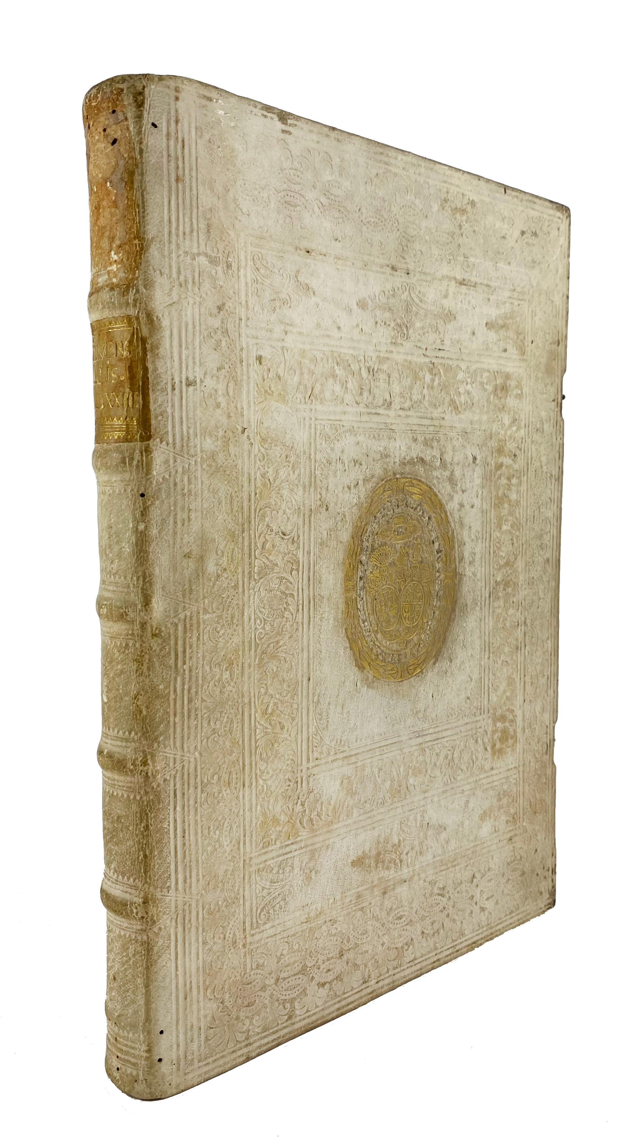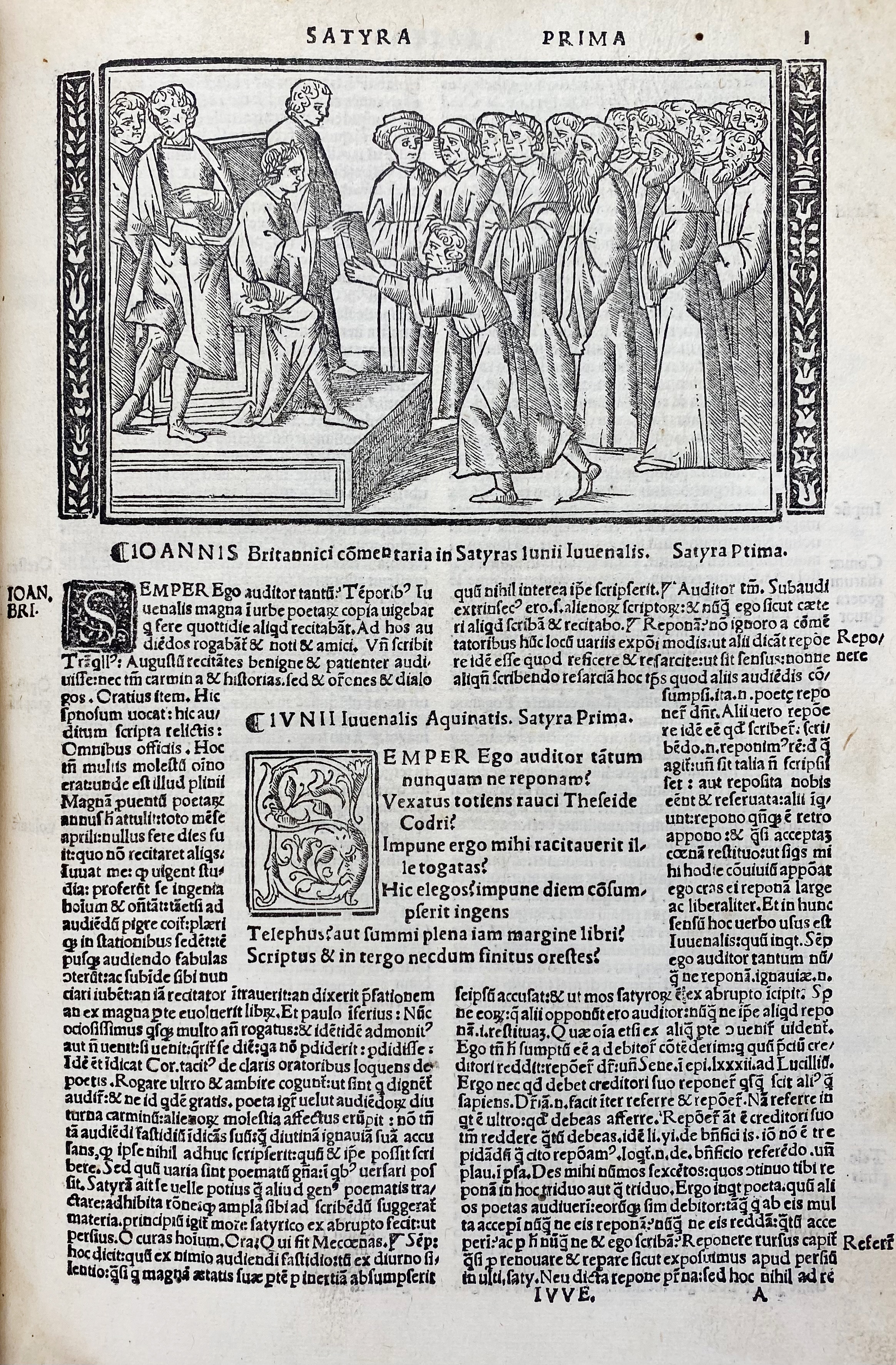 JUVENALIS. Satyrographi opus. Interpret. J. Brittanico (…). Una cum J. Badii (…) explanationibus. Venice, Rusconibus, 1523. (6), clxiii lvs. W. title printed in red and black within woodcut border, w. 14 charming woodcuts in the text. Fol. Beautiful cont. richly blind tooled pigskin over wooden brds., w. gilt-tooled ecclesiastical coat of arms on both sides containing two shields under a cardinal's galero, clasps & catches, and all edges red. (Last blank lacks, a bit wormholed in places, sl. affecting the text, a bit stained/browned in places, margins cut).