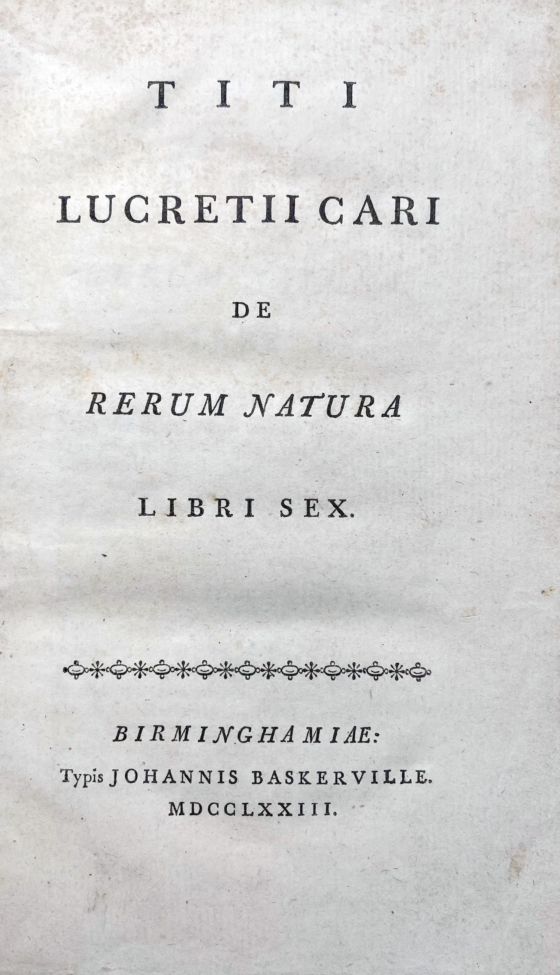 LUCRETIUS. De rerum natura ll. VI. Birmingham, J. Baskerville, 1773. (2), 214 pp. Cont. h. vellum extra w. red label and fine dec. paper on both sides, uncut. (Slightly browned/foxed, but a very fine copy).