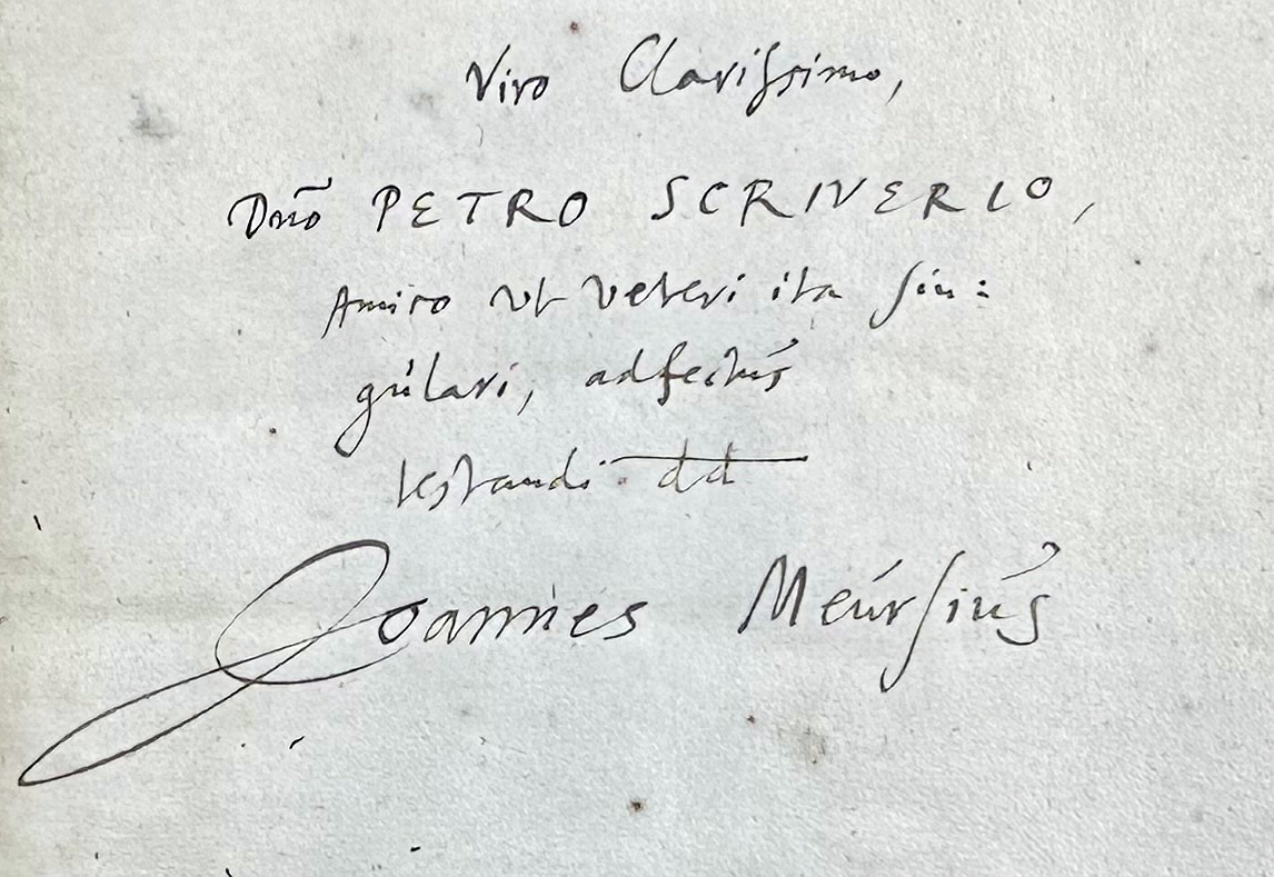 With Meursius' autograph dedication to Petrus Scriverius: "Viro Clarissimo, D[omi]no Petro Scriverio, amico ut veteri ita singulari, adfectus legandi dd Joannes Meursius".