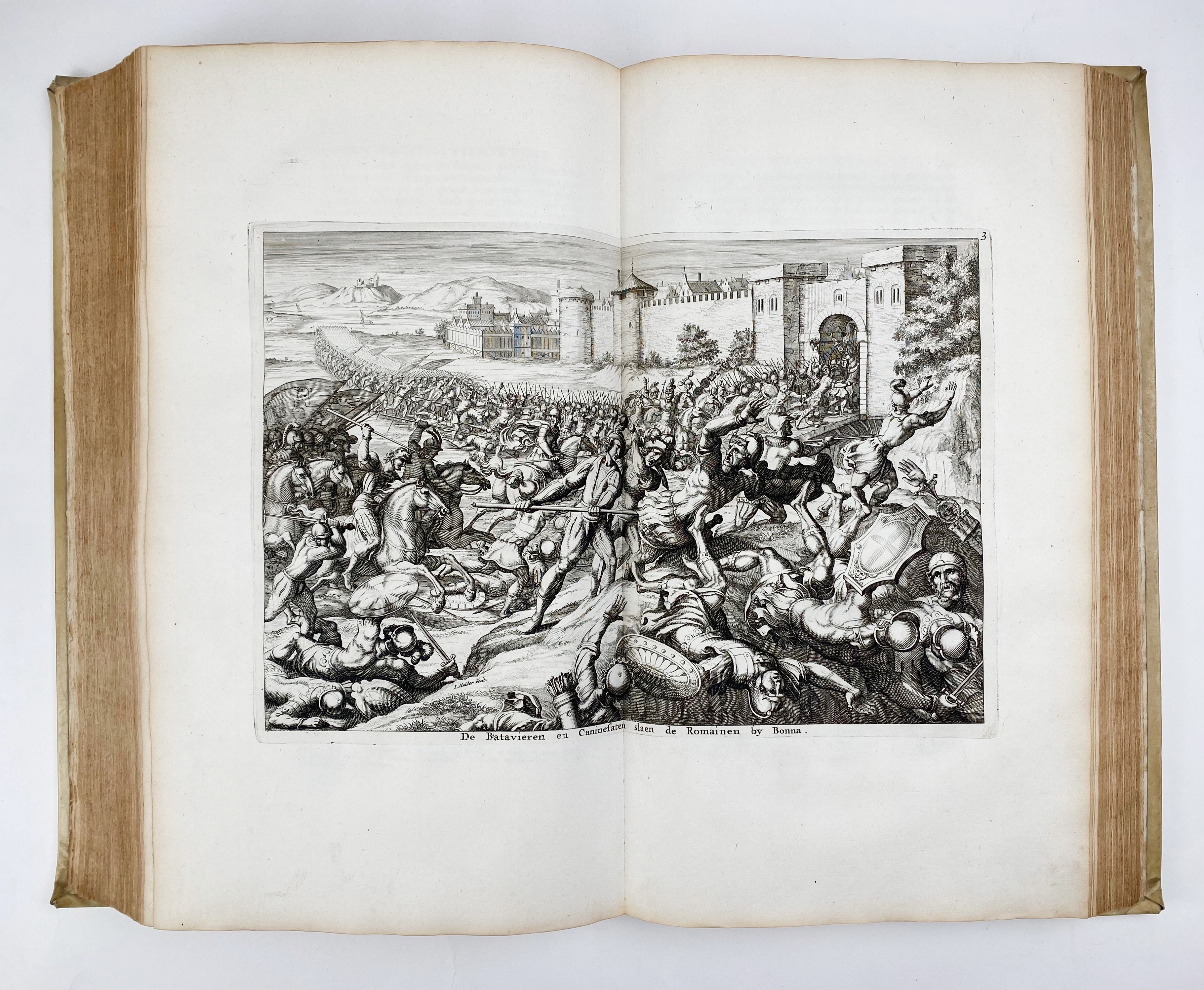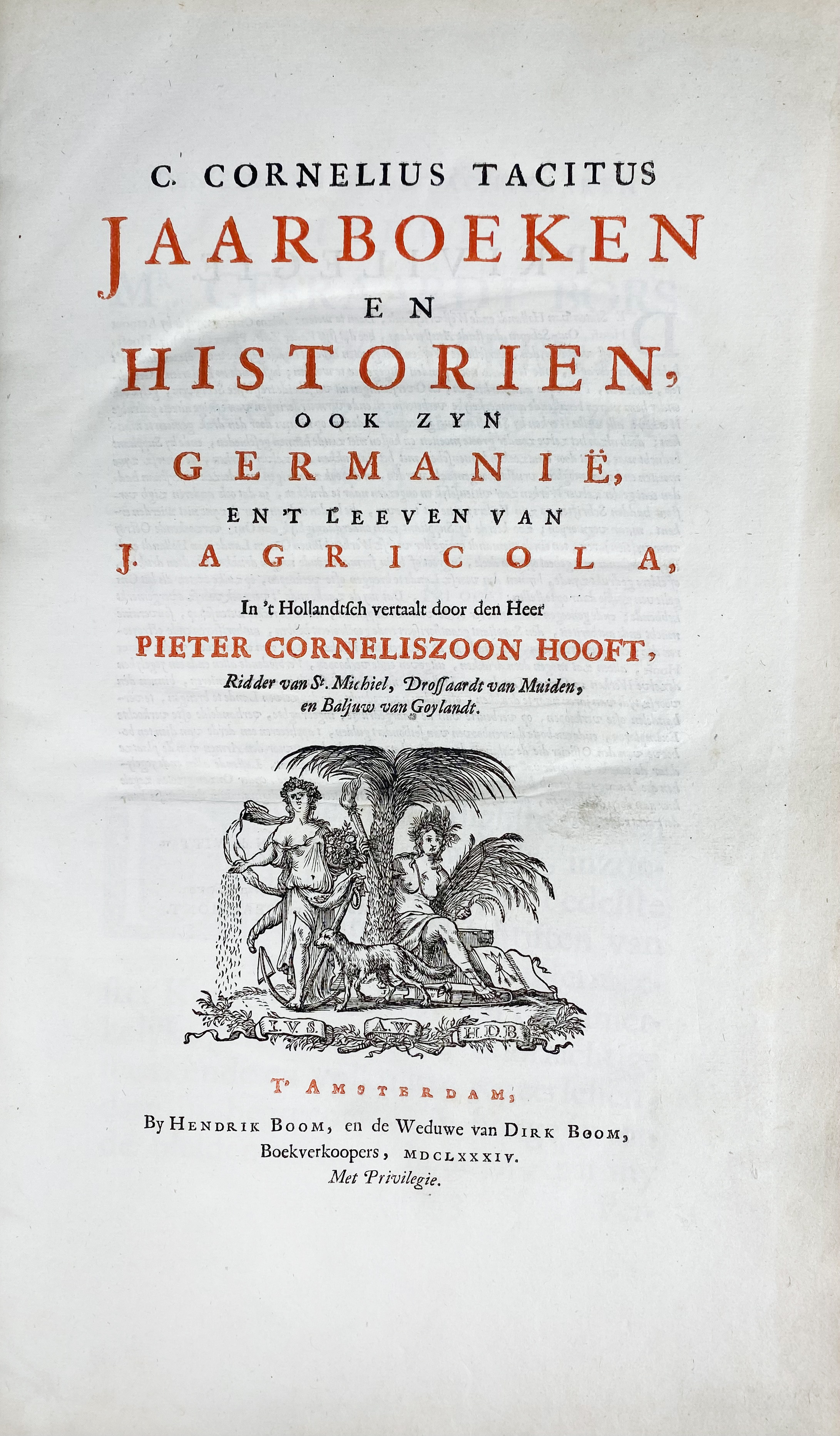 TACITUS. Alle de werken. In 't Hollandtsch vert. d. P.C. Hooft. Amst., (etc.), H. Wetstein, (a.o.), 1704. (32), 528, (84) pp. W. engr. ti-vign., 14 engr. portrs. of Roman emperors by Andries Vaillan(d)t & 8 double-p. engr. by J. Mulder. Fol. Cont. blind tooled vellum w. raised bands. (A few minor foxing spots in places, else an excellent copy on large paper).