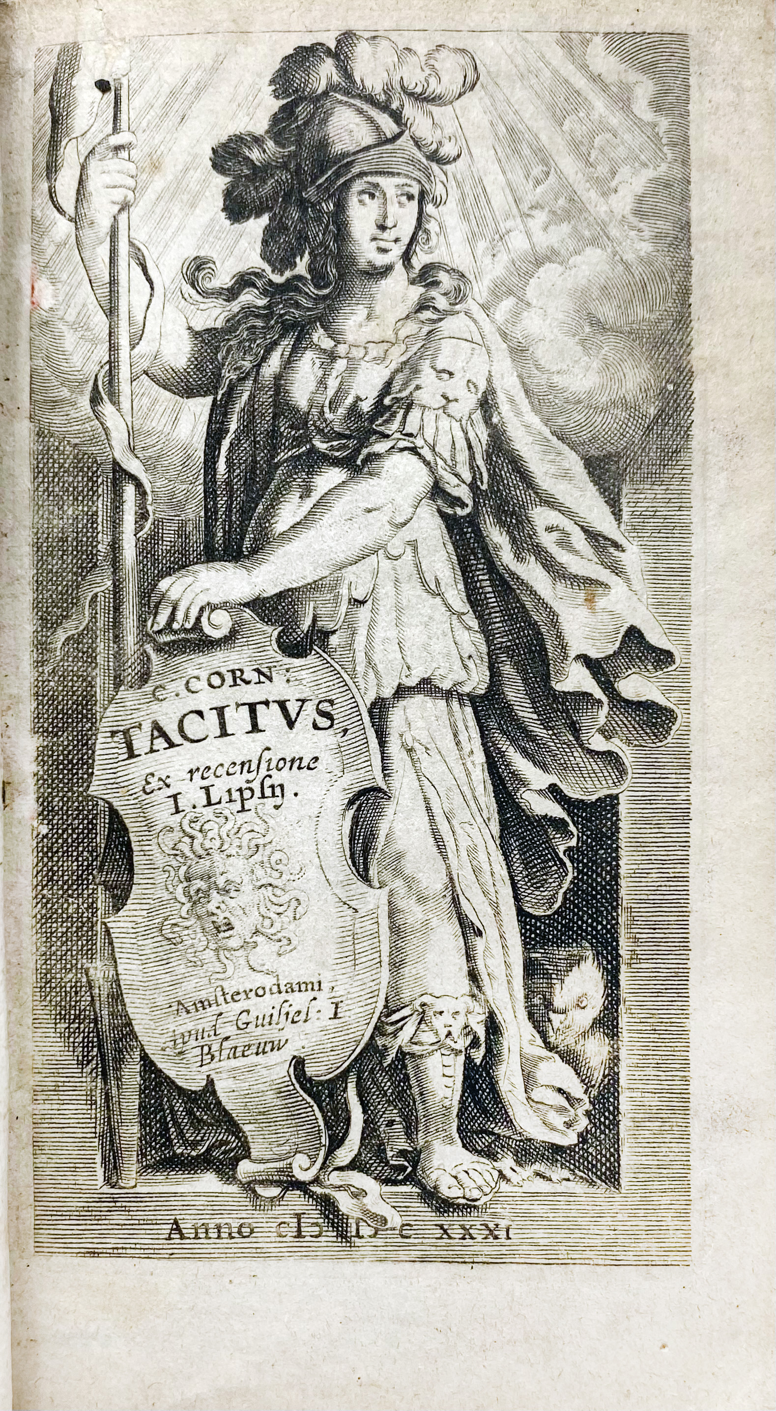 TACITUS. Ex rec. I. Lipsii. Amst., G. Blaeuw, 1631. 459, (21) pp. W. engr. ti. 16°. Fine 19th c. mor. w. raised bands, dec. gilt back, blind stamped monogram (WSM = William Stirling-Maxwell) on front side, sides ruled in gilt, chintz endpapers. (Faintly stained at the beginning, a bit browned).