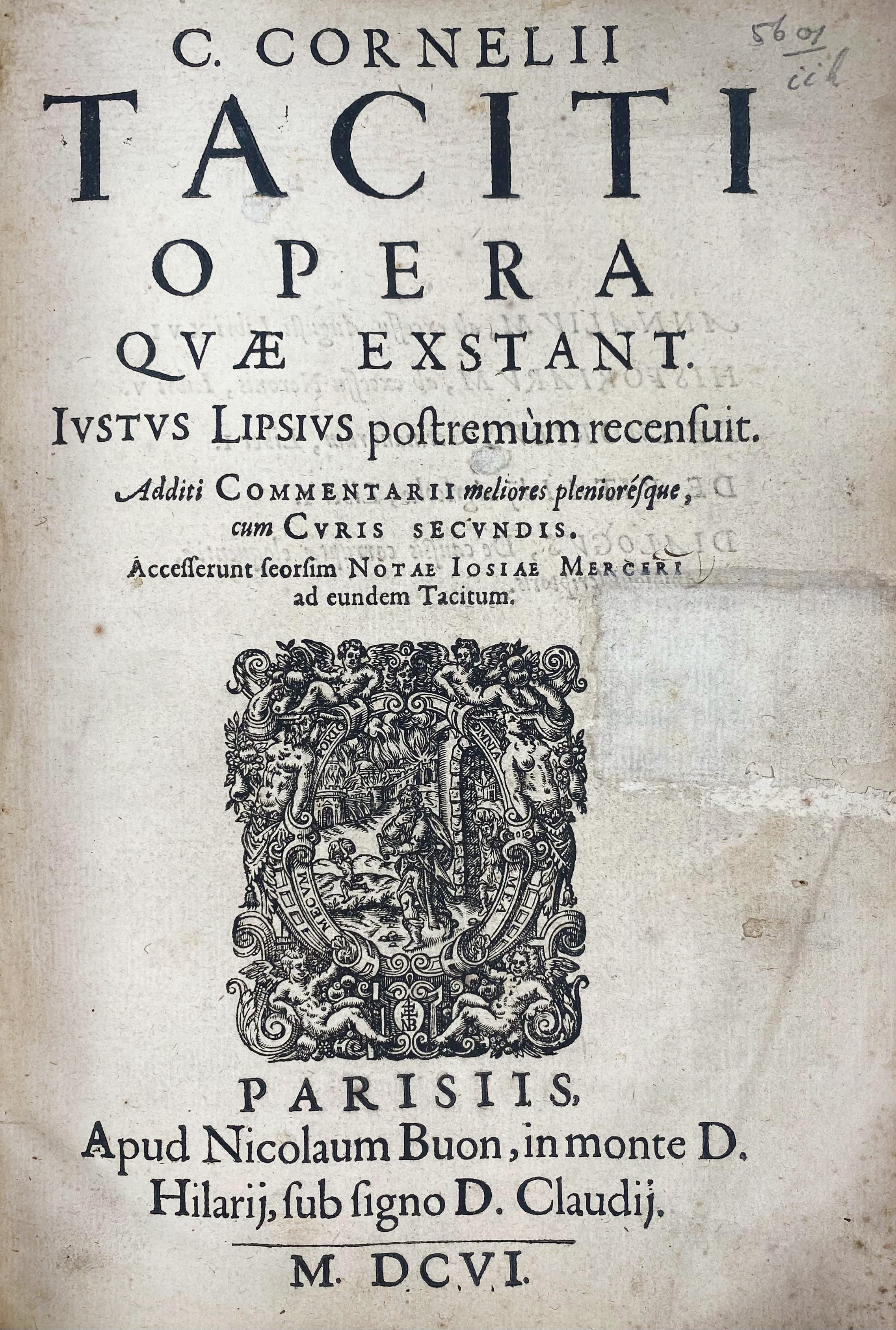 TACITUS. Opera quae exstant. Iustus Lipsius postremum recensuit. Par., N. Buon, 1606. 3 parts in 1 vol. (8), 418, (14); (8), 246; lxxxii, (24) pp. W. woodcut printer's device on each title page. 4°. Cont. elaborately gilt tooled full cf. binding, bearing the gilt armorial stamp of Charles of Lorraine, Abbot of Gorze, on both sides, a.e.g. (Skillful restorations to spine, bottom of spine sl. dam., upper hinge strengthened, sm. rep. to ti-p., some marg. stains, sl. browned).