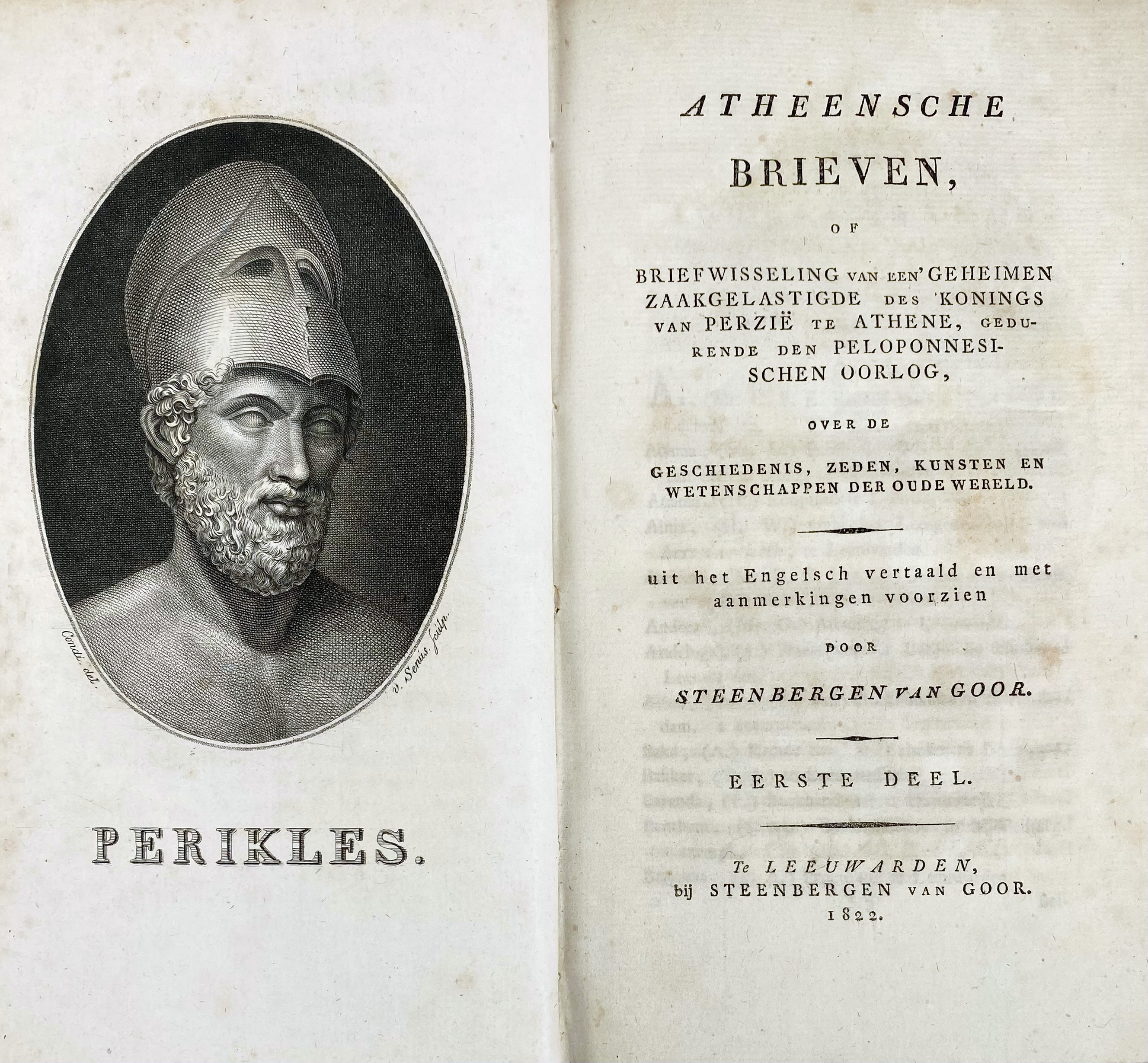 YORKE, Ph. & Ch., (a.o.). Atheensche brieven, of een briefwisseling van een' geheimen zaakgelastigde des konings van Perzië te Athenen, gedurende den Peloponnesischen Oorlog. Uit het Eng. vert. d. Steenbergen van Goor. Leeuw., Steenbergen van Goor, 1822-24. 4 vols. W. 4 diff. front.-portrs. Fine cont. marbled hcf. w. red labels. (A bit browned in places, else a fine set of this rare translation).