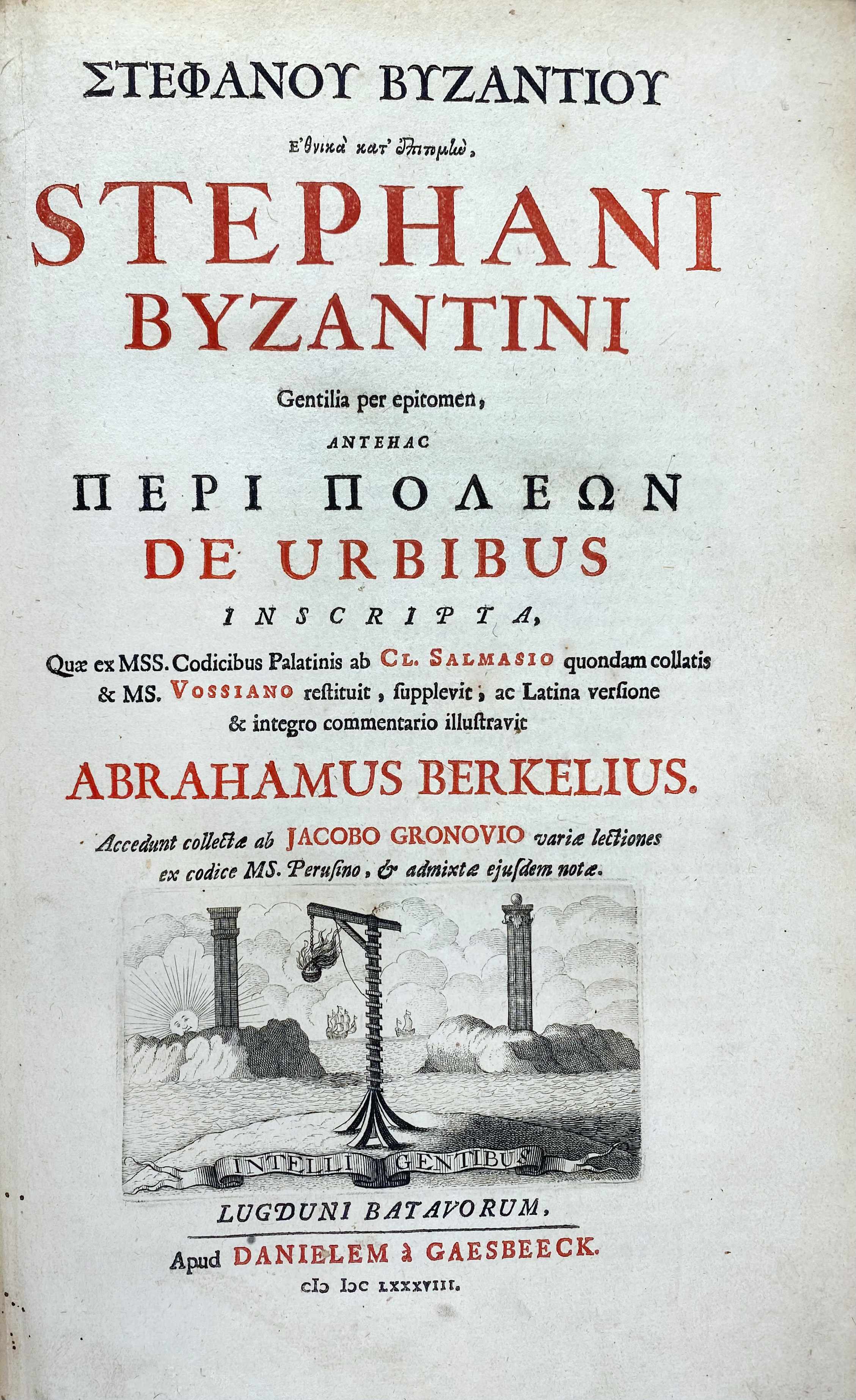 Esteemed edition based on Hermolaos's compilation of the remains of Stephanus's extensive geographical dictionary dedicated to Justinian I, ± 530 AD. Special attention is given to the names of places in Egypt. - Cf. Kl. Pauly V, 359; Hoffmann III, 441; Schweiger I, 300; Brunet V, 531; Spoelder 487 (Amst. 6).