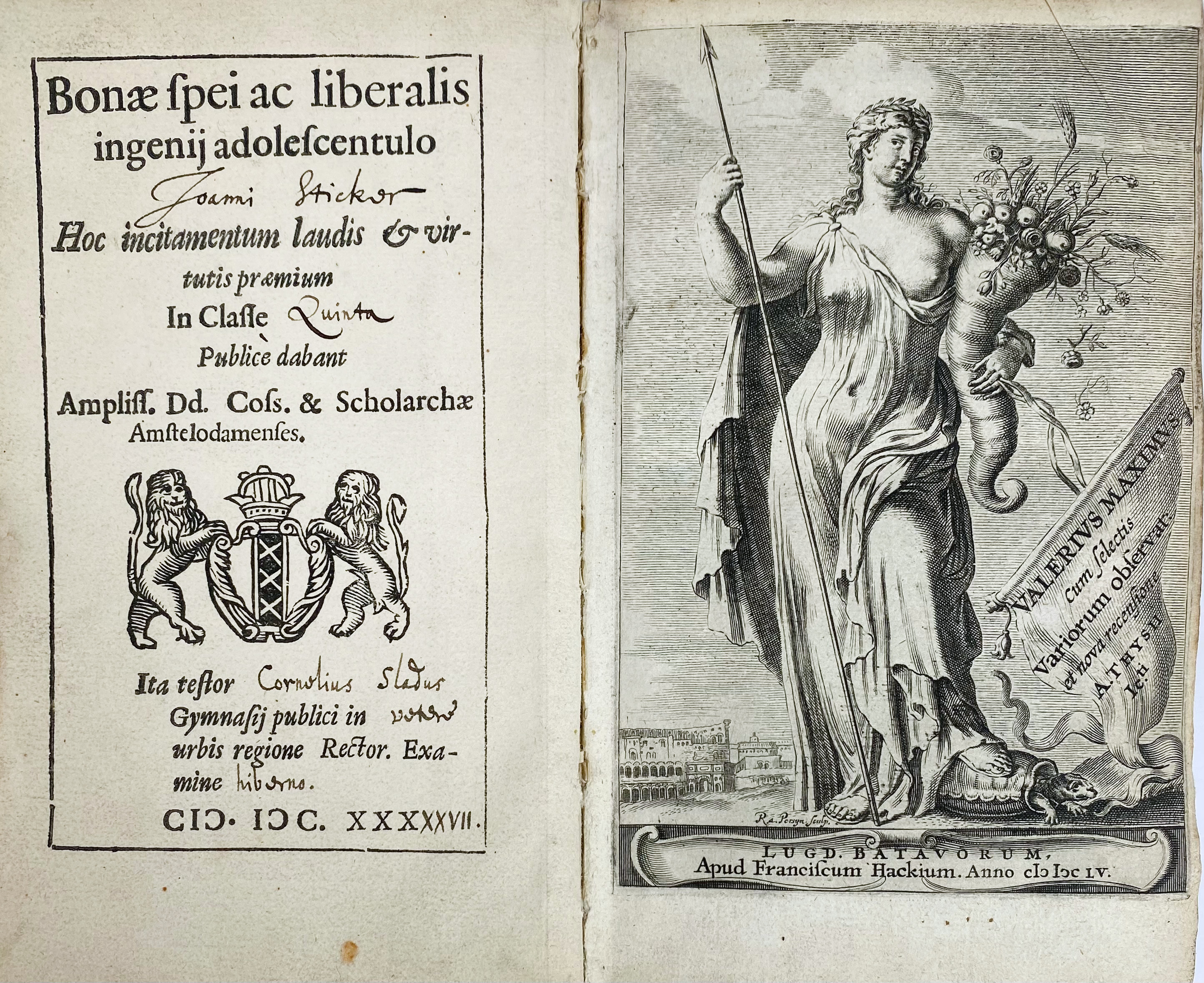 AMSTERDAM -- VALERIUS MAXIMUS. Cum selectis variorum observat. et nova rec. A. Thysii. Leiden, F. Hackius, 1655. (16), 844, (32) pp. W. engr. ti. by R. v. Persijn. Cont. vellum w. overl. sides & coat of arms of Amsterdam on both sides, sides and spine ruled in gilt. (Ties fail). -- Added: Id. Libri IX factorum dictorumque memorabilium. Cum not. integr. Pighii, Lipsii, (e.a.). Notae & observat. perpetuae J. Perizonii ut & A. Schultingii exercitatio. Rec. & notas adj. A. Torrenius. Leiden, S. Luchtmans, 1726. 2 in 1 vol. (46), 520; (2), 521-914, (184) pp. W. engr. front. by J. Wandelaar. 4°. Cont. blind tooled vellum. (A bit age-toned in places). -- (2).