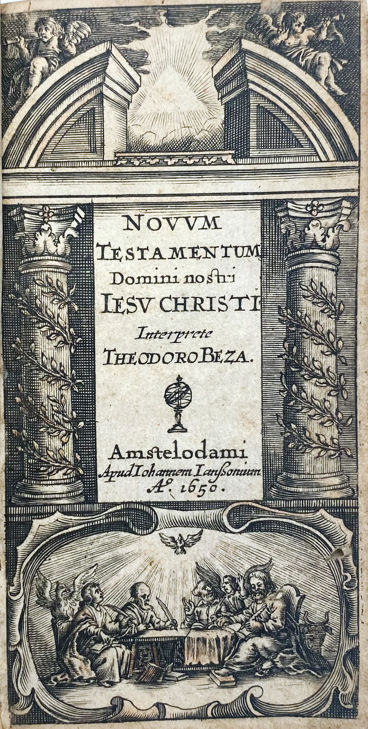 BIBLIA LATINA -- NOVUM TESTAMENTUM Domini nostri Iesu Christi. Interpret. Th. Beza. Amst., J. Janssonius, 1650. 408 pp. W. engr. ti. 16°. Charming cont. black cf. w. raised bands, dec. gilt back, gilt floral borders on both sides, gilt gauffered edges. (Margins trimmed, sl. browned/foxed).