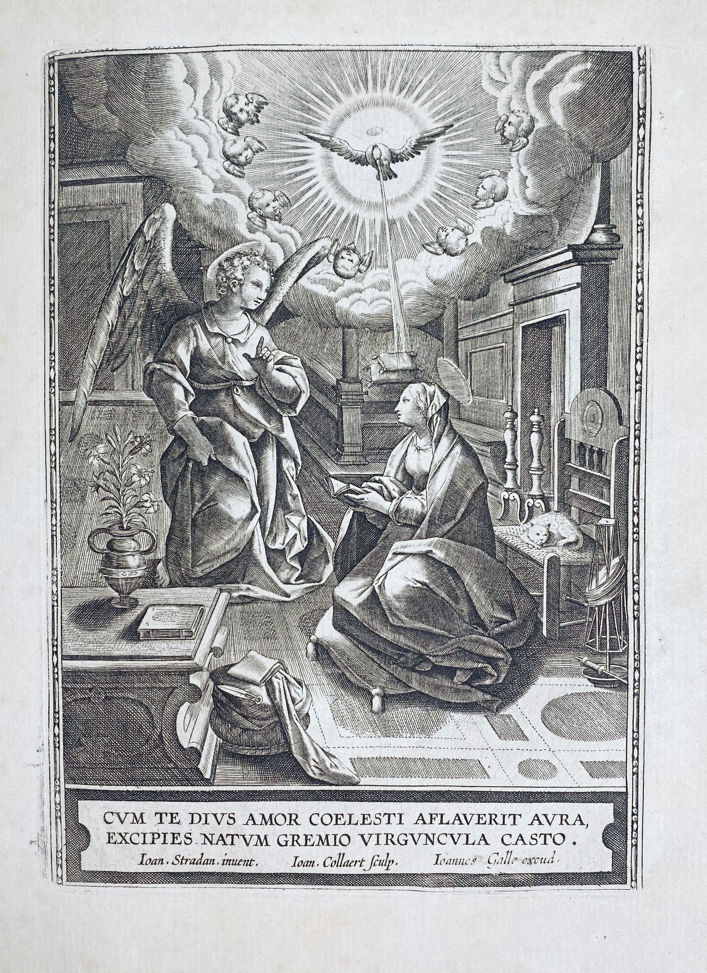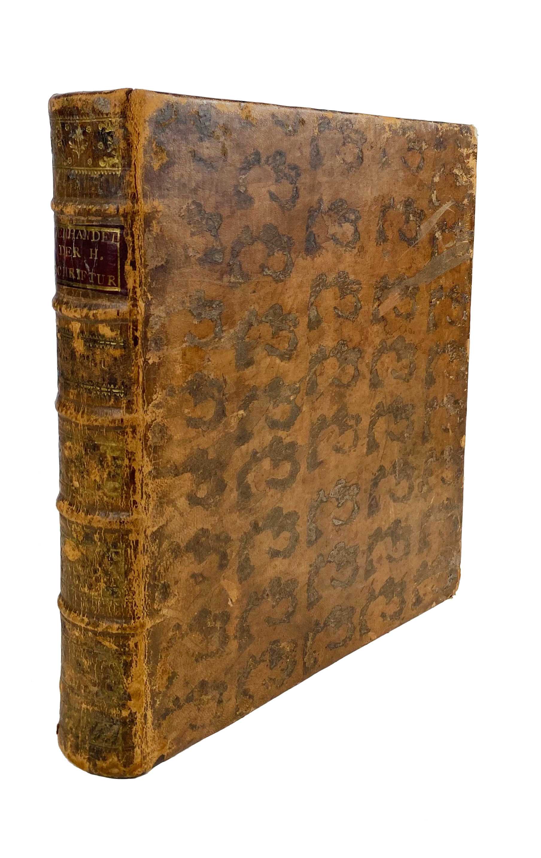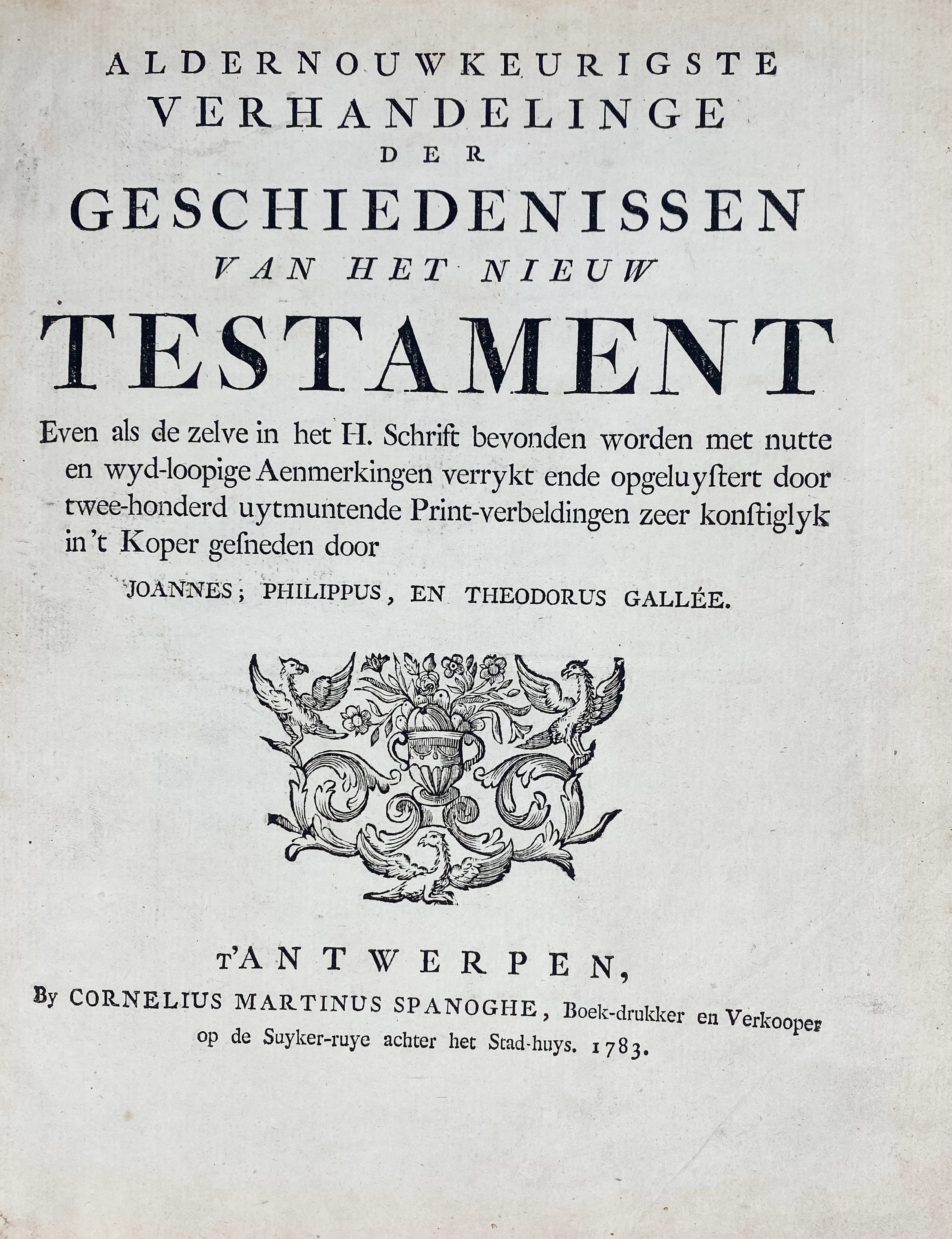 BIBLIA NEERLANDICA -- ALDERNOUWKEURIGSTE VERHANDELINGE der geschiedenissen van het Nieuw Testament. Even als de zelve in het H. Schrift bevonden worden met nutte en wyd-loopige aenmerkingen verrykt ende opgeluystert door twee-honderd uytmuntende print-verbeldingen zeer konstiglyk in 't koper gesneden door Joannes; Philippus, en Theodorus Gallée. Antw., C.M. Spanoghe, 1783. 1 (of 2) vol. (4), xxiv, 284, (13) pp. W. engr. front., large fold. engr. map of the Holy Land, 203 engr. plates mainly after M. de Vos and M. Heemskerck. 4°. Cont. mottled cf. w. raised bands & red label. (Spine rubbed/chafed, corners bumped, large map a bit creased/wrinkled and w. sm. tear, a bit browned/foxed in places).