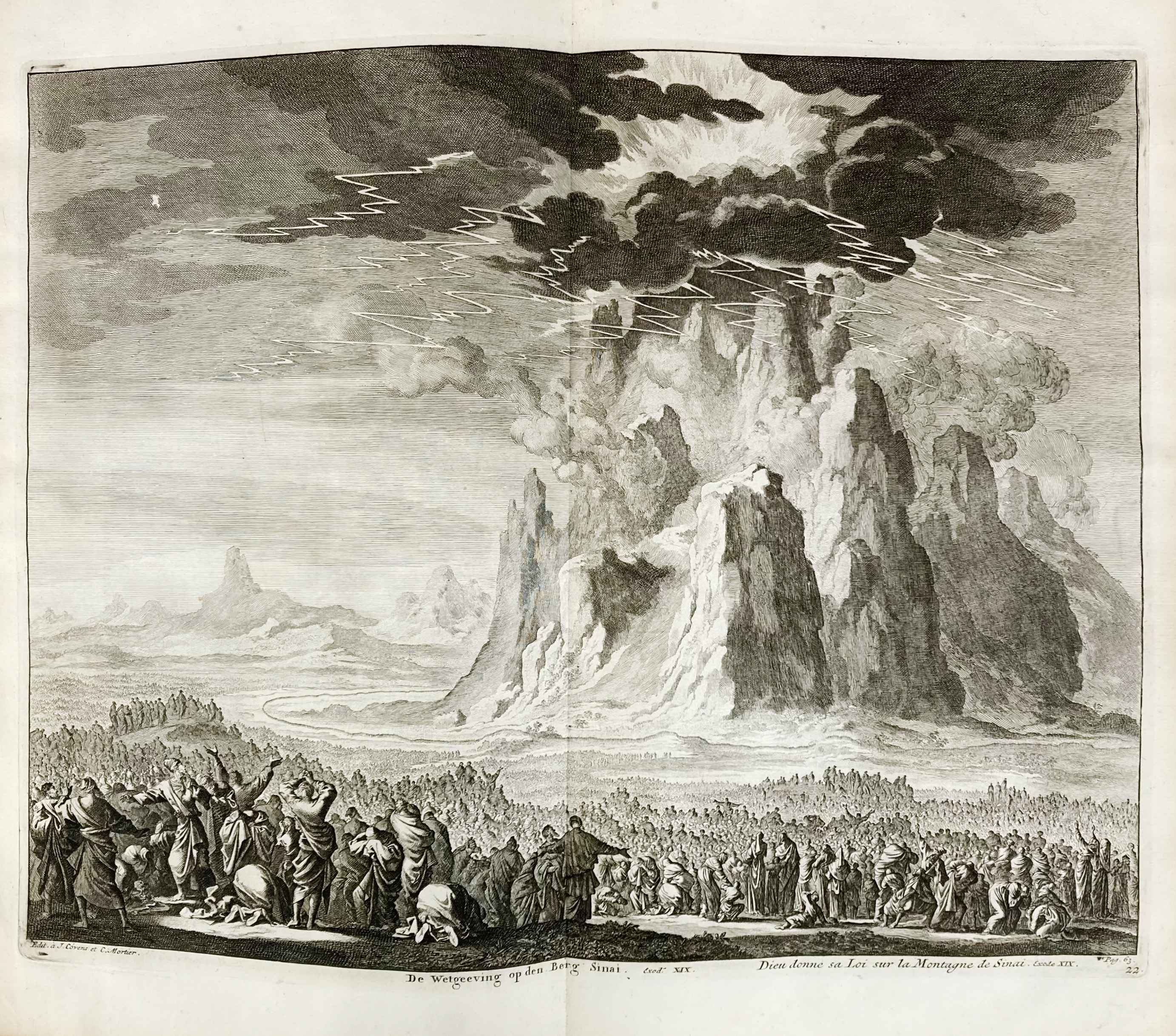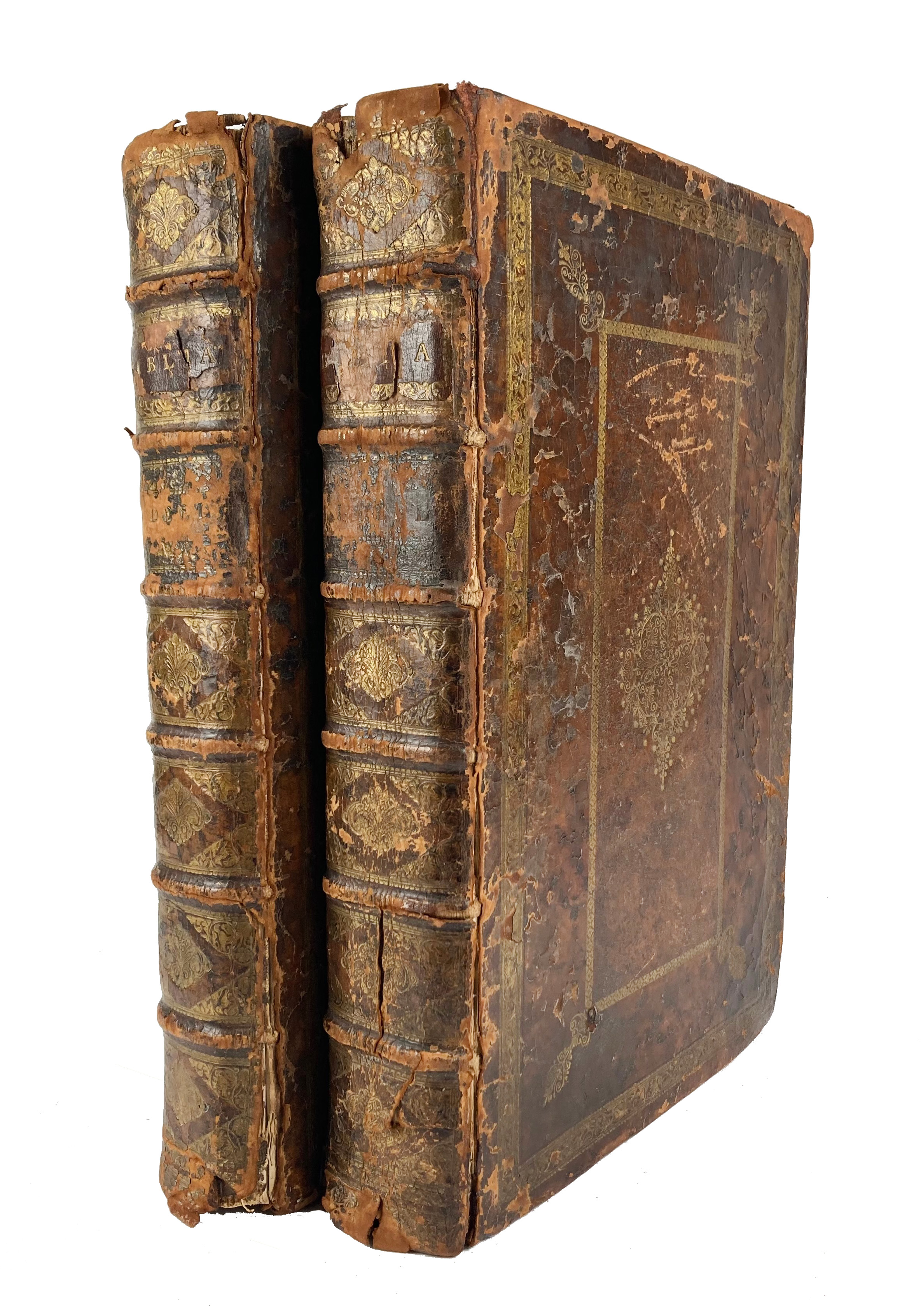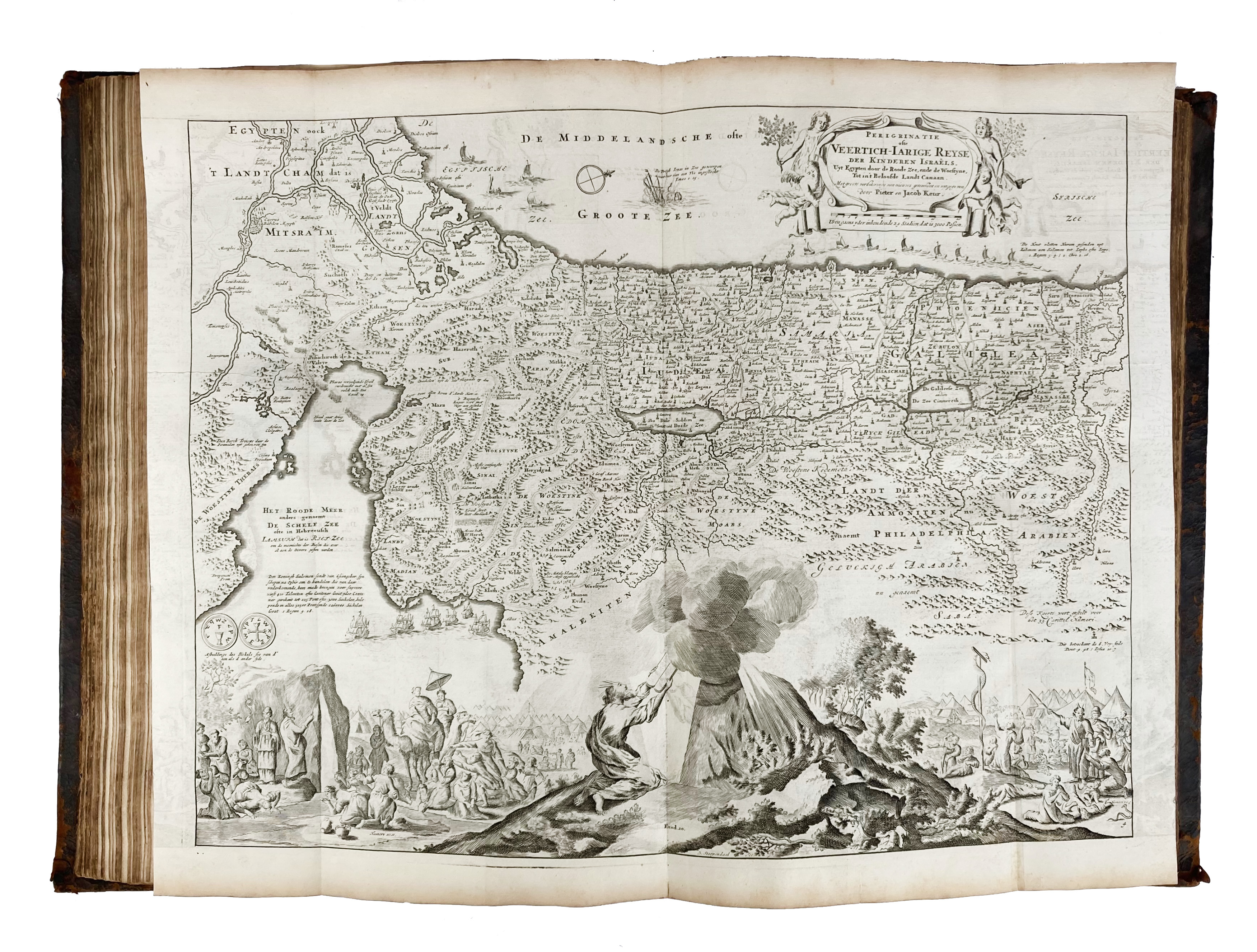 BIBLIA NEERLANDICA -- BIBLIA, Dat is De gantsche H. Schrifture vervattende alle de Canonijcke Boecken des O. en des N. Testaments. (Met) De Boecken genaemt Apocryphe. Dordr., P. & J. Keur, 1729. 5 parts in 2 vols. W. engr. ti., 5 double-p. engr. maps (incl. world map by D. Stoopendaal), 1 double-p. engr. plan of Jerusalem & 58 extra double-p. plates by J. Luyken. Fol. Cont. mottled cf. w. sides & spines dec. in gilt, spines w. raised bands & (dam.) labels. (Spines dam., sides scuffed, map of 'Paradys & 't land Canaan' w. a tear on the fold, c. 2 cm into the image, other maps & plates very well-preserved, bindwork sound).