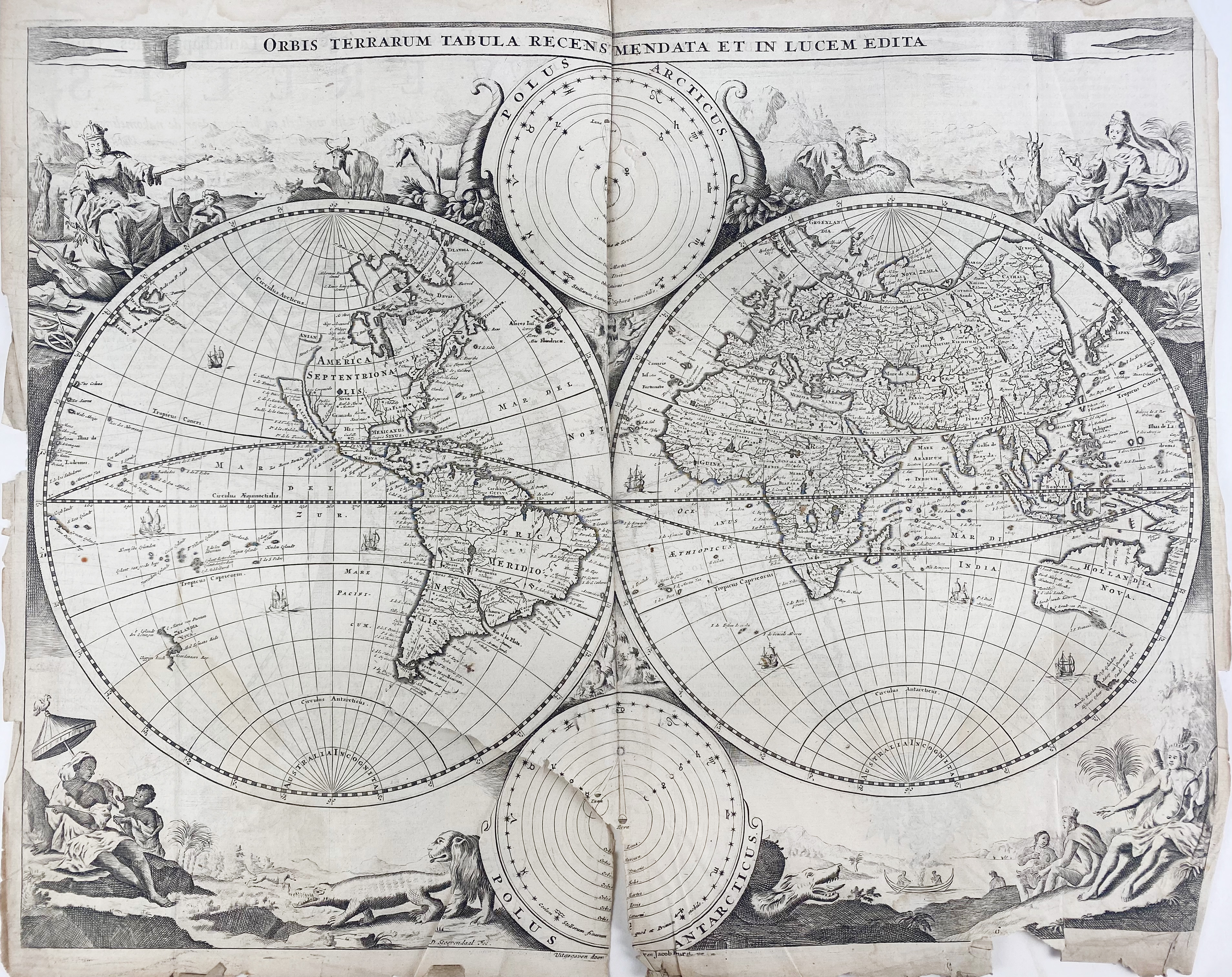BIBLIA NEERLANDICA -- BIBLIA, Dat is De gantsche H. Schrifture vervattende alle de Canonijcke Boecken des O. en des N. Testaments. (Met) De Boecken genaemt Apocryphe. Dordr., P. & J. Keur, 1729. W. engr. ti., 5 double-p. engr. maps (incl. world map by D. Stoopendaal), 1 double-p. engr. plan of Jerusalem. Fol. Cont. blind tooled cf. over wooden brds. w. brass clasps, catches & cornerpieces. (Top of spine and top of front side a bit dam., all maps loose and w. margins frayed and w. sm. tears, larger tear in world map and sm. pieces of this map missing, a bit stained at the beginning).