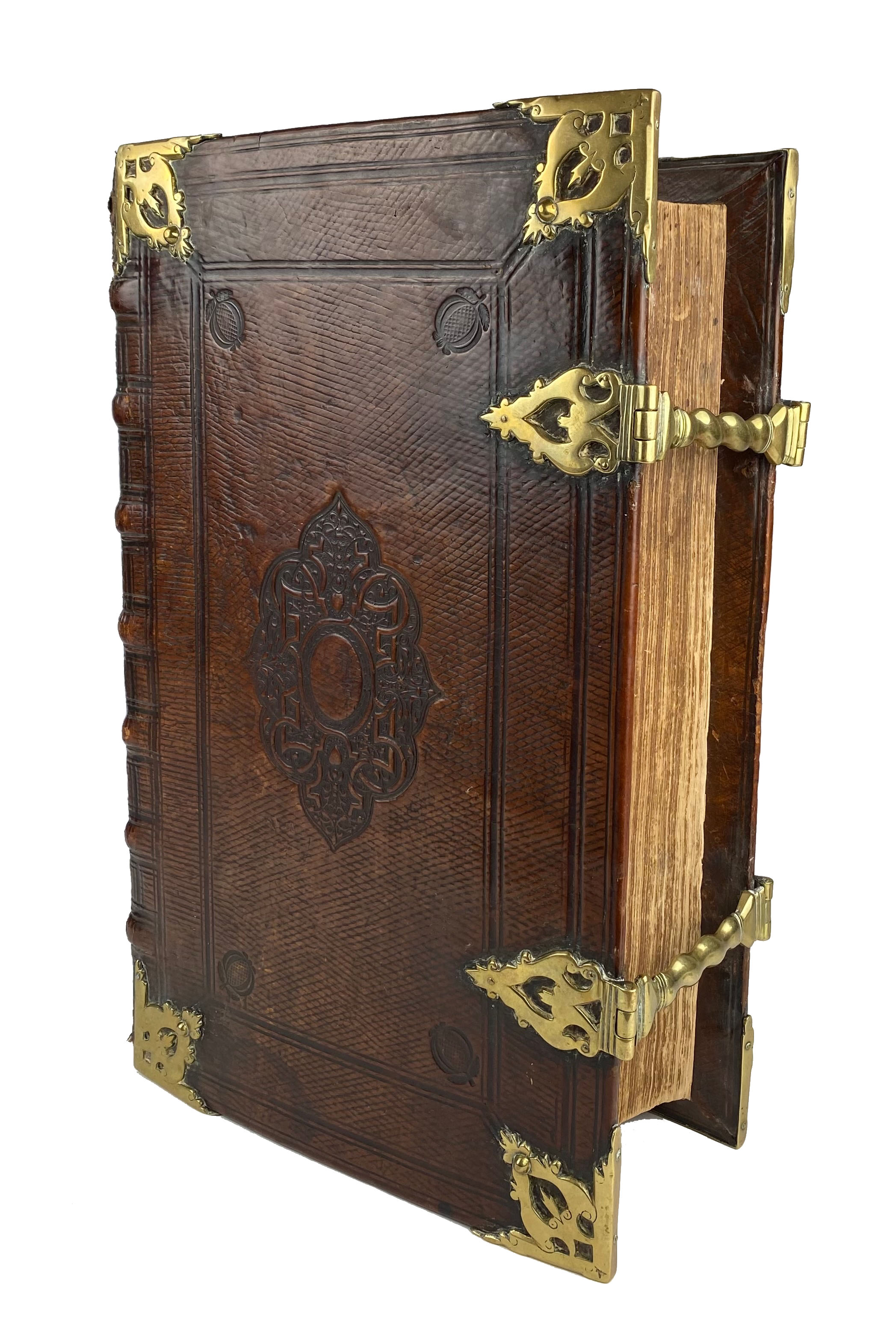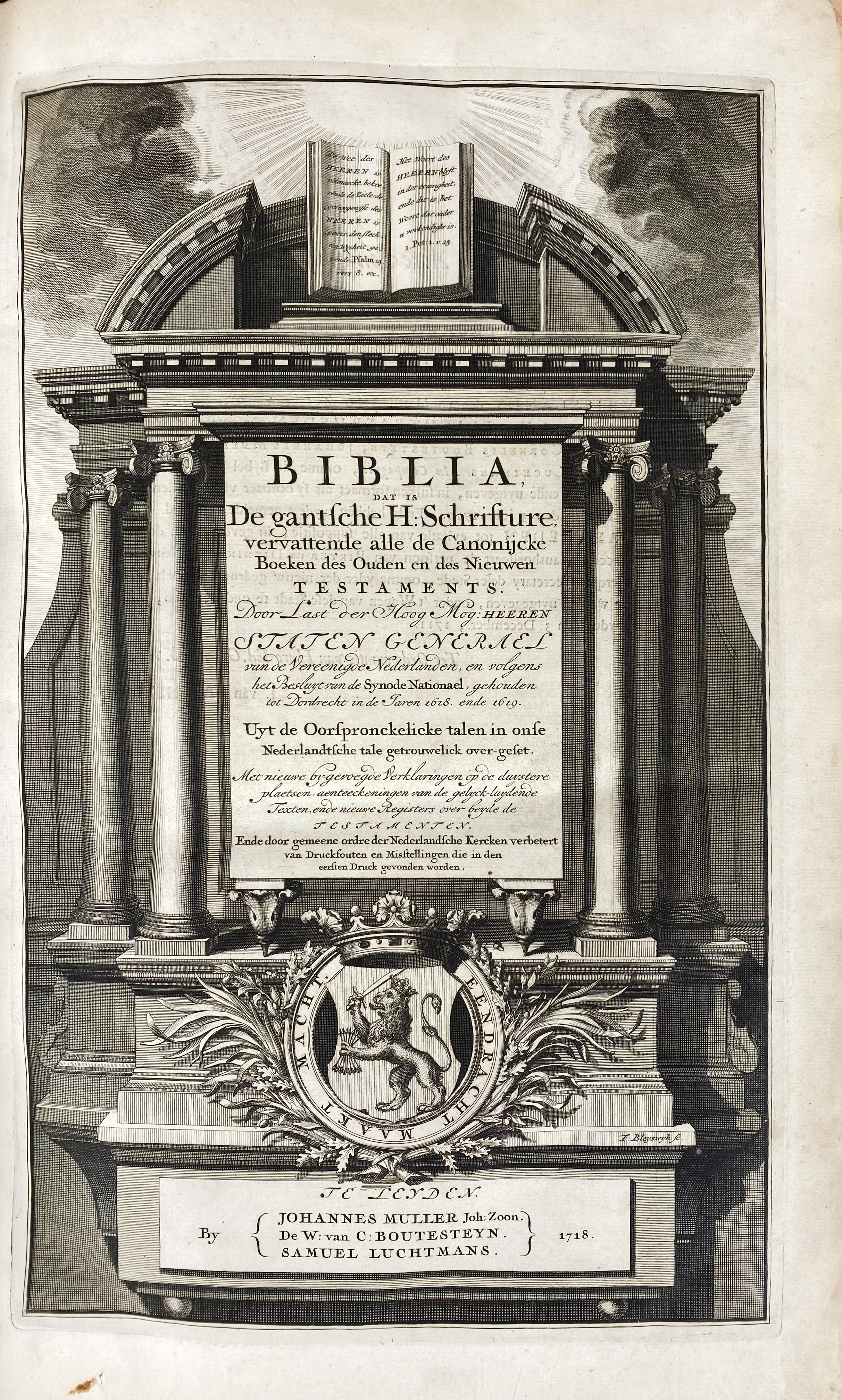 BIBLIA NEERLANDICA -- BIBLIA, Dat is De gantsche H. Schrifture, vervattende alle de Canonijcke Boeken des O. en des N. Testaments. (Met) De Boecken genaemt Apocryphe. Leyden, J. Muller, Wed. C. Boutesteyn, S. Luchtmans, 1718. 3 in 1 vol. (23), 302, (2), 134; (13), 164; (2), 66 lvs. W. engr. title and 6 double-p. maps/plans incl. a world map by A. Schut after C. Danckerts. Fol. Cont. blind tooled cf. over wooden brds. w. raised bands, brass clasps & catches and embossed w. 8 brass cornerpieces. (Top of spine skilfully restored, small hole in lower blank hole of first pp., a few faint marg. stains, sl. age-toned, else a very fine copy with ample margins and the maps in excellent condition).