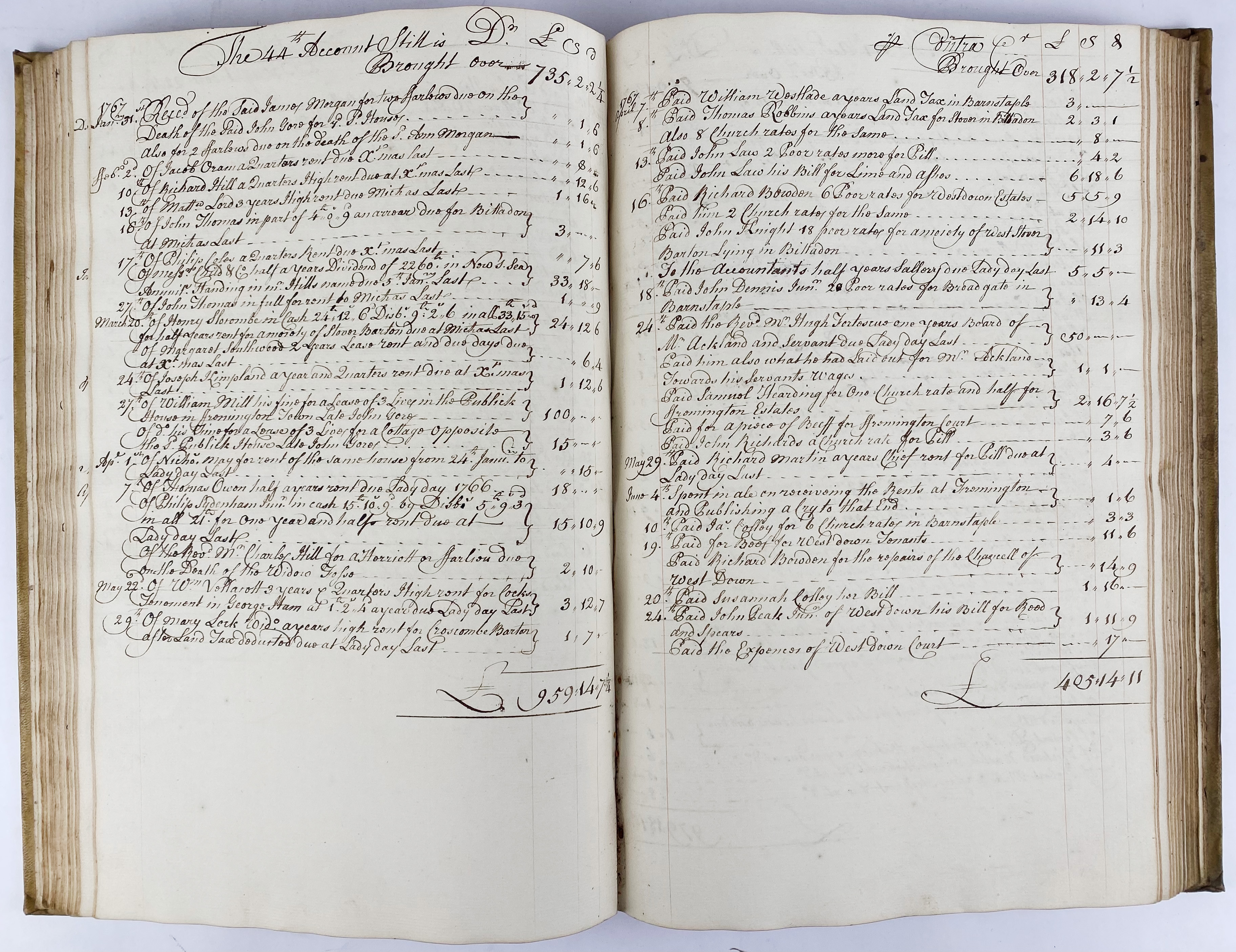 This substantial and detailed volume records over two decades (1746–1767) of estate management on behalf of John Ackland Esq., a major landowner in Somerset. The book is maintained by several persons (i.a. Philip Sydenham, Charles Hill), acting as trustee or estate agent. The accounts include: rents collected from named tenants on multiple estates (Bickham Barton, Tremington, Pill, Stow Barton, Barton Staple); payments for land tax, church rates, window tax, schooling of the poor, and maintenance; payments to local craftsmen: carpenters, blacksmiths, masons, glaziers, shoemakers, etc.; numerous named individuals and families across Somerset and Devon. A rare and extremely well-preserved example of 18th-century estate and trust accountancy, offering rich insight into rural administration, local taxation, social history, and landed wealth in West England.