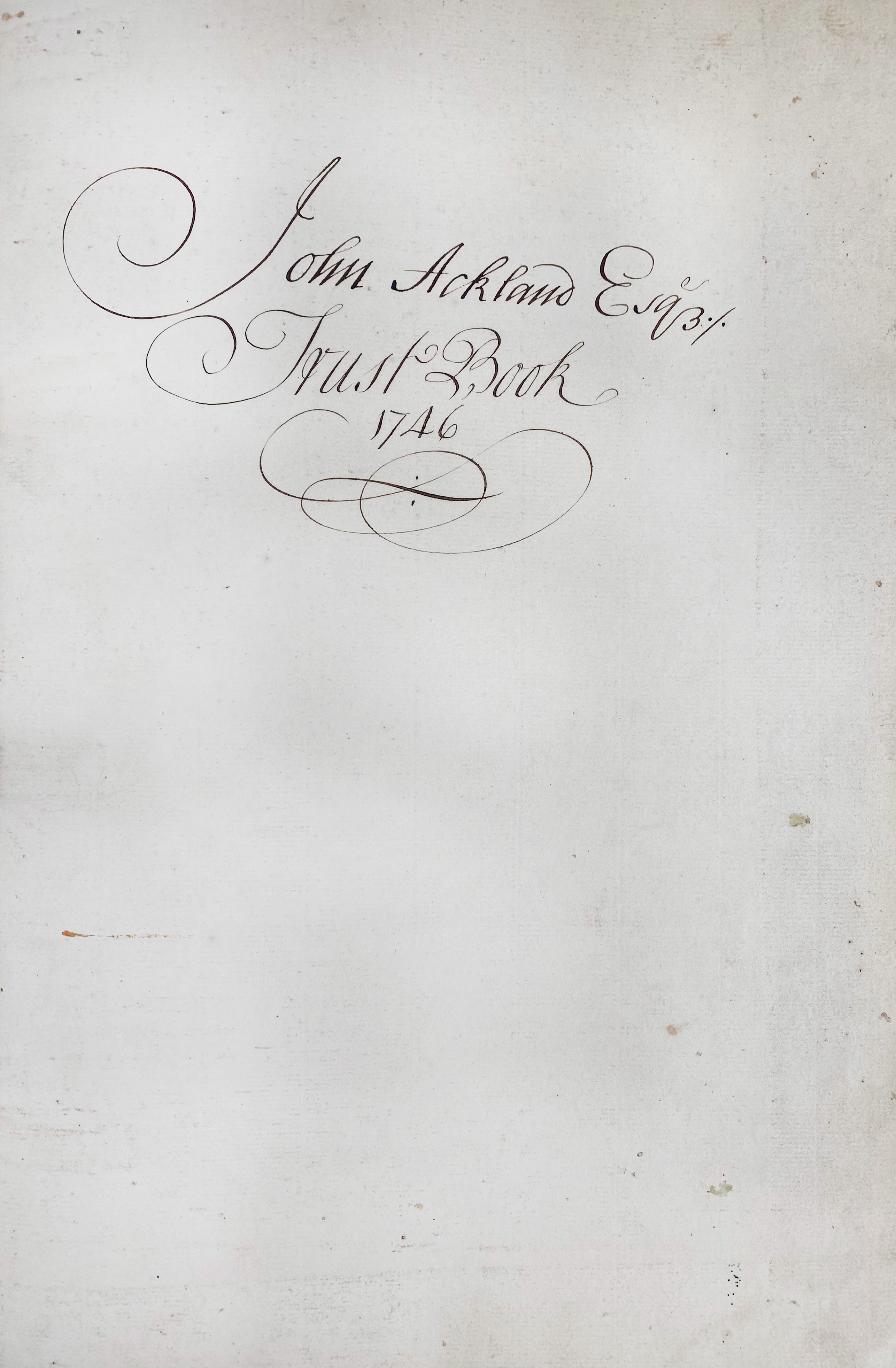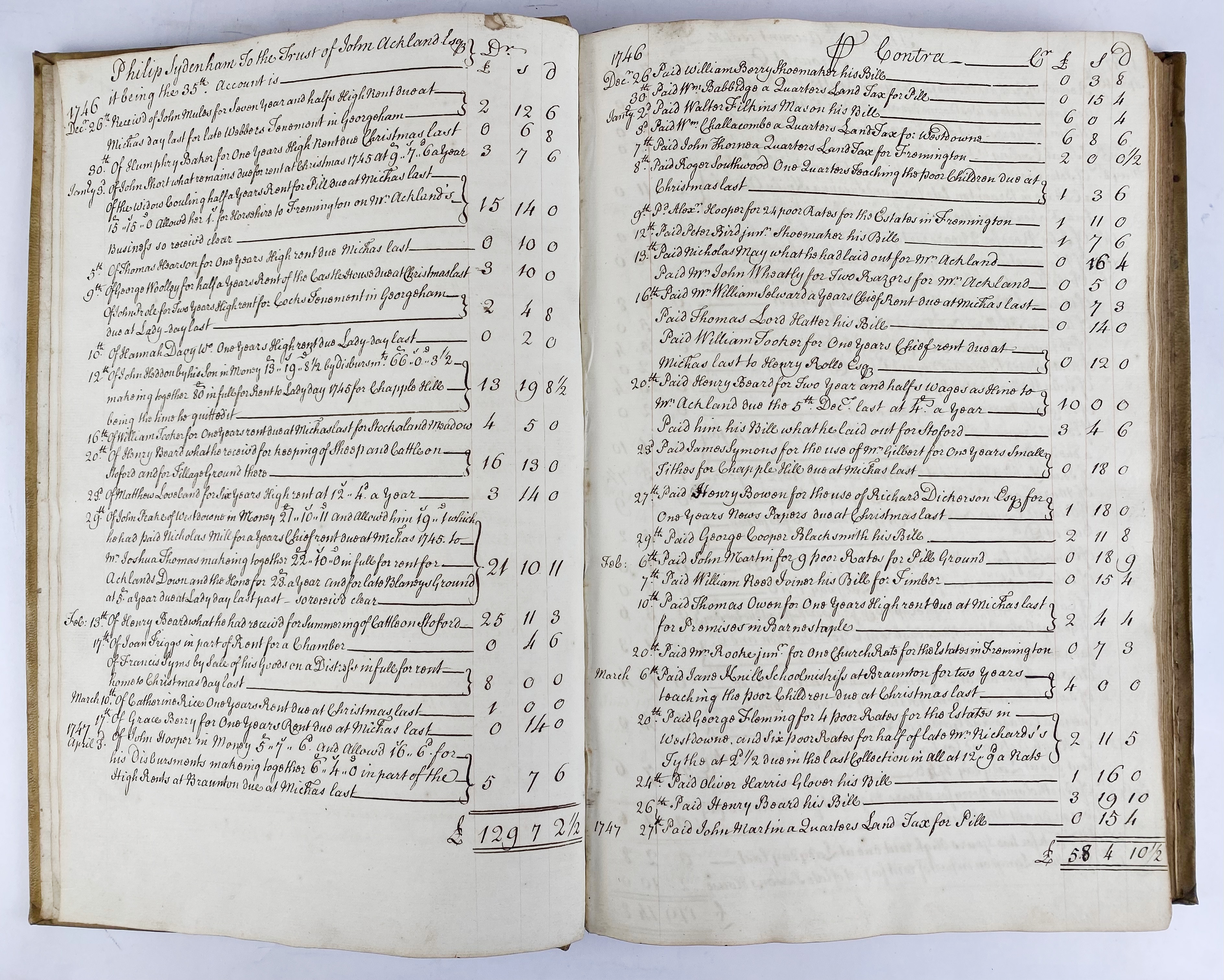 ACCOUNT BOOK of the Trust of John Ackland Esq. Devon/Somerset (likely Wiveliscombe region), 1746–1767. Ca. 190 leaves, of which 86 leaves with manuscript entries in ink, neatly ruled throughout in double columns. Fol. Cont. vellum w. hand-lettered title to upper cover: "The Account Book of J. Ackland Esq., Trustee, begun 26th December 1746." (Vellum a bit soiled).