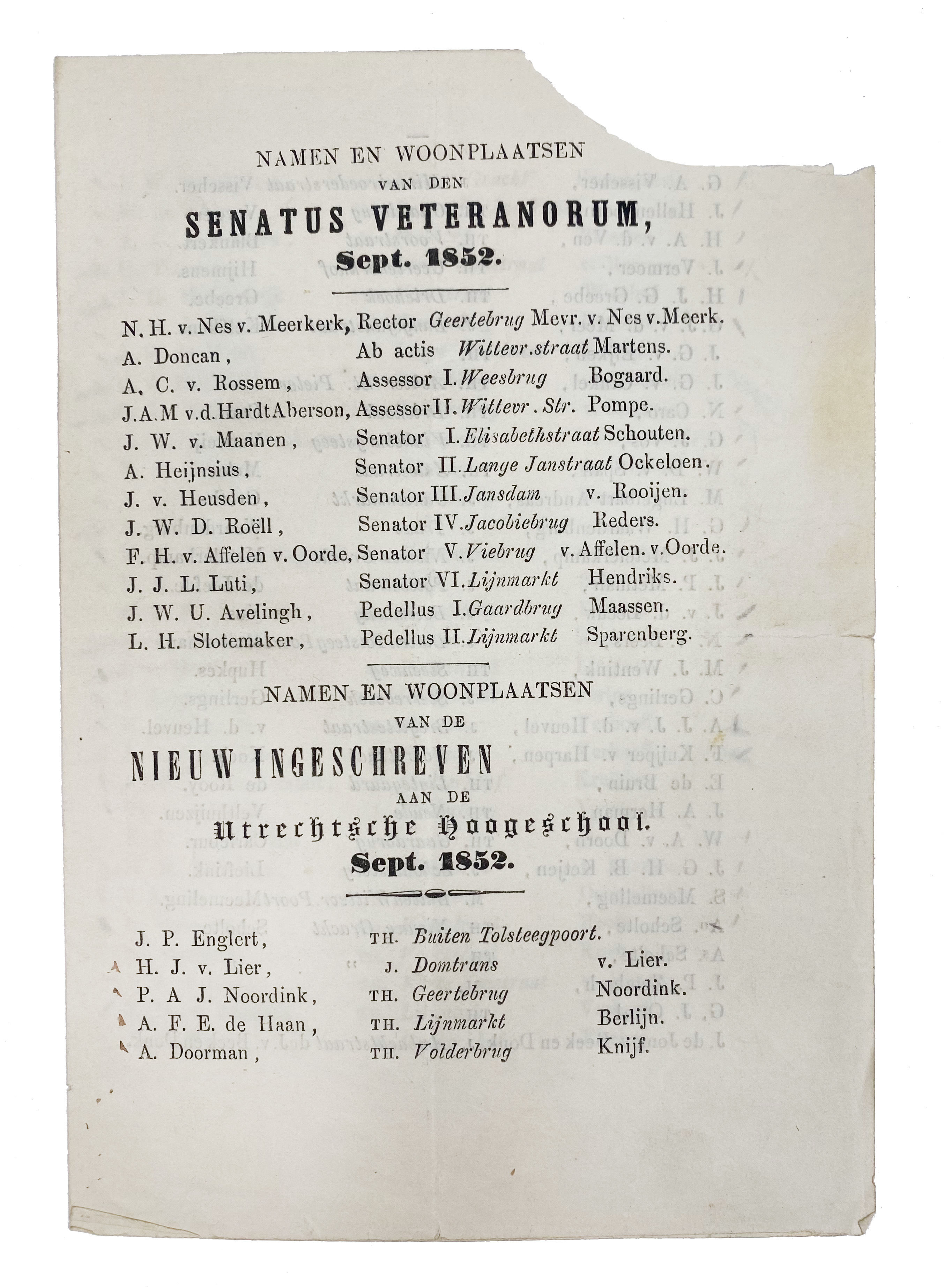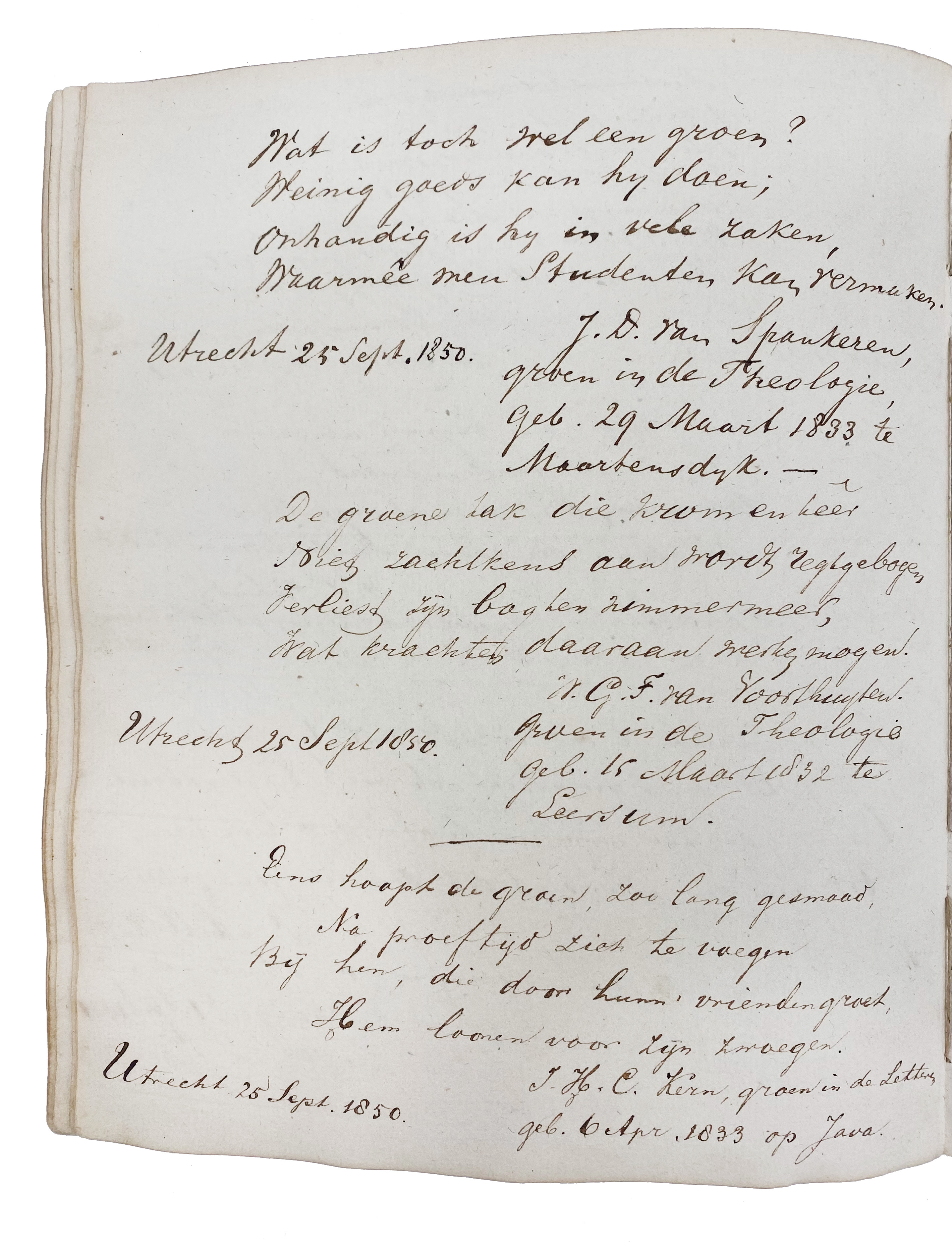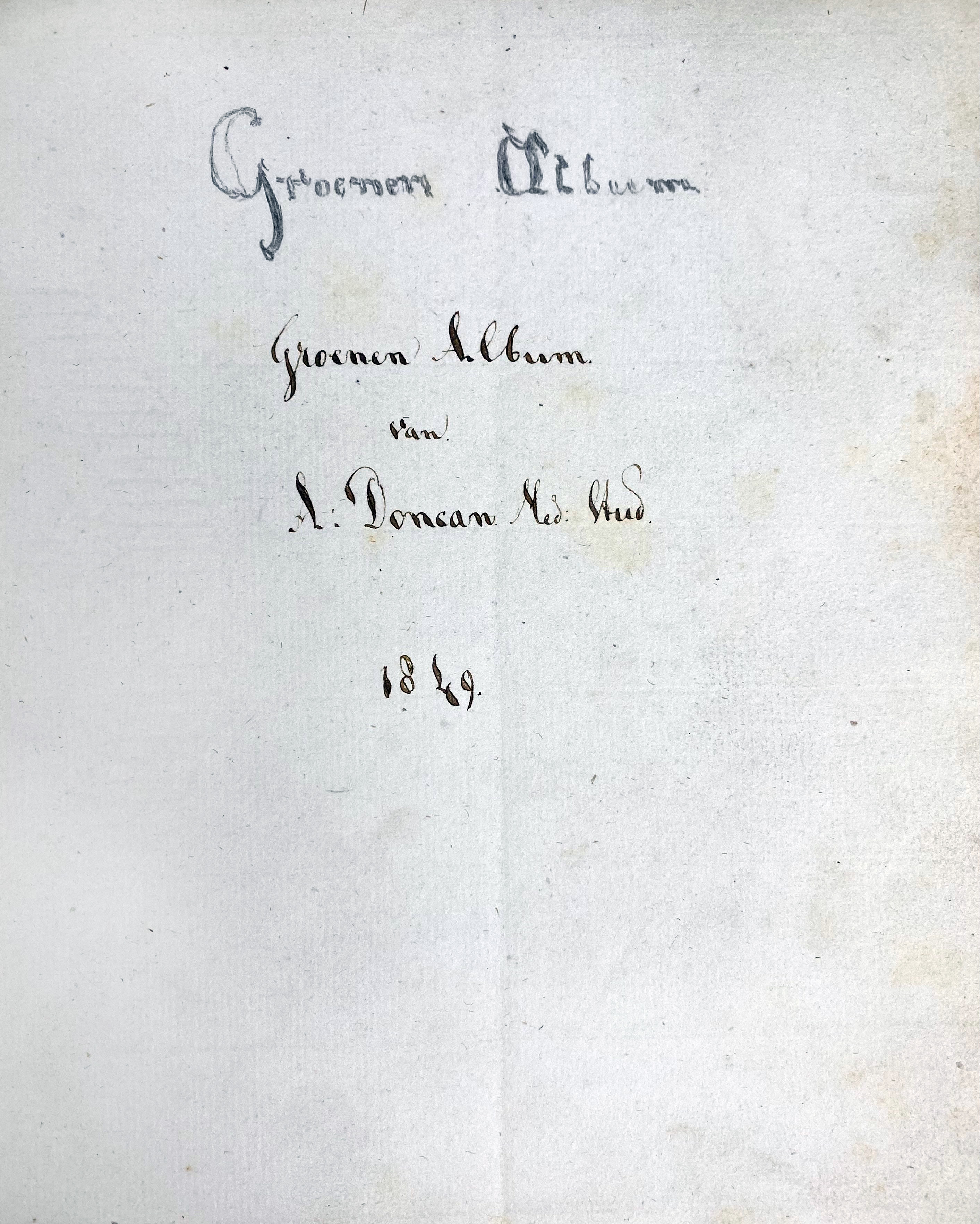 This 'groenen album' belonged to the medical student Andries Doncan (1828–1873), later physician in Wormerveer, who studied at the Utrechtse Hoogeschool between 1849 and 1854. The album contains handwritten contributions from his fellow first-year students. The entries—mostly short poems, humorous verses, and mottoes—refer to student life and especially to the "groentijd", the traditional initiation period for new students. Together they offer a vivid and often playful portrait of the early years of Dutch student culture in the mid-19th century. Inserted in the album is a printed list of the "Senatus Veteranorum" of September 1852, naming Doncan as Ab actis (secretary) of the student senate, with his address on Wittevrouwenstraat. - Contributions by i.a.: Allard Pierson, Hendrik Kern, A.W. de Klerck, F.L. Snouck Hurgronje, L.G. Roijaards, J.H. Strick van Linschoten, A.J. Begemann, W.A.J. Schimmelpenninck van der Oije, A.W.L. Talma, P. H. Hugenholtz, P. A. de Bruine, etc.