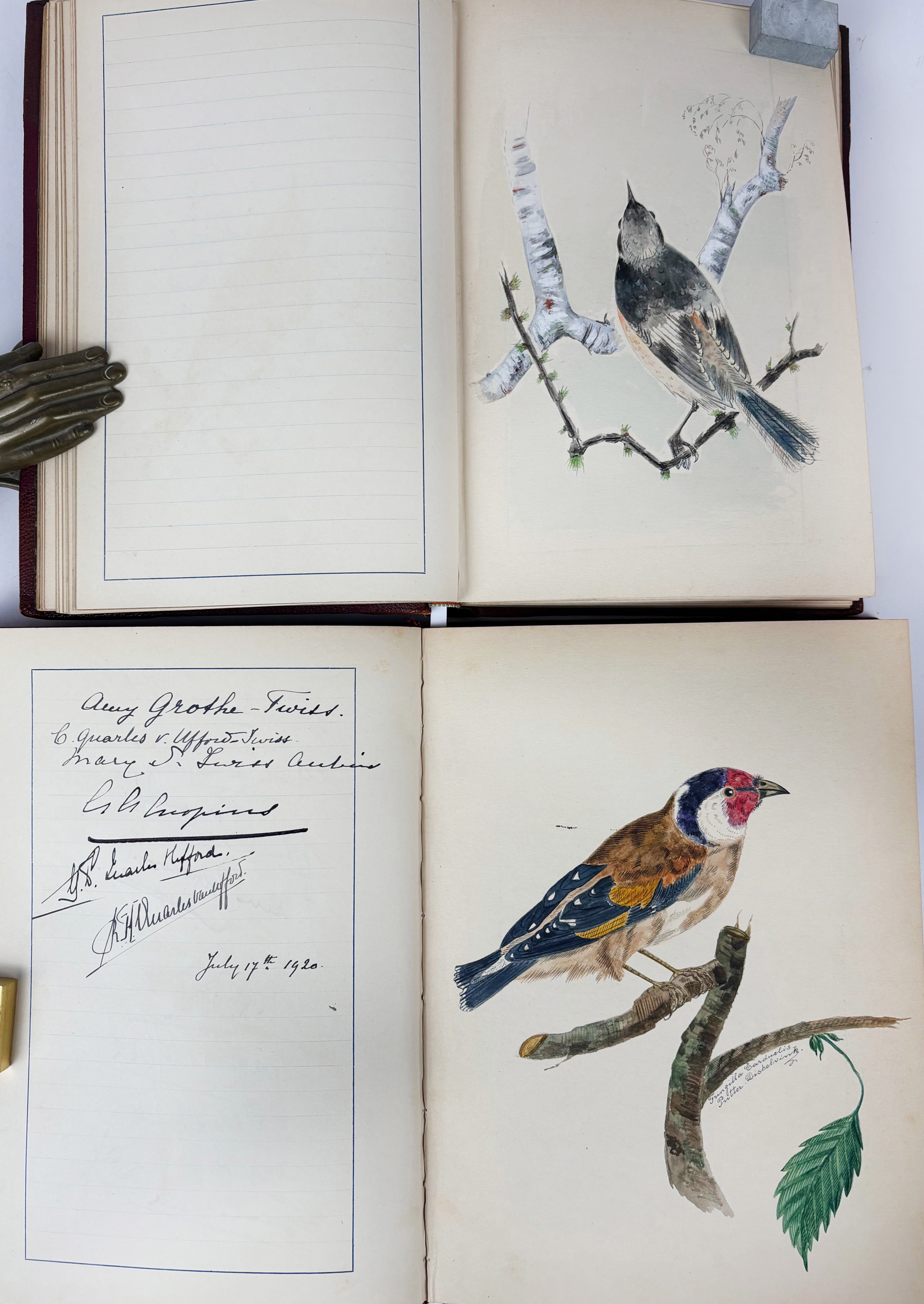 BEUKENBURG - QUARLES VAN UFFORD-TWISS, Clara Catharina May (1867-1927). "My verses/For my own dear sister [Amy]". Beukenburg, begun and ended February 24 - May 23, 1918. 80 lined paper lvs., r° and v°. Poetry album, containing a collection of hand written poems in English and German, tog. w. 16 very fine full-p. water colour drawings of birds by the same hand. 8°. Cont. red h. mor. w. 'Amy's book' gilt lettered on the spine, a.e.g. -- Added: "Zusje's Guestbook", a similar album, but here with literary quotations which are followed by numerous signatures of relatives and friends. Period 1915-1945. 46 lined paper lvs., r° and v°. W. 37 full-p. watercolours of birds. Sm-4°. Cont. mor. -- (2).