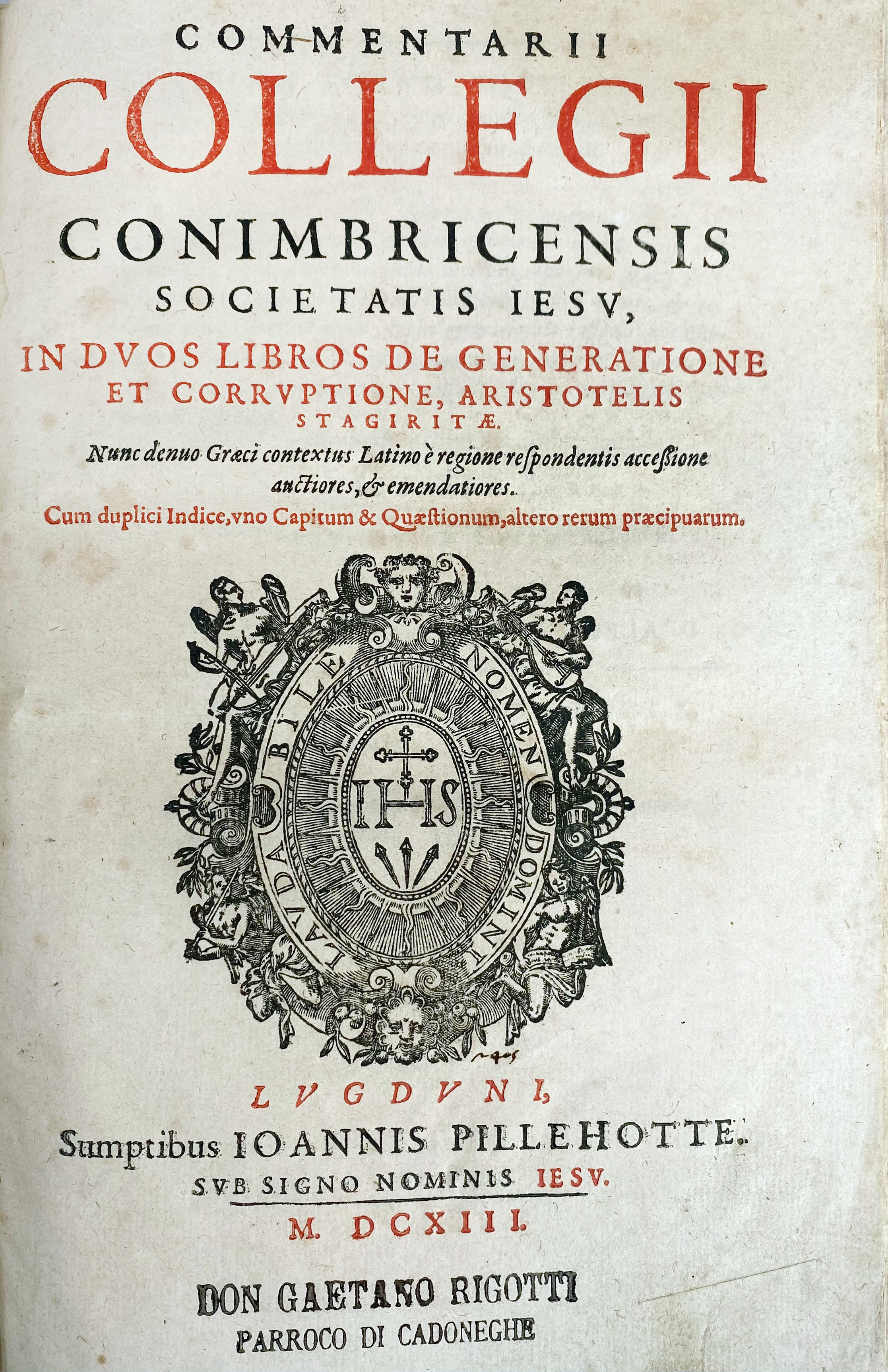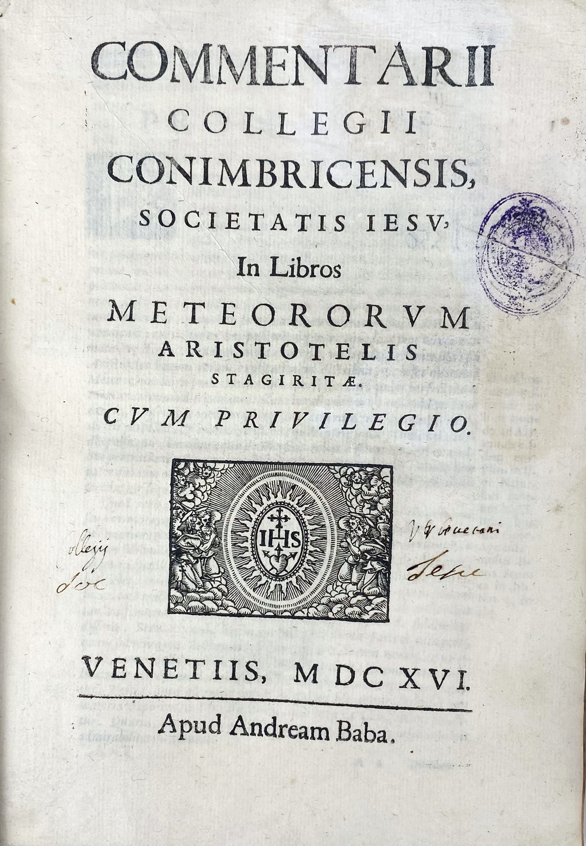 ARISTOTELES -- COMMENTARII Collegii Conimbricensis Soc. Iesu. In duos libros De Generatione et Corruptione Aristotelis Stagiritæ. Lyon, J. Phillehotte, 1613. (12), 537, (26) pp. Mod. h. vellum w. gilt lettering. (Stamp on ti., a bit browned/foxed). -- COMMENTARII Collegii Conimbricensis Soc. Iesu. In libros Meteororum. Venice, A. Baba, 1616. 76 pp. Cont. limp vellum. (W. stamps). -- And 1 o. Aristotle commentary (no bind.). (3).
