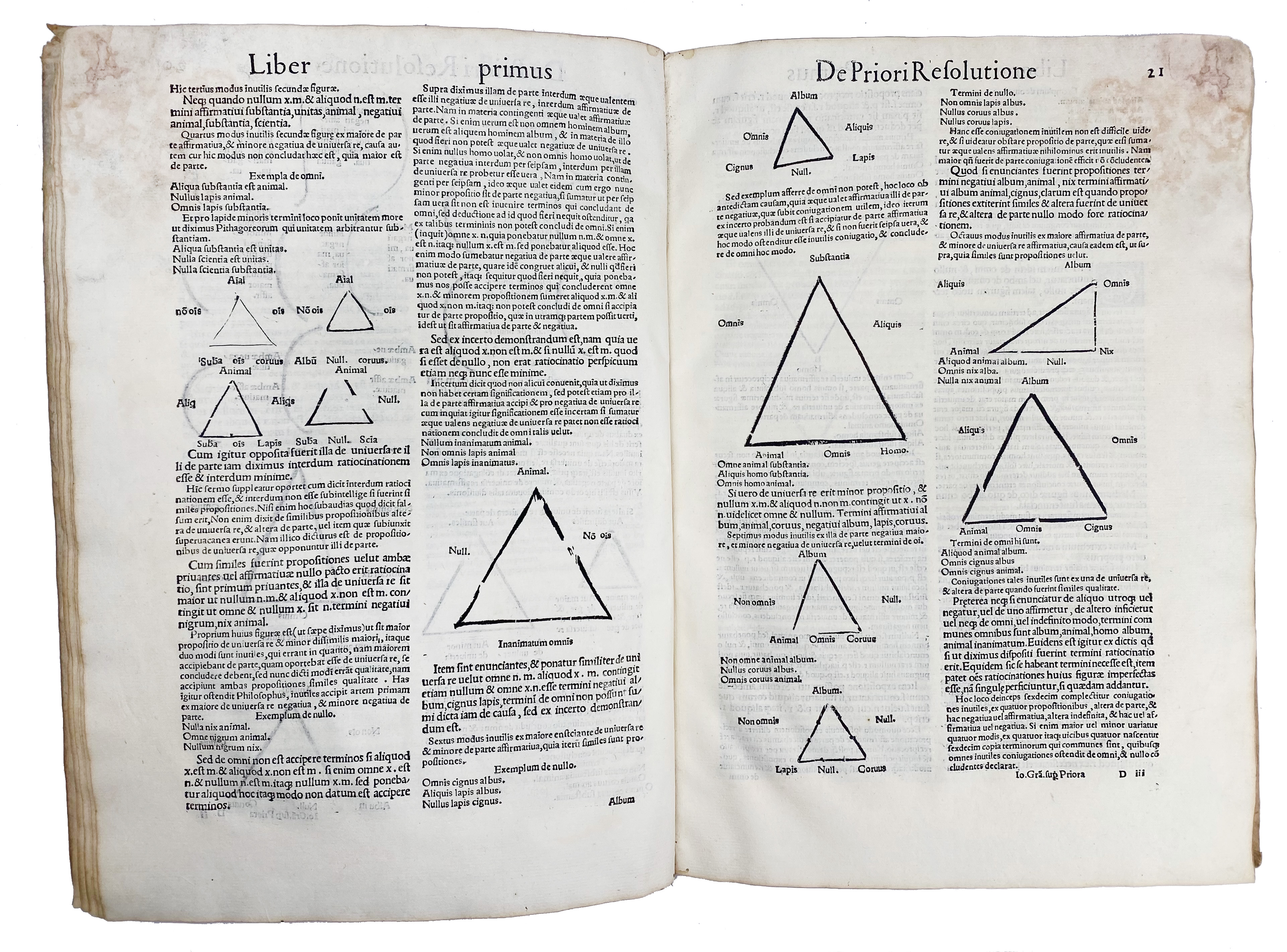 ARISTOTELES -- PHILOPONUS, JOANNES GRAMMATICUS. In libros priorum resolutivorum Aristotelis commentariae annotationes. Venice, H. Scotus, 1548. 84 lvs. W. woodcut printer's device on ti., charming woodcut initials & num. text-diagrams. Fol. Cont. vellum. (Bind. soiled and a bit warped, ties fail, first lvs. wormholed, w. sm. stamps, upper outer corner moulded throughout).