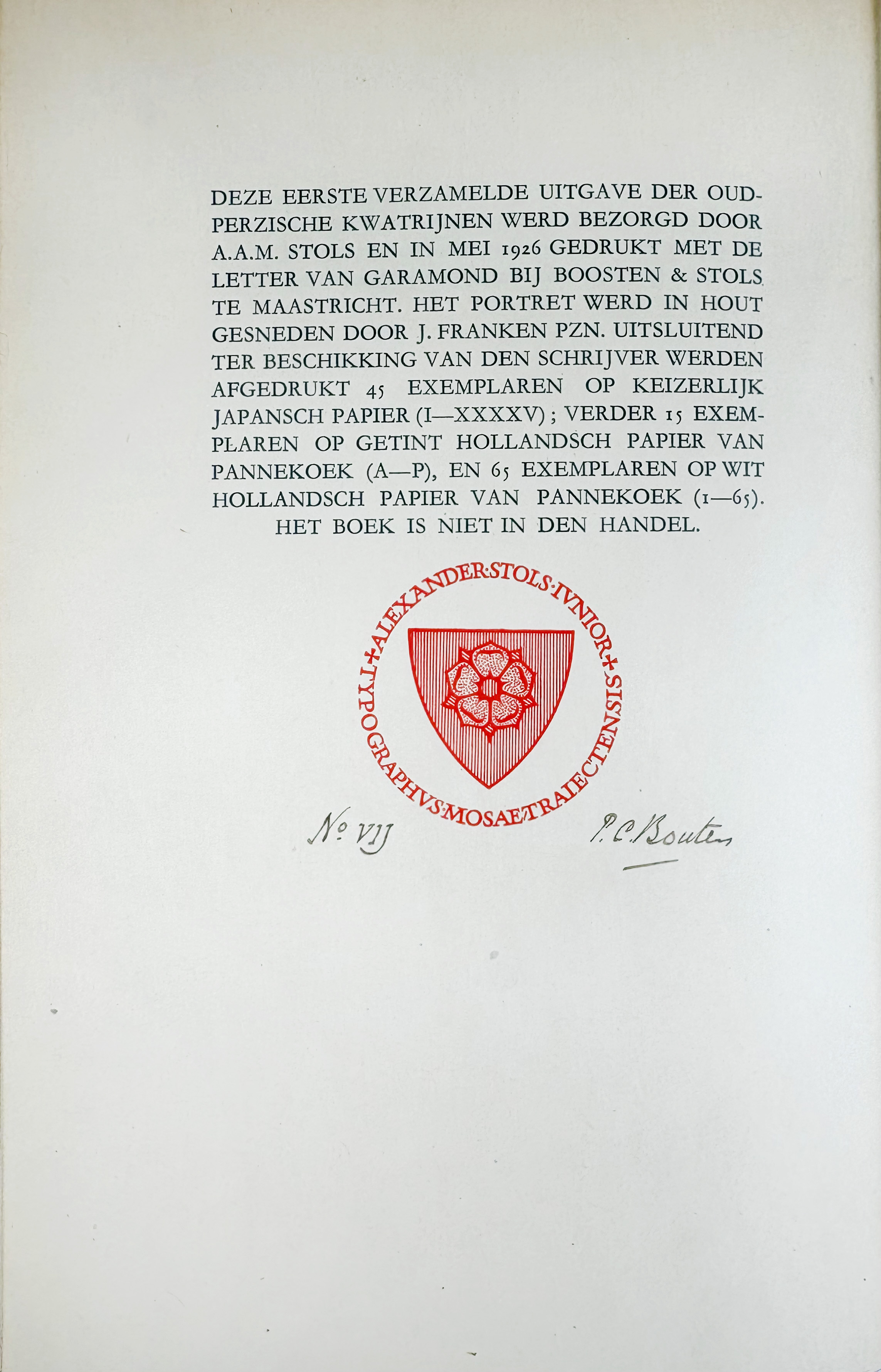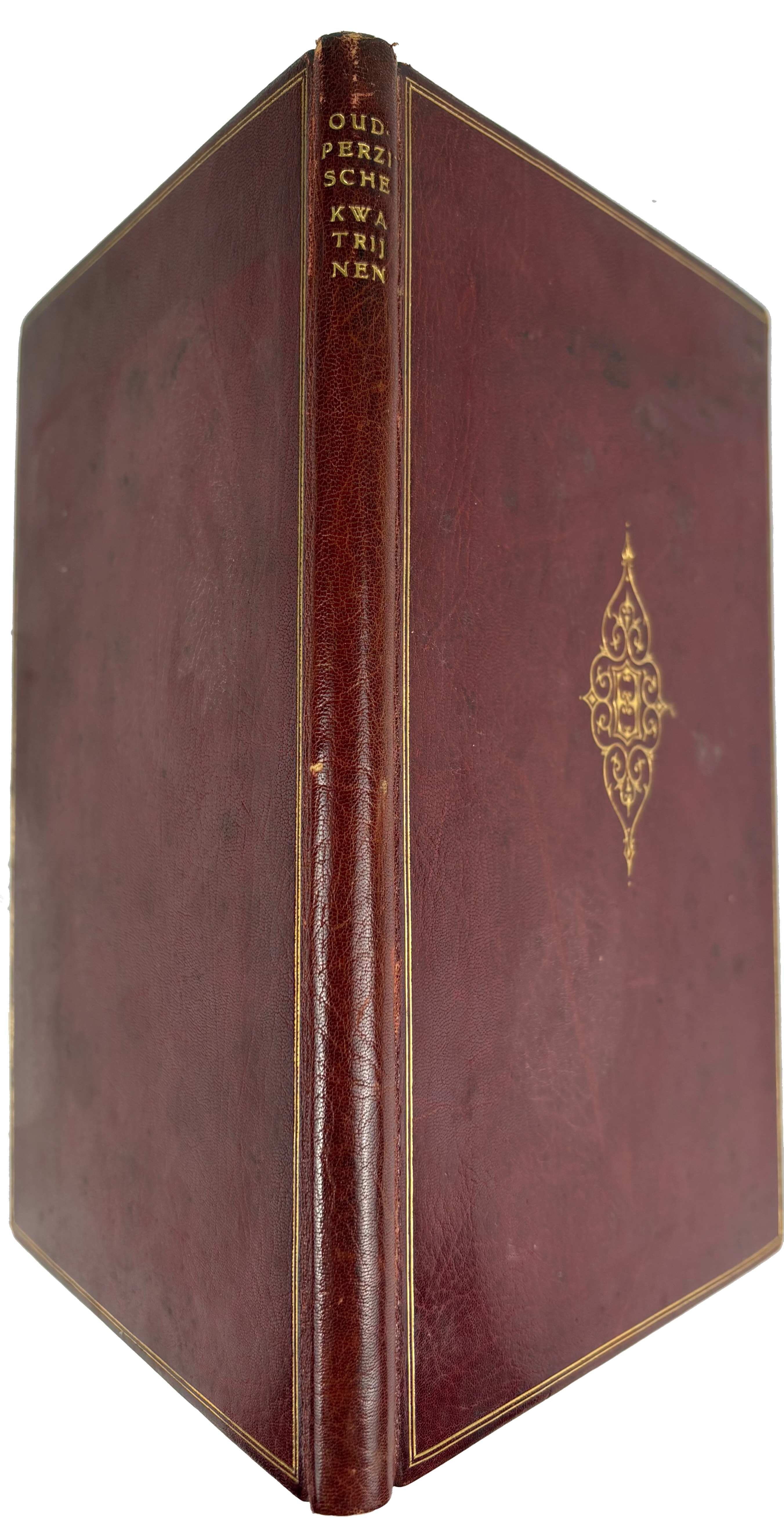 BOUTENS, P.C. Oud-Perzische kwatrijnen. 's-Grav., A.A.M. Stols, 1926. 108 pp. W. woodcut front.-portr. by J. Franken Pzn. Cont. red mor. (not signed), covers framed w. double gilt fillet along borders, gilt central vignette on front side, spine lettered in gilt, gilt mor. turn ins w. corner tooling enclosing marbled paper paste downs, marbled endpapers, uncut, t.e.g. (Bind. very lightly chafed in places, some minor browning to text in places).