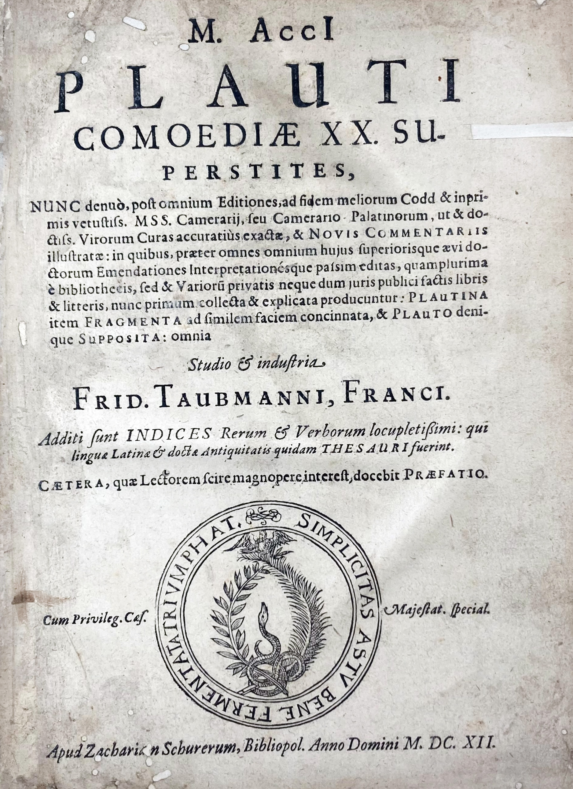 Friedrich Taubmann (1565-1613) has greatly contributed towards the restoration of the true text of Plautus. This second edition is called "a most excellent one" by Harwood. - Schweiger II, p. 765; Dibdin II, 315; Sandys II, 362.