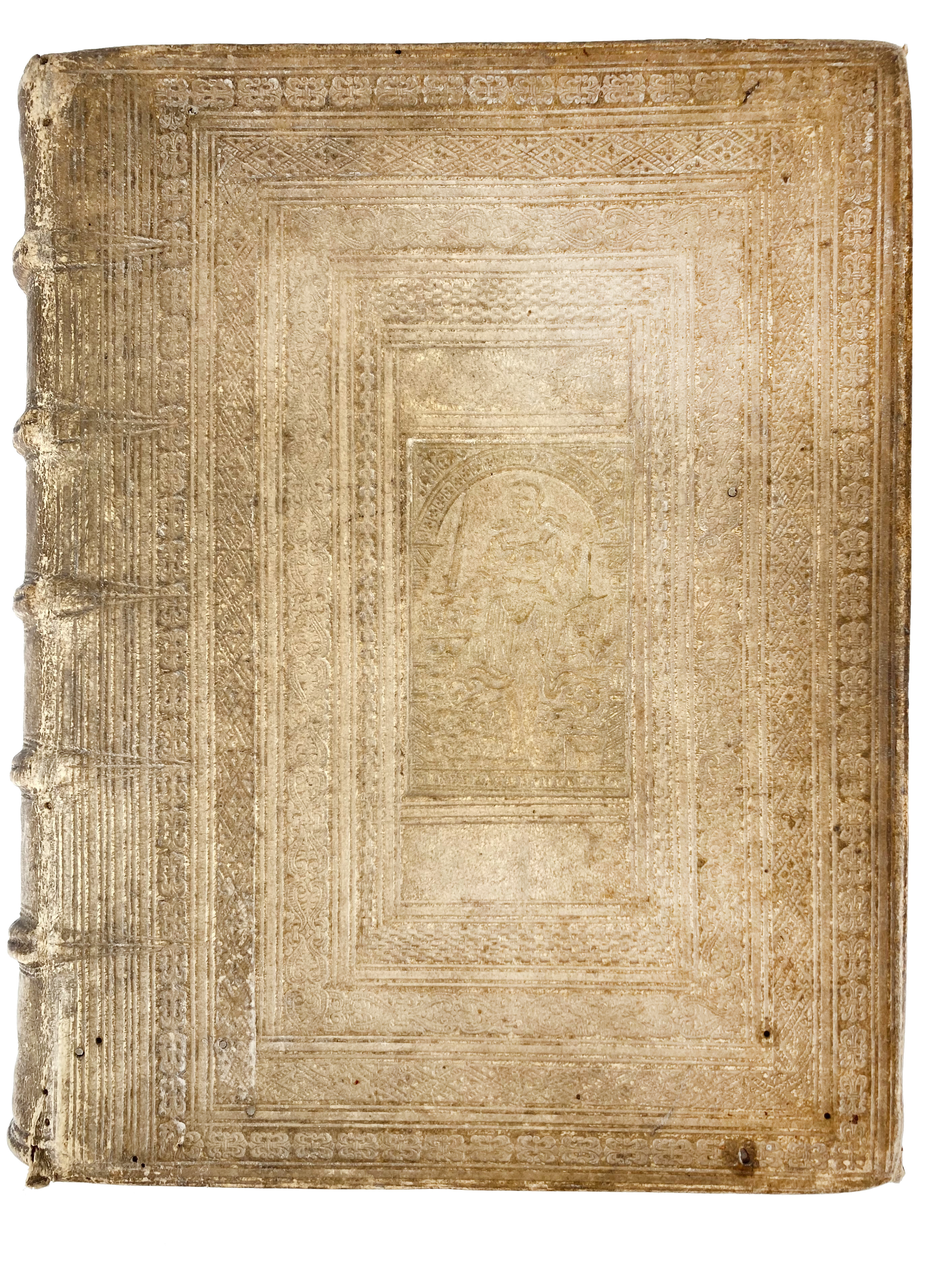 PLAUTUS. Comoediæ XX superstites. Studio & industria F. Taubmanni. (Wittenberg), Z. Schurer, 1612. (40), 1320, (124) pp. W. woodcut printer's mark on ti. & at the end. 4°. Cont. pigskin, spine w. raised bands, richly blindstamped sides w. emblem of Justice signed "Andreas Hunefeld" in the middle. (Title handwritten (but faded) on spine, upper joint w. small break at the bottom, Ex Libris N.A.L. Vreeken on first free end-p., upper joint broken, title-p. & first 4 lfs reinforced w. paper, some (mostly marginal) wormholes).