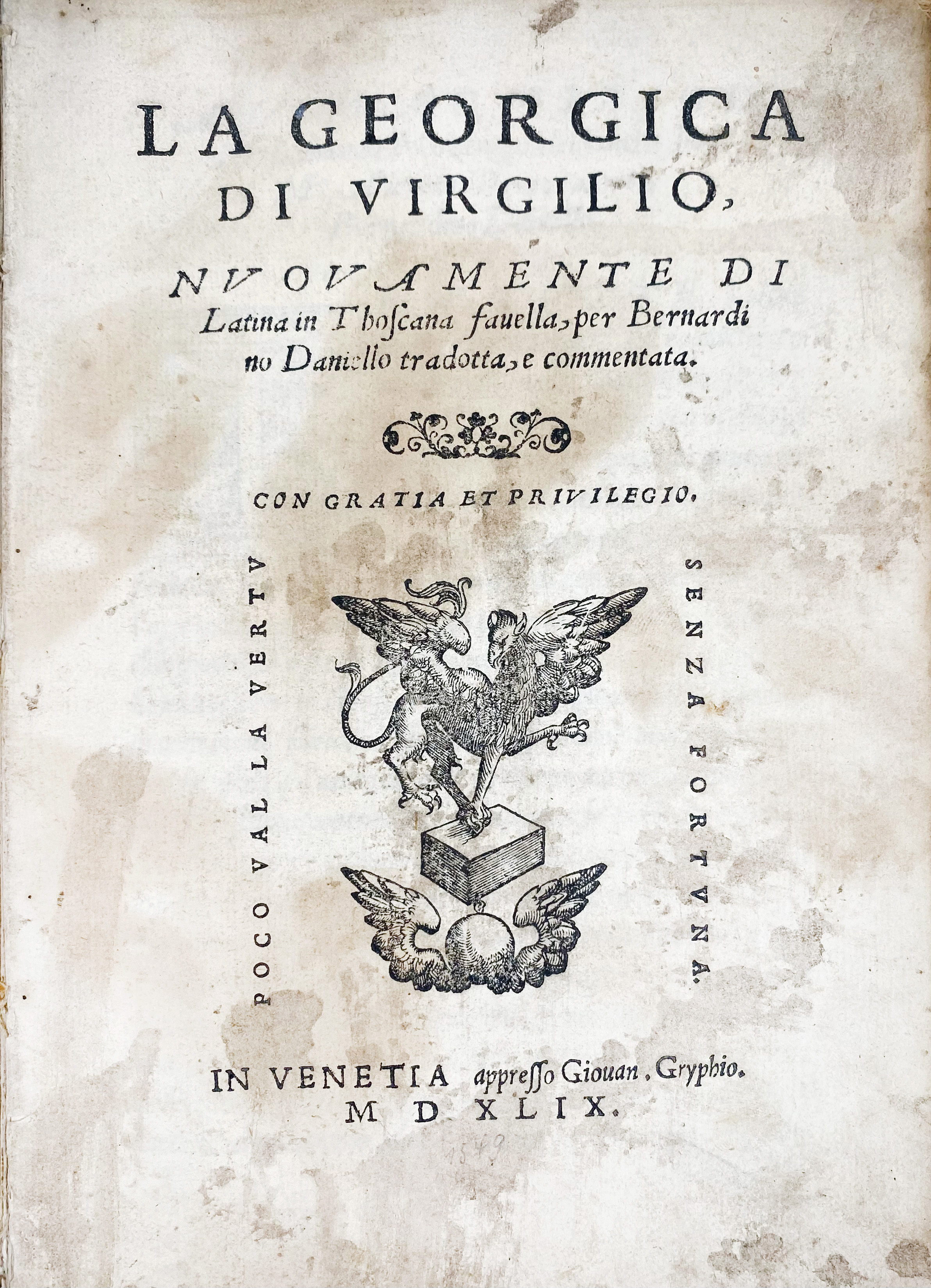 VERGILIUS. La Georgica. Nuovamente di latina in Thoscana favella, per B. Daniello trad. e comm. Venice, G. Gryphius, 1549. (8), 105, (1) lvs. W. 4 charming woodcut ills. & 4 woodcut initials. 4°. Cont. limp vellum. (Vellum stained, ties lack, first free endpaper loose, first quire loosening, ti.-p. stained, some light waterstains in places).