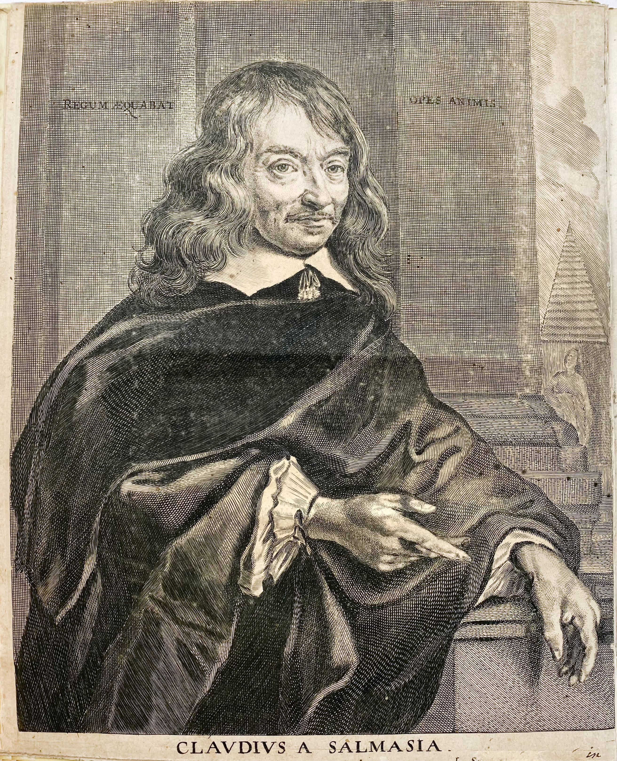 SALMASIUS, Cl. Epistolarum liber primus. Acced. De laudibus et vita ejusdem prolegomena. Accur. A. Clementio. [and: Ad Aegidium Menagium Epistola super Herode Infanticida (...), and: Epistola de suburbicariis regionibus et ecclesiis]. Leyden, A. Wyngaerden, 1656. (8), lxxii, 294, (2), 77, (1), 67, (1) pp. W. engr. portr. of the author. 4°. Cont. vellum. (Lower board edge dam., ti-p. a bit soiled, upper margin first lvs. repaired).
