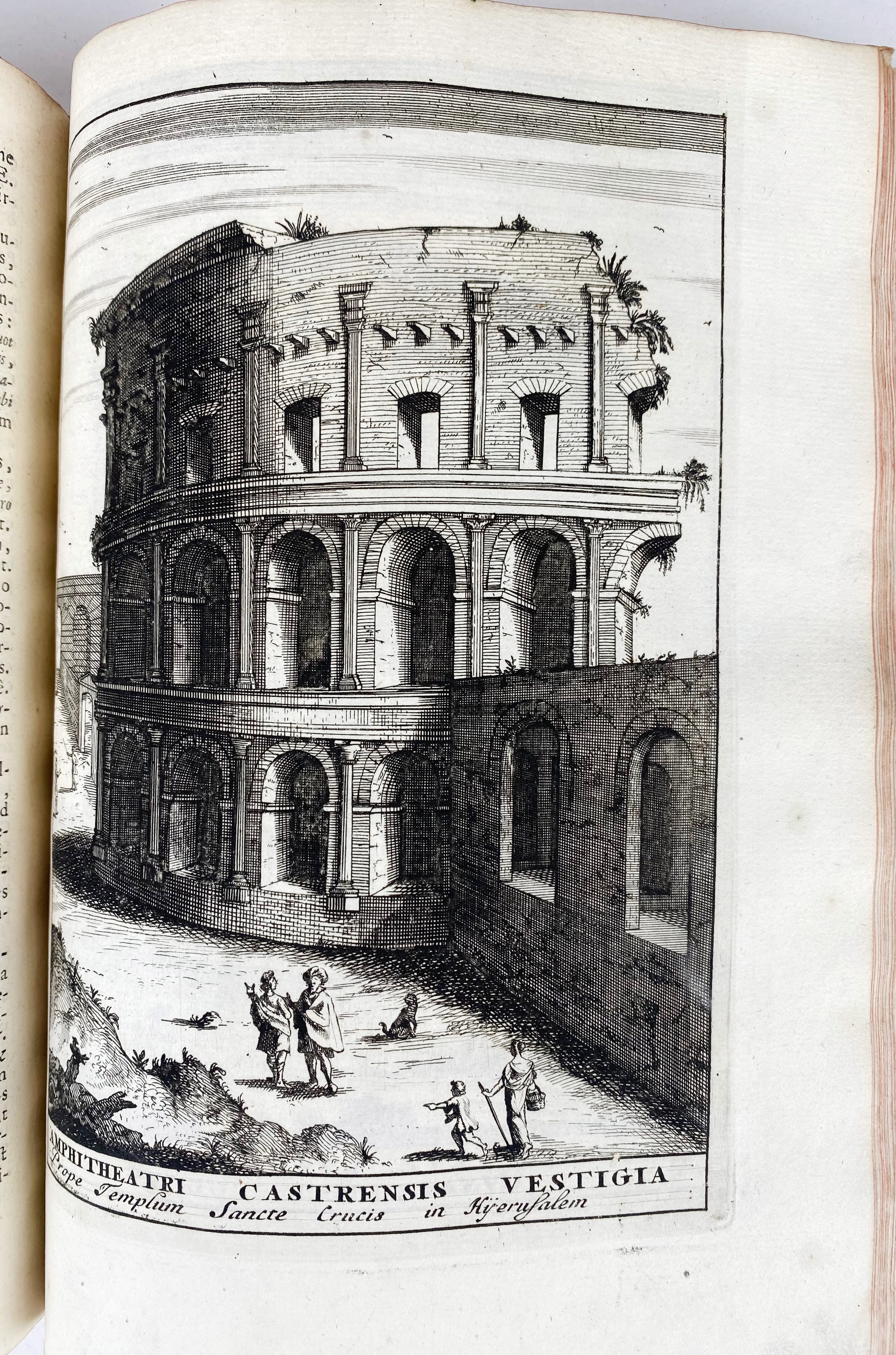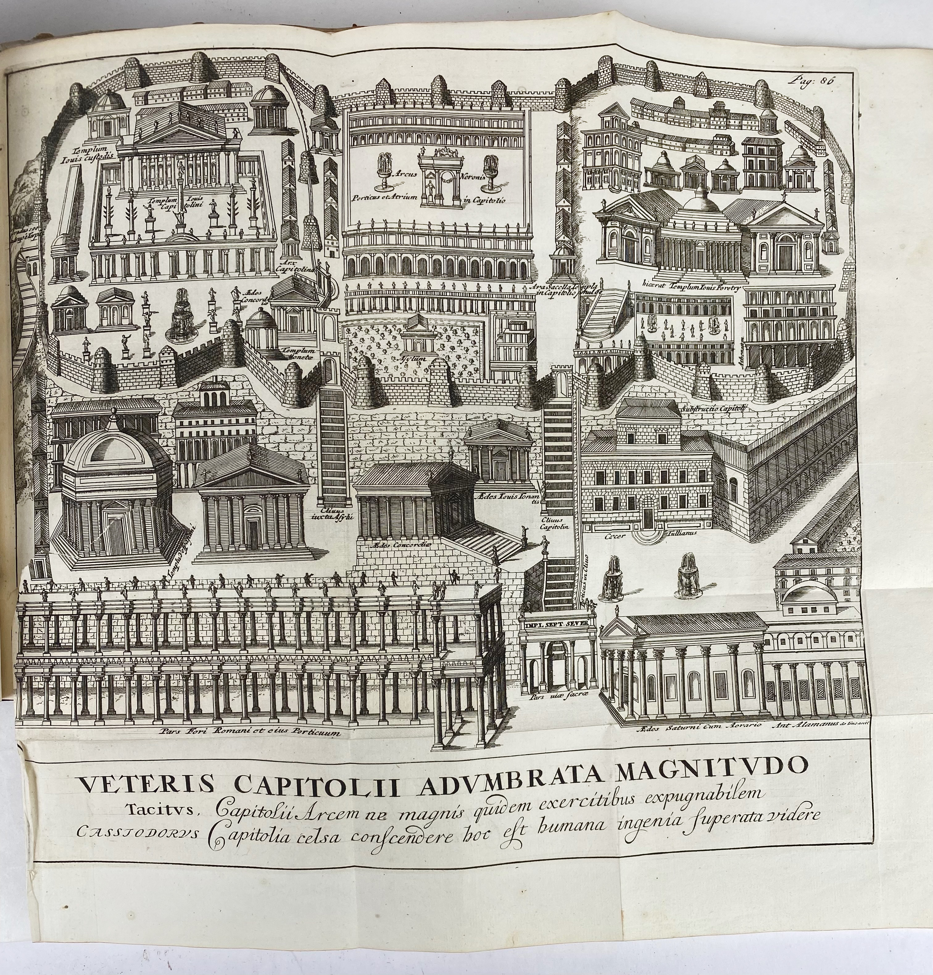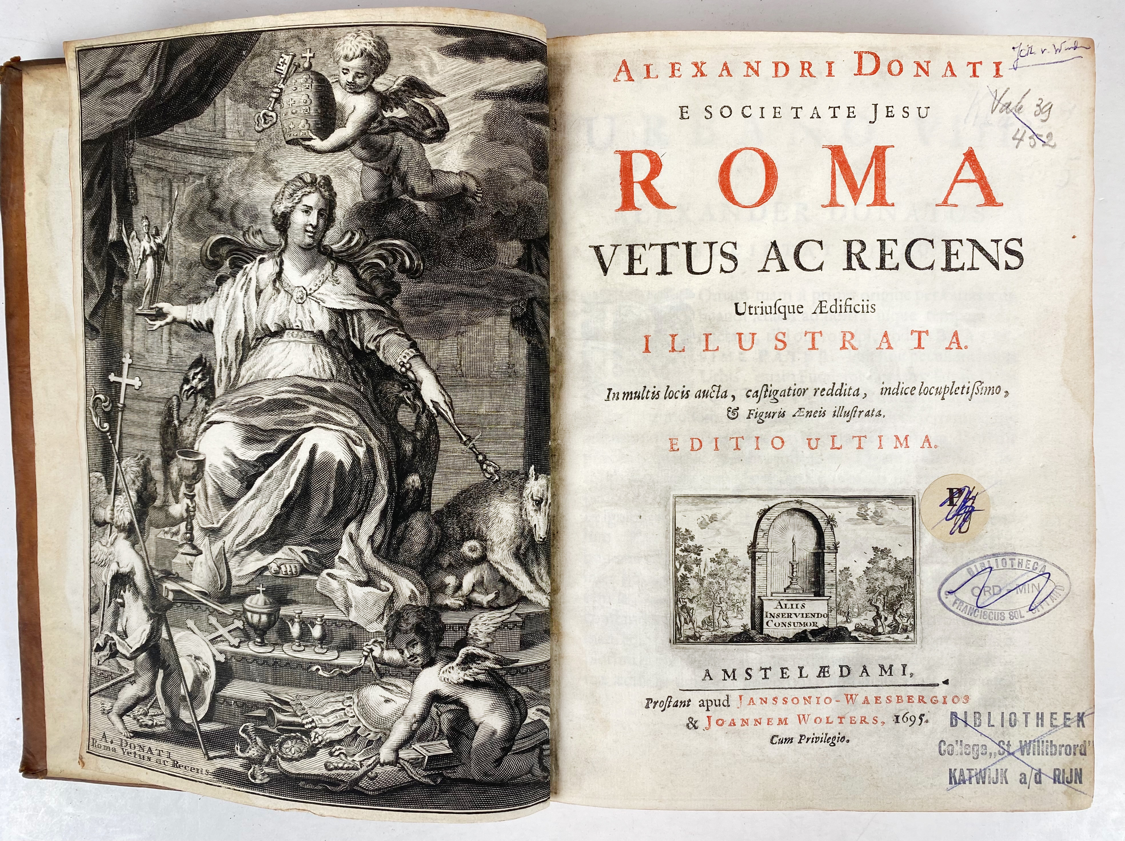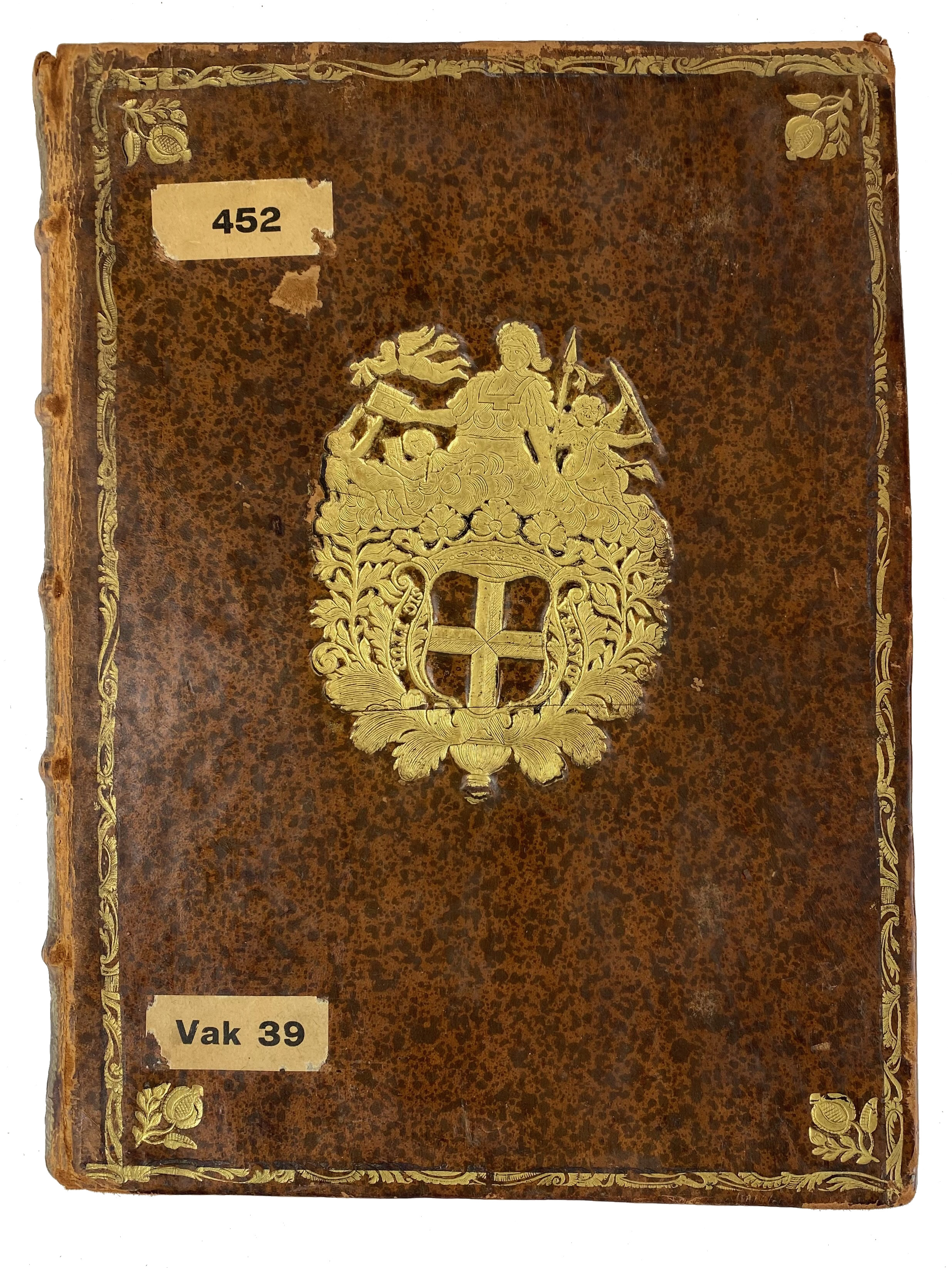 AMERSFOORT -- DONATUS, A. Roma vetus ac recens utriusque ædificiis illustrata. Ed. ultima. Amst., Janssonius-Waesbergius & J. Wolters, 1695. (16), 356, (20) pp. W. engr. front., 92 (4 fold.) engr. plates & num. text-engrs. 4°. Fine cont. mottled cf. w. raised bands, dec. gilt back, gilt coat of arms of Amersfoort on both sides, surrounded by a gilt border & corner fleurons, red edges. (Spine label lacks, libr. tickets on front cover, libr. stamps on ti., without prize, upper margin of a few lvs. a bit wormholed, one leaf w. tear and frayed outer margin, else a fine copy).