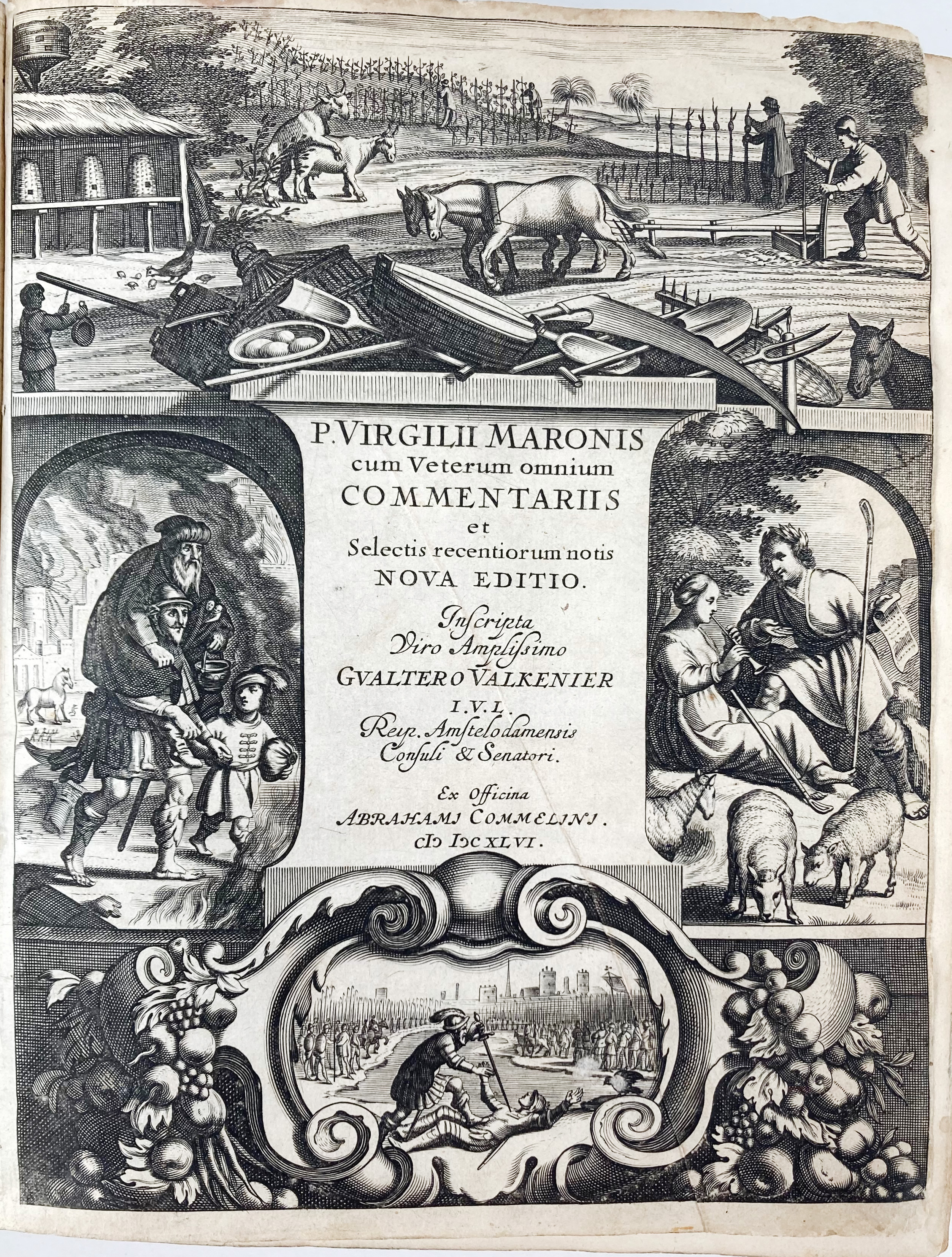 AMSTERDAM -- VERGILIUS. (Opera). Cum veterum omnium comm. et selectis rec. notis. Nova ed. Inscripta (...) G. Valkenier. (Leiden), A. Commelin, 1646. (16), 996 pp., index. W. engr. ti. 4°. Cont. vellum, spine w. raised bands, sides ruled in gilt w. gilt coat of arms of Amsterdam on both sides, overl. sides. (Some shelfwear to bottom, ties fail, endpapers replaced, neat underscoring in old ink throughout, a few notes in an old hand).