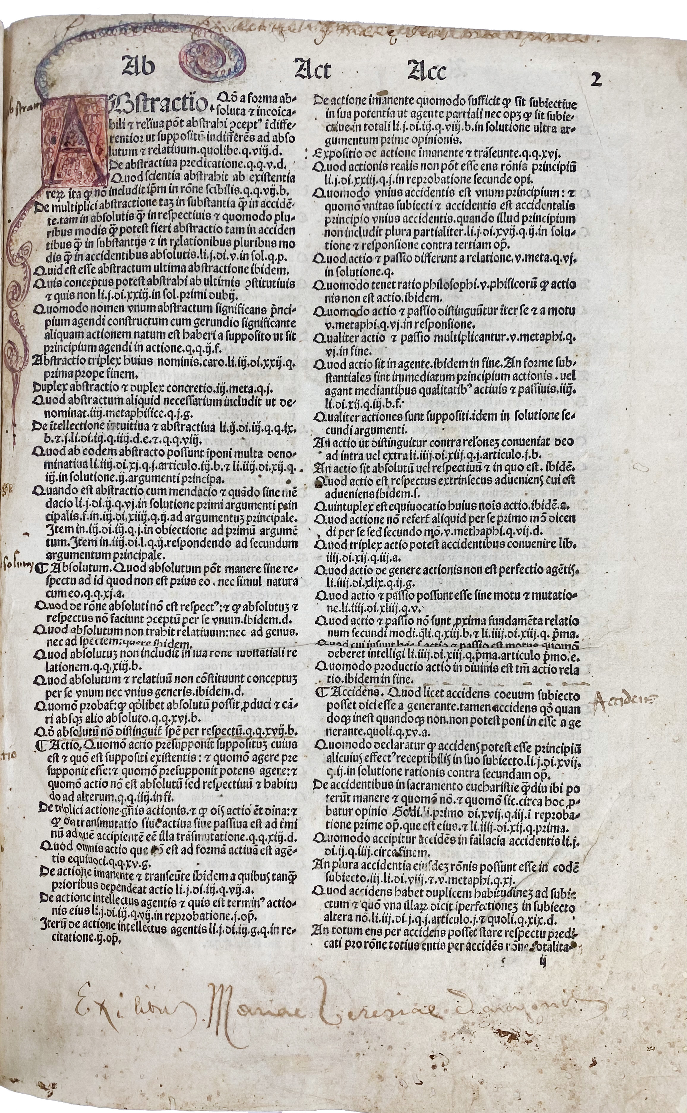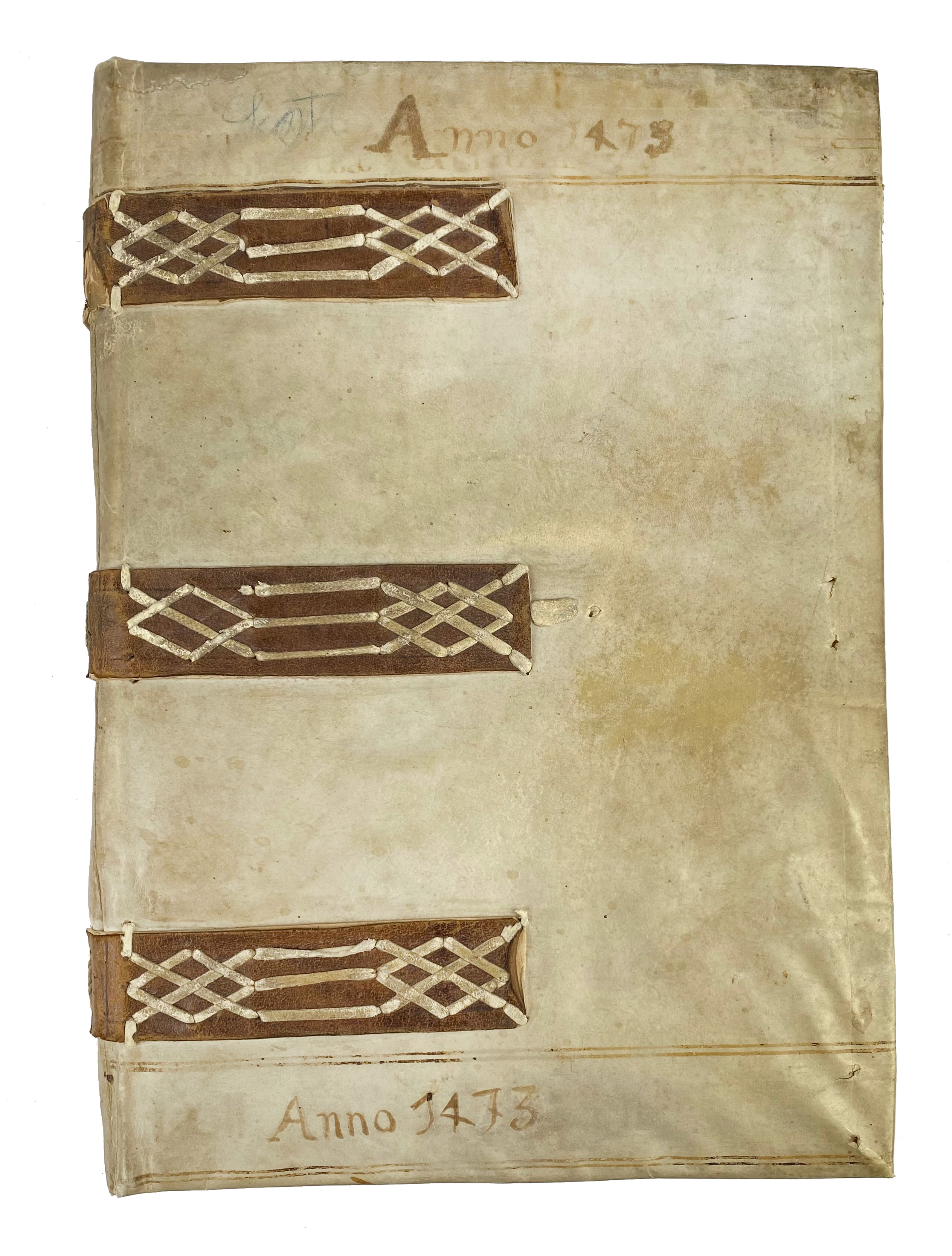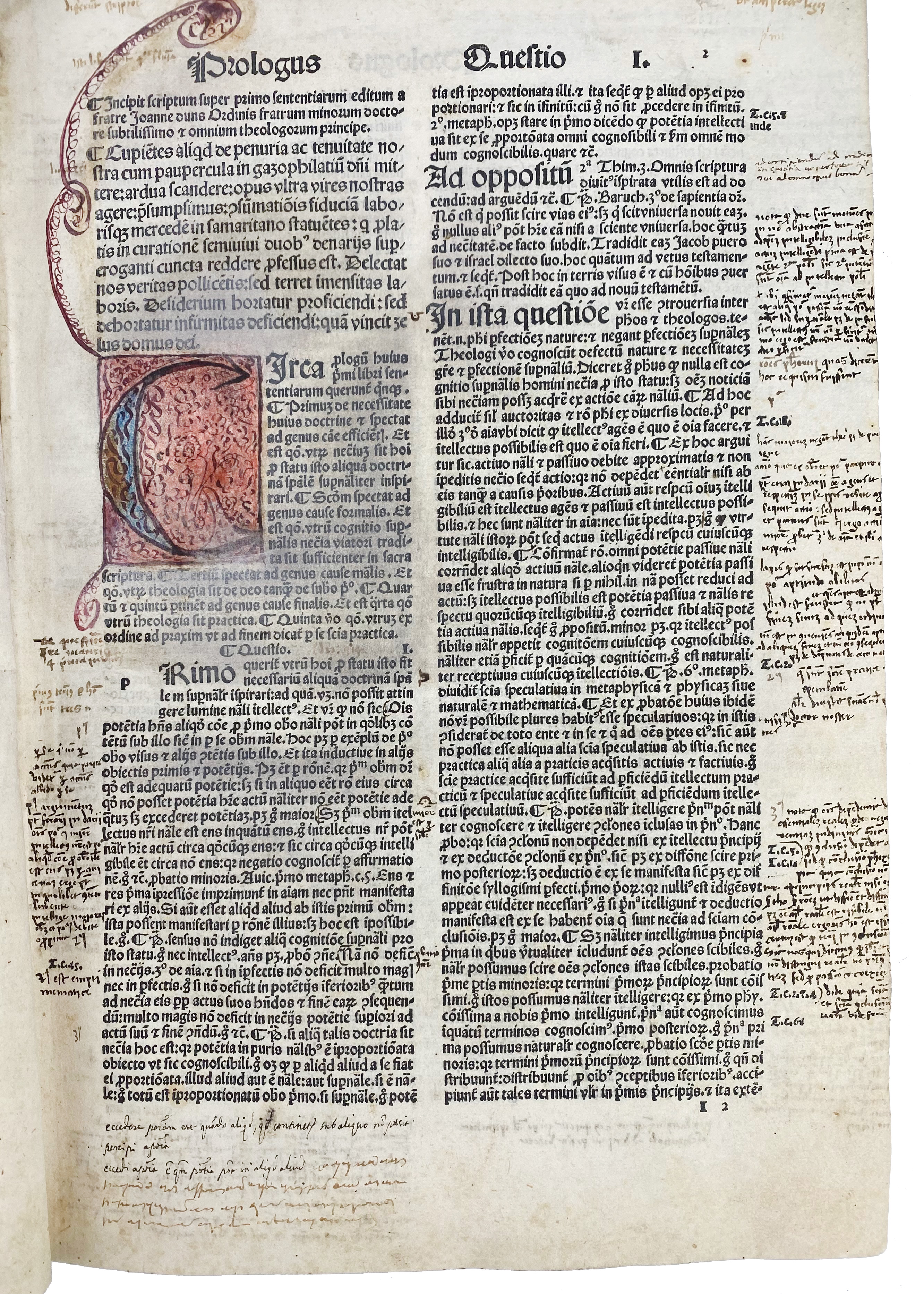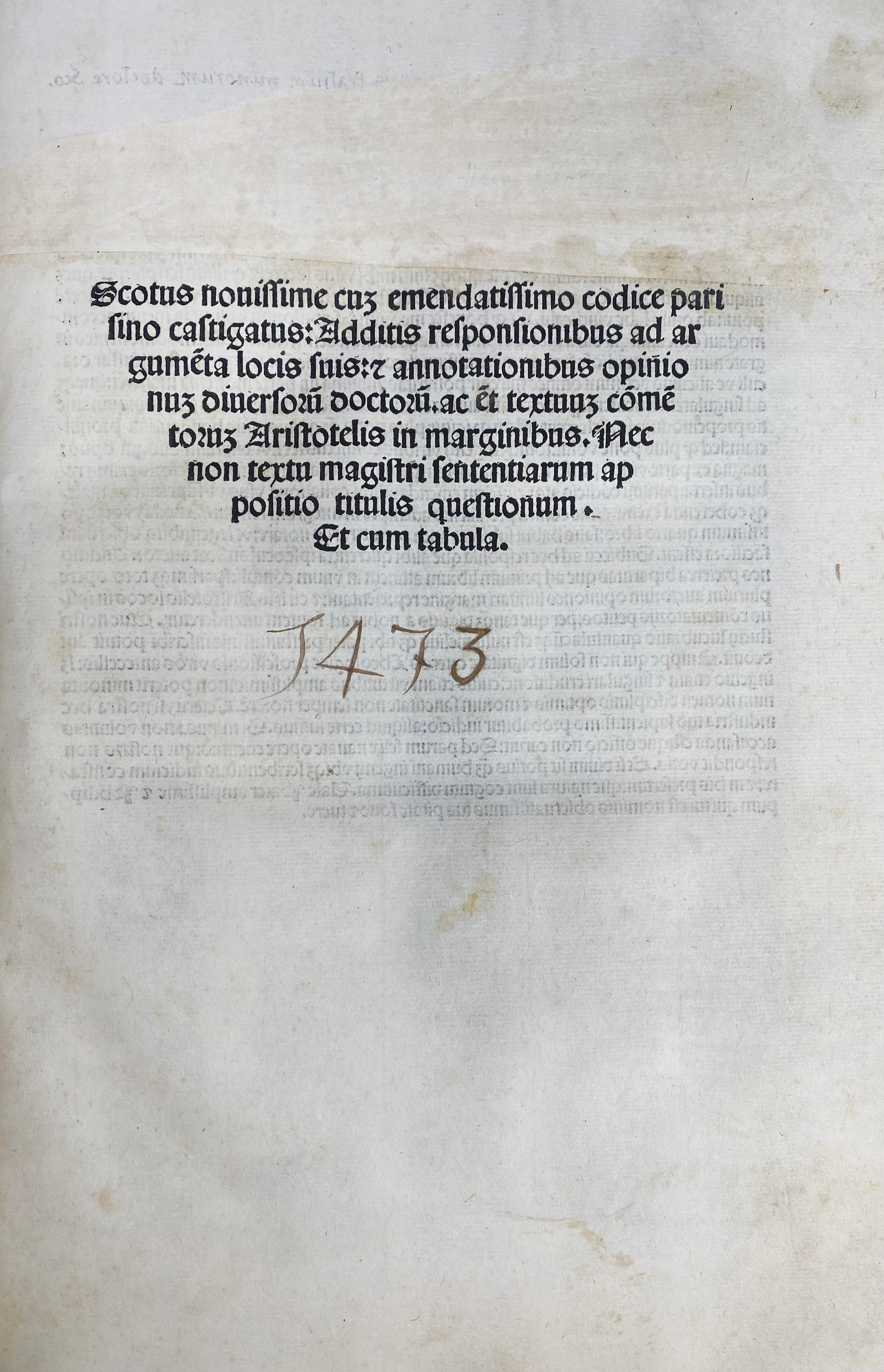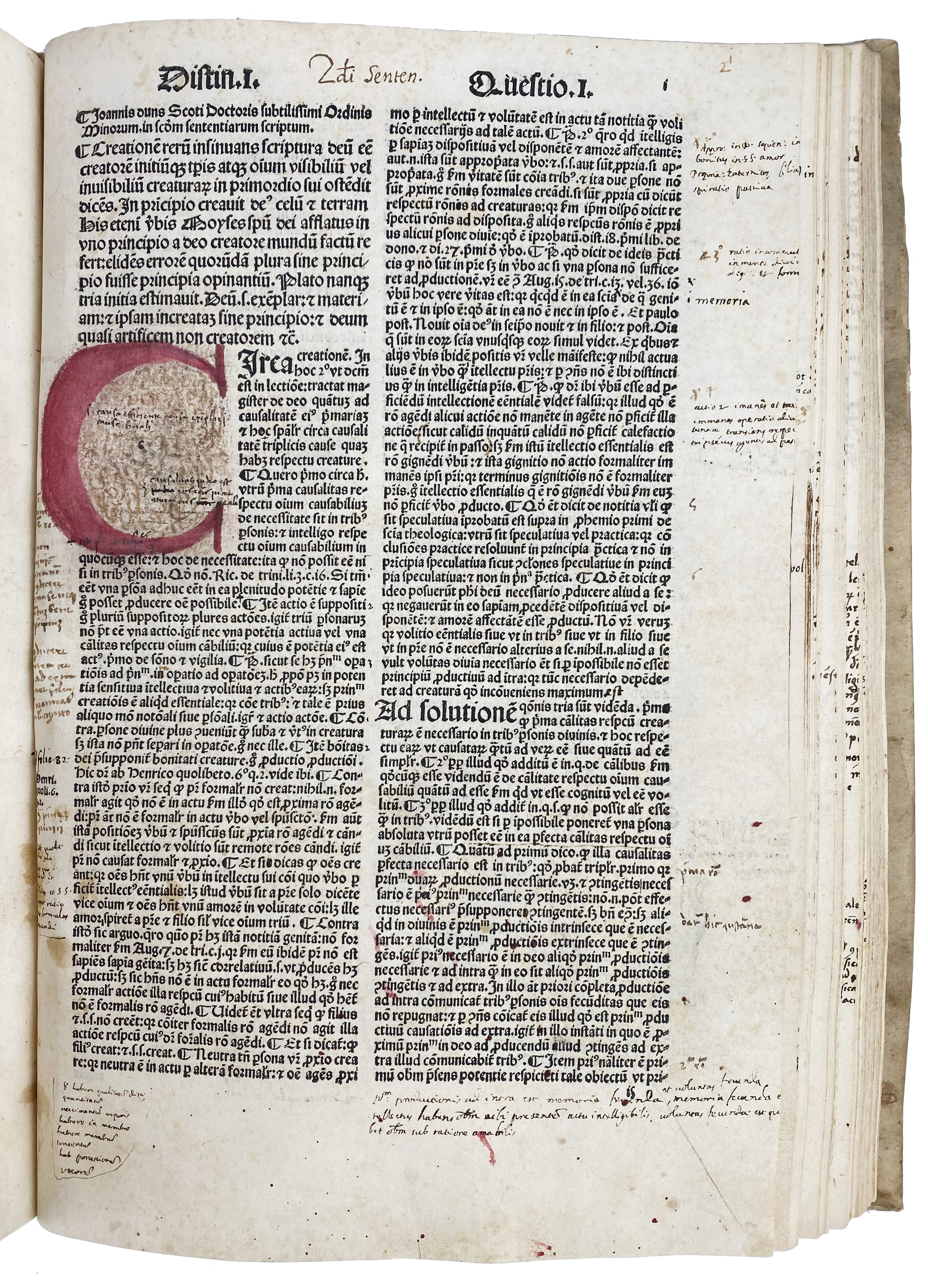 DUNS SCOTUS, J. Scotus nouissime cum emendatissimo codice Parisino castigatus. (…) ac etiam textuum commentorum Aristotelis in marginibus. (Tom. 1-2). (Quaestiones in quattuor libros Sententiarum). (Venice, B. Vercellencis for A. Torresano, 1503). 2-28, 138, 84 pp. W. sev. (clumsily) cold. initials. Fol. Charming 16th c. Italian vellum ledger binding reinforced with three characteristic leather straps with parchment lacing. (Some laces in places a bit loose, the cover is erroneously inscribed "1473", first leaf of 'Tabula Scotus' lacks, without parts 3 and 4, cold. initials a bit run out, num. marg. annot. for the greater part in an old hand, sev. marg. repairs: upper margin ti. vol. 1 replaced w. loss of text on v°).