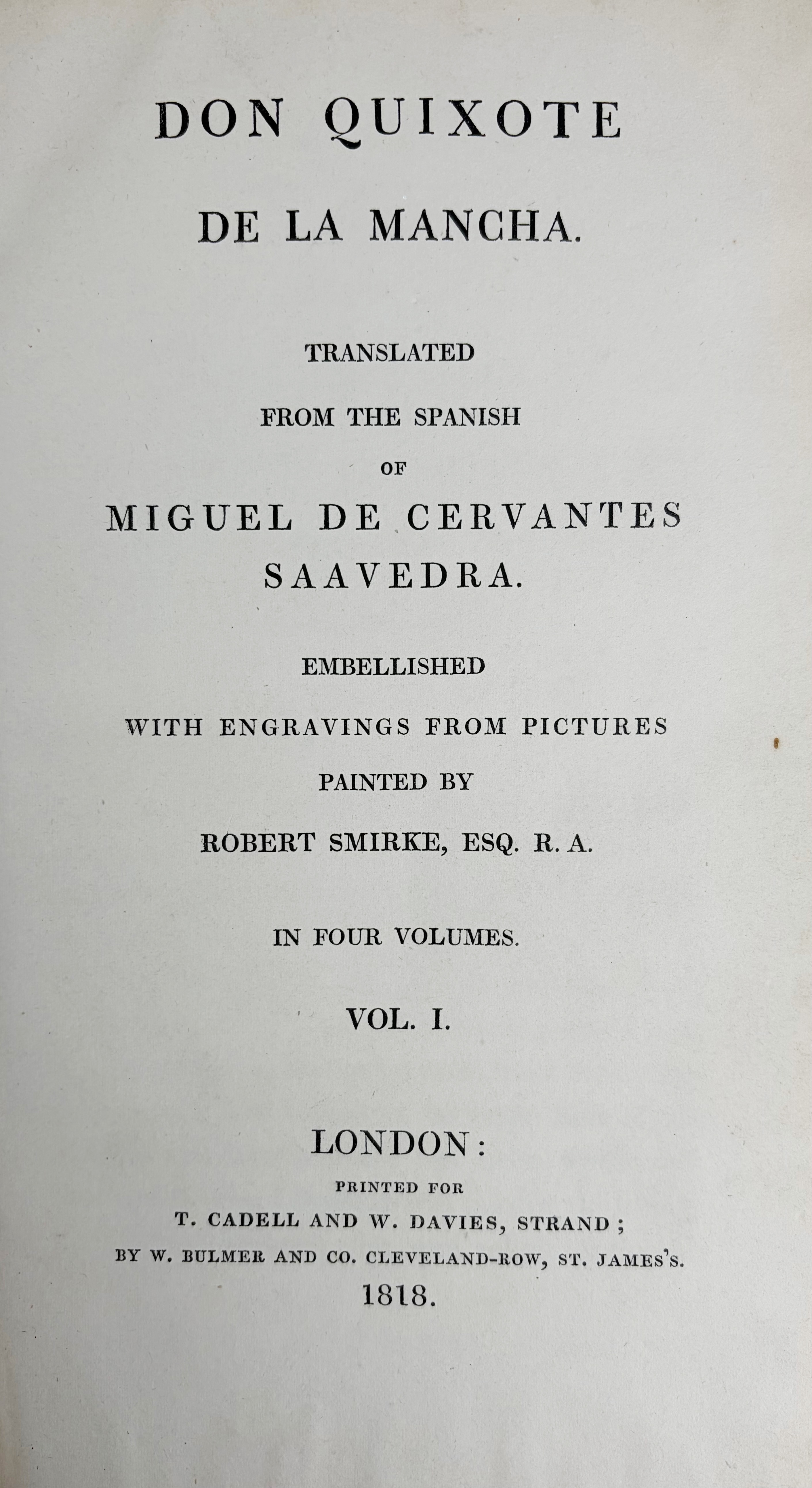 DON QUICHOT -- CERVANTES SA(A)VEDRA, M. de. Don Quixote de la Mancha. Transl. from the Spanish. Lond., 1818. 4 vols. (4), 2, lxxxiv, 409; (8), 395; (8), xiii, 432; (4), vi, 508 pp. W. num. engr. vign. & 48 engr. plates after paintings by Robert Smirke. Fine cont. english blind tooled & gilt dec. cf., inside dentelles, a.e.g. (Professionally rebacked in fine matching cf., some foxing in places).
